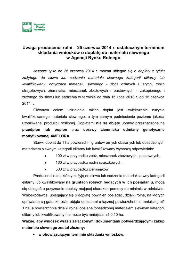 Uwaga producenci rolni – 25 czerwca 2014 r. ostatecznym terminem składania wniosków o dopłatę do materiału siewnego w Agencji Rynku Rolnego. Jeszcze tylko do 25 czerwca 2014 r. można ubiegać się o dopłaty z tytułu zużytego do siewu lub sadzenia materiału siewnego kategorii elitarny lub kwalifikowany, dotyczące materiału siewnego - zbóż ozimych i jarych, roślin strączkowych, ziemniaka, mieszanek zbożowych i pastewnych - zakupionego i zużytego do siewu lub sadzenia w terminie od dnia 15 lipca 2013 r. do 15 czerwca 2014 r. Głównym celem udzielania takich dopłat jest zwiększenie zużycia kwalifikowanego materiału siewnego, a tym samym podniesienie poziomu jakości uzyskiwanej produkcji roślinnej. Dopłatami nie są objęte uprawy przeznaczone na przedplon lub poplon oraz uprawy ziemniaka odmiany genetycznie modyfikowanej AMFLORA. Stawki dopłat do 1 ha powierzchni gruntów ornych obsianych lub obsadzonych materiałem siewnym kategorii elitarny lub kwalifikowany wynoszą odpowiednio: 100 zł w przypadku zbóż, mieszanek zbożowych i pastewnych, 160 zł w przypadku roślin strączkowych, 500 zł w przypadku ziemniaków. Producenci rolni, którzy zużyją do siewu lub sadzenia materiał siewny kategorii elitarny lub kwalifikowany na gruntach rolnych będących w ich posiadaniu, mogą się ubiegać o przyznanie dopłaty mającej charakter pomocy de minimis w rolnictwie. Wnioskodawca, ubiegający się o dopłatę powinien posiadać, działki rolne, na których uprawiane są gatunki roślin objęte dopłatami o łącznej powierzchni nie mniejszej niż 1 ha, a powierzchnia działki rolnej obsianej/obsadzonej materiałem siewnym kategorii elitarny lub kwalifikowany nie może być mniejsza niż 0,10 ha. Ważne, aby wniosek wraz z załączonymi dokumentami potwierdzającymi zakup materiału siewnego został złożony: w obowiązującym terminie składania wniosków, na aktualnym formularzu wraz z wymaganymi załącznikami, po faktycznym zużyciu do siewu lub sadzenia kwalifikowanego materiału siewnego. Pod adresem https://elf.arr.gov.pl/ dostępna jest bezpłatna aplikacja „ELF”, służąca do wypełniania i drukowania wniosku o przyznanie ww. dopłaty. Należy pamiętać, że bez względu na formę i cel pomocy otrzymanej w ramach pomocy de minimis w rolnictwie, całkowita kwota tej pomocy nie może przekroczyć 15 000 euro dla producenta rolnego w okresie trzech lat obrotowych, przy czym jeśli producent rolny jest powiązany osobowo lub kapitałowo z innym/i podmiotem/ami to limit 15 000 euro należy odnieść do „jednego przedsiębiorstwa” w rozumieniu art. 2 ust. 2 rozporządzenia Komisji (UE) nr 1408/2013. Poprawnie wypełniony formularz wniosku o przyznanie dopłaty wraz z wymaganymi załącznikami, należy dostarczyć osobiście lub przesyłką pocztową na adres Oddziału Terenowego ARR w Gorzowie Wlkp., ul. Sikorskiego 20 66-400 Gorzów Wlkp., tel 95 728 26 58; 95 720 87 74, www.arr.gov.pl Serdecznie zapraszamy Producentów Rolnych do skorzystania z tej formy dofinansowania!!! Agencja Rynku Rolnego Oddział Terenowy w Gorzowie Wlkp.