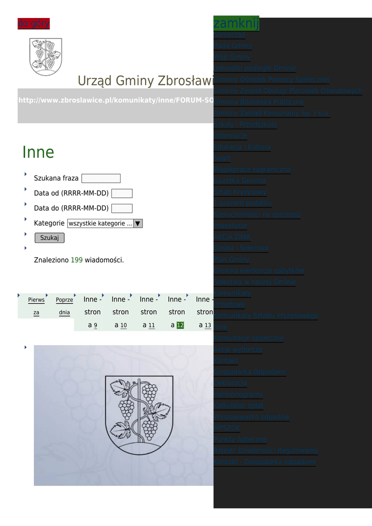 zamknij do góry Samorząd Rada Gminy Wójt Gminy Jednostki podległe Gminie Gminny Ośrodek Pomocy Społecznej Urząd Gminy Zbrosławice Gminny Zespół Obsługi Placówek Oświatowych http://www.zbroslawice.pl/komunikaty/inne/FORUM-SOLTYSOW-WOJEWODZTWA-SLASKIEGO/ Gminna Biblioteka Publiczna Gminny Zakład Komunalny printpdf/st:12 Sp. z o.o. Szkoły i Przedszkola Informacje Inne Edukacja i Kultura Sport Współpraca zagraniczna Szukana fraza Gazetka Gminna Data od (RRRR-MM-DD) Sztab Kryzysowy 1 procent podatku Data do (RRRR-MM-DD) Nieruchomości na sprzedaż Kategorie wszystkie kategorie ... ▼ Inwestycje AKCJA ZIMA Szukaj Gmina i Sołectwa Plan Gminy Znaleziono 199 wiadomości. Gminna ewidencja zabytków Sołectwa w naszej Gminie Pierws Poprze Inne - Inne - Inne - Inne - za dnia stron stron stron stron a9 a 10 a 11 a 12 Komunikaty Inne - Inne - Inne - Następ Ostatni Urzędowe stron stron stron na a Komunikaty Sztabu kryzysowego a 13 Innea 14 a 15 Konsultacje społeczne Akcje wyborcze Kontakt Gospodarka Odpadami Deklaracja Harmonogramy Kalkulator opłat Wyszukiwarka odpadów MPSZOK Punkty Apteczne Rejestr Działalności Regulowanej Kontakt - Gospodarka odpadami 24 LIP 2012 Zaproszenie do opracowania programów zdrowotnych kategoria: Inne Urząd Gminy Zbrosławice zaprasza wszystkich zainteresowanych do opracowania następujących programów zdrowotnych: profilaktyka raka piersi, badanie wykrywające boleriozę, badanie gruczołu krokowego u mężczyzn (badanie prostaty). W/w programy należy opracować zgodnie z ustawą o świadczeniach opieki zdrowotnej finansowanej ze środków publicznych ( Dz. U. z 2008 r., Nr 164, poz. 1027 ) oraz muszą spełniać kryteria zawarte 16 LIP 2012 kategoria: Zmiana rozkładów jazdy MZKP Inne W związku ze Świętem Wniebowzięcia NMP w dniu 15.08.2012 r. komunikacja miejska MZKP będzie funkcjonować wg rozkładów jazdy obowiązujących w niedziele i święta bez obsługi centrów handlowych. W dniach 16 - 17.08.2012 r. autobusy kursować będą wg rozkładu jazdy na soboty ( linia nr 129 obsługiwana będzie taborem przegubowym), odstępstwem od tej reguły będą linie nr 17,80,179,180,225,246,288,625,738, które będą kursować 09 LIP 2012 Rolnicy - zgłaszajcie szkody spowodowane siłą wyższą! 06 LIP 2012 Uwaga upał, pomóż zwierzętom! 06 LIP 2012 IFUBA 2012 i NATUR & WEIN kategoria: Inne Tradycją stały się już spotkania młodych piłkarzy z zaprzyjaźnionych gmin partnerskich. W tym roku gospodarzem Międzynarodowego Turnieju Piłki Nożnej IFUBA 2012 była gmina Brackenheim. 14 czerwca do malowniczej, otoczonej winnicami miejscowości zjechała się młodzież z Francji, Włoch, Walii i Polski. Po uroczystym powitaniu i zakwaterowaniu sportowcy przystąpili do treningów, by już następnego dnia wziąć udział w 11 CZE 2012 kategoria: ODBIÓR WYNIKÓW Z MAMMOGRAFII Inne Wyniki z badań mammograficznych wykonanych w mammobusie w dniach 31 maja oraz 1 i 4 czerwca br. przy Urzędzie Gminy Zbrosławice będą do osobistego odbioru od 20 CZERWCA do 11 LIPCA br. w Urzędzie Gminy Zbrosławice -pokój nr 7 (Zbrosławice, ul. Oświęcimska 2) od poniedzialku do piątku, w godzinach od 8.00 do 14.00 Wyniki będą wydawane tylko do 11 lipca 2012r. Kobiety, które nie mogą odebrać wyników osobiście, powinny 04 CZE 2012 Wieś w fotografii kategoria: Inne Rusza konkurs fotograficzny „Wieś województwa śląskiego okiem obiektywu" Zarząd Województwa Śląskiego wraz Sekretariatem Regionalnym Krajowej Sieci Obszarów Wiejskich zapraszają do udziału w konkursie fotograficznym. Jego głównym tematem jest wieś i zmiany na niej przebiegające, jej walory kulturowe i przyrodnicze, a także osiągnięcia w rozwoju. O laury mogą rywalizować osoby, które amatorsko lub profesjonalnie zajmują 30 MAJ 2012 kategoria: Wojewódzki Ośrodek Koordynujący Inne Populacyjne Programy Wczesnego Wykrywania Raka Piersi i Szyjki Macicy pod hasłem „Gdzie się badać" podaje adresy i telefony śląskich przychodni , które wykonują bezpłatne badania profilaktyczne w ramach umów podpisanych z Narodowym Funduszem Zdrowia. Populacyjny Program Wczesnego Wykrywania Raka Piersi www.raksutka.org e-mail: [email protected] tel. 32 278 96 73 Populacyjny Program Profilaktyki i Wczesnego 29 MAJ 2012 Czy znasz działanie i korzystasz z kanałów RSS - posumowanie kategoria: Inne Podsumowanie ankiety o kanale RSS na stronie urzędu. Prawie połowa głosujących chciałaby się dowiedzieć co to takiego - najprościej mówiąc: Kanał RSS to sposób informowania użytkowników o nowych informacjach umieszczonych na stronie internetowej. Nie trzeba "wchodzić" na stronę i sprawdzać czy może ktoś coś tam umieścił. Zatrudniamy do tego czytnik kanałów RSS - prosty program, który co kilka minut w tle sprawdza 22 MAJ 2012 Niespasowani zapraszają na spektakl - Kalejdoskop uczuć Pierws Poprze Inne - Inne - Inne - Inne - Inne - Inne - Inne - Następ Ostatni za dnia stron stron stron stron stron stron stron na a a9 a 10 a 11 a a 13 a 14 a 15 12