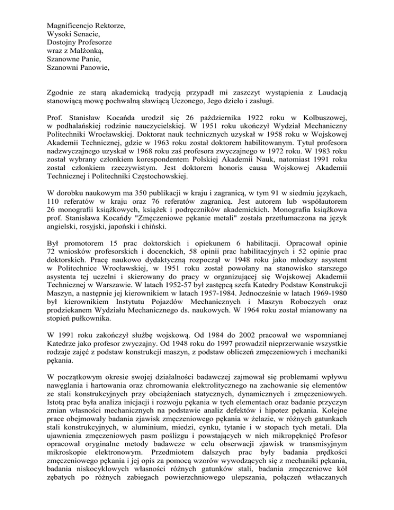 Magnificencjo Rektorze, Wysoki Senacie, Dostojny Profesorze wraz z Małżonką, Szanowne Panie, Szanowni Panowie, Zgodnie ze starą akademicką tradycją przypadł mi zaszczyt wystąpienia z Laudacją stanowiącą mowę pochwalną sławiącą Uczonego, Jego dzieło i zasługi. Prof. Stanisław Kocańda urodził się 26 października 1922 roku w Kolbuszowej, w podhalańskiej rodzinie nauczycielskiej. W 1951 roku ukończył Wydział Mechaniczny Politechniki Wrocławskiej. Doktorat nauk technicznych uzyskał w 1958 roku w Wojskowej Akademii Technicznej, gdzie w 1963 roku został doktorem habilitowanym. Tytuł profesora nadzwyczajnego uzyskał w 1968 roku zaś profesora zwyczajnego w 1972 roku. W 1983 roku został wybrany członkiem korespondentem Polskiej Akademii Nauk, natomiast 1991 roku został członkiem rzeczywistym. Jest doktorem honoris causa Wojskowej Akademii Technicznej i Politechniki Częstochowskiej. W dorobku naukowym ma 350 publikacji w kraju i zagranicą, w tym 91 w siedmiu językach, 110 referatów w kraju oraz 76 referatów zagranicą. Jest autorem lub współautorem 26 monografii książkowych, książek i podręczników akademickich. Monografia książkowa prof. Stanisława Kocańdy "Zmęczeniowe pękanie metali" została przetłumaczona na język angielski, rosyjski, japoński i chiński. Był promotorem 15 prac doktorskich i opiekunem 6 habilitacji. Opracował opinie 72 wniosków profesorskich i docenckich, 58 opinii prac habilitacyjnych i 52 opinie prac doktorskich. Pracę naukowo dydaktyczną rozpoczął w 1948 roku jako młodszy asystent w Politechnice Wrocławskiej, w 1951 roku został powołany na stanowisko starszego asystenta tej uczelni i skierowany do pracy w organizującej się Wojskowej Akademii Technicznej w Warszawie. W latach 1952-57 był zastępcą szefa Katedry Podstaw Konstrukcji Maszyn, a następnie jej kierownikiem w latach 1957-1984. Jednocześnie w latach 1969-1980 był kierownikiem Instytutu Pojazdów Mechanicznych i Maszyn Roboczych oraz prodziekanem Wydziału Mechanicznego ds. naukowych. W 1964 roku został mianowany na stopień pułkownika. W 1991 roku zakończył służbę wojskową. Od 1984 do 2002 pracował we wspomnianej Katedrze jako profesor zwyczajny. Od 1948 roku do 1997 prowadził nieprzerwanie wszystkie rodzaje zajęć z podstaw konstrukcji maszyn, z podstaw obliczeń zmęczeniowych i mechaniki pękania. W początkowym okresie swojej działalności badawczej zajmował się problemami wpływu nawęglania i hartowania oraz chromowania elektrolitycznego na zachowanie się elementów ze stali konstrukcyjnych przy obciążeniach statycznych, dynamicznych i zmęczeniowych. Istotą prac była analiza inicjacji i rozwoju pękania w tych elementach oraz badanie przyczyn zmian własności mechanicznych na podstawie analiz defektów i hipotez pękania. Kolejne prace obejmowały badania zjawisk zmęczeniowego pękania w żelazie, w różnych gatunkach stali konstrukcyjnych, w aluminium, miedzi, cynku, tytanie i w stopach tych metali. Dla ujawnienia zmęczeniowych pasm poślizgu i powstających w nich mikropęknięć Profesor opracował oryginalne metody badawcze w celu obserwacji zjawisk w transmisyjnym mikroskopie elektronowym. Przedmiotem dalszych prac były badania prędkości zmęczeniowego pękania i jej opis za pomocą wzorów wywodzących się z mechaniki pękania, badania niskocyklowych własności różnych gatunków stali, badania zmęczeniowe kół zębatych po różnych zabiegach powierzchniowego ulepszania, połączeń wtłaczanych i połączeń z pierścieniami stożkowymi oraz łożysk tocznych. Równocześnie rozwijał elektronooptyczne badania powierzchni pęknięć. Ujawnione tą metodą szczególne cechy przełomów pozwoliły analizować mechanizmy i przebieg pękania i rekonstruować historię obciążenia. Obszerna grupa badań stanowi prace doświadczalne i teoretyczne dotyczące własności zmęczeniowych i prędkości pękania w laserowo napromieniowanych elementach. Kolejne również obszerne badania dotyczą powstawania i rozwoju krótkich pęknięć w elementach ze stali, w tym także po obróbce laserowej i z plastycznie wzmocnioną warstwą wierzchnią oraz w lotniczych stopach tytanu i aluminium. Szczególny obszar badań stanowią probabilistyczne opisy rozwoju pęknięć zmęczeniowych oraz przewidywanie trwałości zmęczeniowej różnych układów konstrukcyjnych, w tym statków latających. Opracowano cztery doświadczalnie zweryfikowane probabilistyczne opisy krótkich i długich pęknięć zmęczeniowych. Fizyczną podstawą modeli jest losowość przebiegu pękania zdefiniowana funkcją rozkładu Weibulla lub opis prędkości pękania poprzez wielkości liniowej mechaniki pękania. Dynamikę narastania procesu zmęczeniowego pękania opisano równaniem różniczkowym cząstkowym drugiego rzędu typu Fokkera-Plancka. Modele obliczeniowe zostały doświadczalnie zweryfikowane dla pęknięć rozwijających się w elementach z karbem i bez karbu wykonanych ze stali węglowej i ze stopu tytanu. Doświadczalne sprawdzenie poprawności opisów objęło również laserowo hartowane i kulowane elementy ze stali o średniej zawartości węgla. Przez pięć kadencji Profesor Stanisław Kocańda był wybieralnym członkiem Centralnej Komisji Kwalifikacyjnej ds. Kadr Naukowych, a następnie Centralnej Komisji ds. Tytułu Naukowego i Stopni Naukowych przy Prezesie Rady Ministrów RP. W latach 1990-93 był członkiem Prezydium tej Komisji. Był i jest członkiem komitetów naukowych i współorganizatorem wielu konferencji, szkól naukowych i kongresów międzynarodowych w kraju i za granicą. Jest członkiem Komitetu Budowy Maszyn PAN i Komitetu Mechaniki PAN. Był członkiem Komitetu Nauki o Materiałach PAN i członkiem Sekcji Fizyki Metali Komitetu Hutnictwa PAN. Był organizatorem i przewodniczącym Międzysekcyjnych Zespołów Zmęczenia i Mechaniki Pękania Materiałów i Konstrukcji PAN. Jest honorowym przewodniczą
