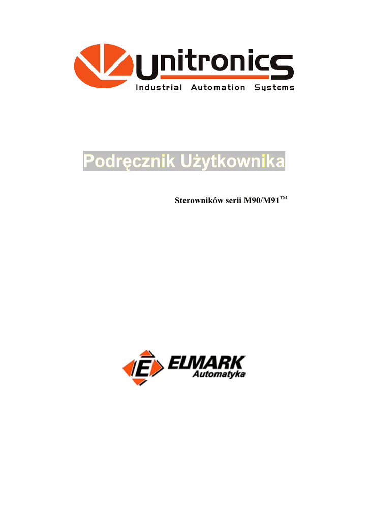 Podręcznik Użytkownika Sterowników serii M90/M91TM SPIS TREŚCI Rozdział 1: Wstęp 3 Rozdział 2: Montowanie Rozdział 3: Wejścia Sterownika 4 i Wyjścia Sterownika 6 Rozdział 4: Komunikacja 13 Rozdział 5: Zmienne 18 Systemowe Dane Techniczne 21 2 Rozdział 1: WSTĘP Mikrosterownik OPLC M90/M91 M90/M91 należy do grupy mikrosterowników OPLC - sterowników z wbudowanym panelem operatorskim (ang. Operating Panel + Programable Logic Controler). Przeznaczony jest do automatyzacji niewielkich obiektów, zarówno w zastosowaniach przemysłowych jak i domowych. Może być stosowany do sterowania maszynami technologicznymi i produkcyjnymi, przenośnikami, liniami pakującymi, piecami, urządzeniami klimatyzacyjnymi, pompami. Seria M90/M91 dostępna jest w kilku konfiguracjach sprzętowych różniących się ilością i rodzajem wejść i wyjść (szczegółowe dane techniczne dołączane są do każdego ze sterowników również na płycie CD). Rys.1 Schemat funkcjonalny sterownika OPLC Standardowo zawiera port komunikacyjny RS 232, zegar czasu rzeczywistego, opcjonalnie - port magistrali CAN. Mikrosterownik może być rozbudowany dodatkowo o 64 wejścia/wyjścia dwustanowe, analogowe, termoparowe, wagowe lub rezystancyjne PT100. Sterownik posiada Panel Operatorski HMI (Human Machine Interface). HMI zawiera 16 lub 32 (2 linie na 16 znaków – seria M91) znakowy wyświetlacz do pokazywania parametrów procesu i komunikatów oraz 15 przyciskową, membranową klawiaturę umożliwiającą nawigację po wyświetlaczu i wprowadzanie danych. Sterownik umożliwia również zdalną komunikację z operatorem za pośrednictwem telefonu GSM i komunikatów SMS. Ponadto w sterownikach serii M91 (dwulinijkowych) jest możliwość komunikacji po protokole MODBUS. Sterownik jest sprzedawany wraz z programem narzędziowym U90-Ladder pracującym w środowisku Windows. Sterownik może być montowany jako panel lub na szynie DIN. 3 Rozdział 2: Montowanie sterownika Przed przystąpieniem do prac montażowych należy się upewnić czy w dostarczonym pakiecie sterownika nie brakuje elementów. Standardowo pakiet powinien zawierać właściwą wersję sterownika, dwie listwy zaciskowe oraz dwa uchwyty montażowe wraz z wkrętami. Elementy te pokazano na rysunku 2. Oprócz tego pakiet powinien zawierać uszczelkę z neoprenu, płytę CD-ROM z oprogramowaniem U90 Ladder oraz przewód połączeniowy. Rys. 2 Standardowe wyposażenie sterownika Zalecenia dotyczące bezpieczeństwa Sterownika nie należy montować w miejscach, w których występuje nadmierne zapylenie, wilgoć lub deszcz, nagromadzenie gazów łatwopalnych lub korozyjnych, wysoka temperatura, nadmierne wibracje. Należy chronić przed dostaniem się do jego wnętrza wody. Przed włączeniem sterownika należy sprawdzić poprawność okablowania. Nie pozostawiać odizolowanych przewodów. Montować w jak największej odległości od przewodów i urządzeń zasilanych wysokimi napięciami. Celem zapewnienia właściwej wentylacji pozostawić minimalnie 10 mm wolnego miejsca nad i pod obudową sterownika. Montaż Mikrosterownik M90 może być montowany na panelu lub na szynie DIN. Montaż panelowy Grubość panelu nie powinna przekraczać 5 mm. 4 1. Wycięcie w panelu powinno mieć wymiary 92 x 92 mm. 2. Przed wmontowaniem sterownika należy założyć prostokątną, gumową uszczelkę. Uszczelka powinna ściśle dolegać do obrzeża obudowy sterownika. 3. Wsunąć sterownik w przygotowany w panelu otwór. 4. Założyć uchwyty mocujące jak rysunku 2. Uchwyty muszą być wpasowane w otwory w obudowie sterownika. 5. Przymocować sterownik wkrętami, rysunek 3. 89.2mm 5mm(max) 6.2mm 64mm Rys. 3 Montaż panelowy sterownika M90 Montaż na szynie DIN Sterownik należy „zatrzasnąć” na szynie DIN tak jak pokazano na rysunku 4. 64mm 3.5mm Rys. 4 Sposób montażu sterownika na szynie DIN 1 abc 2 def 3 ghi 4 jkl 5 mno 6 prs 7 tuv 8 wxy 9 i 96mm qz- 35mm M-90 +/- . sym 0 OPLC 96mm Rys. 5 Prawidłowo zamontowany sterownik 5 Rozdział 3: WEJŚCIA I WYJŚCIA STEROWNIKA W rozdziale tym zawarte są informacje dotyczące wejść i wyjść sterownika. Schematy podłączeniowe wybranych wersji sterownika znajdują się na końcu rozdziału, natomiast szczegółowy opis dostarczany jest wraz ze sterownikiem jak również dostępny jest na płycie CD. Zalecenia: Przewody wejściowe i wyjściowe nie powinny przebiegać obok siebie np. w kablu wielożyłowym. Przewody sygnałowe nie powinny przebiegać w bliskim sąsiedztwie przewodów mocy. W przypadku stosowania dłuższych niż zalecane przewodów sygnałowych, należy uwzględnić ewentualne spadki napięcia oraz zakłócenia interferencyjne. Przed włączeniem zasilania sprawdź poprawność okablowania sterownika. Złącza: Sterownik M90 posiada dwie listwy zaciskowe – górną i dolną. Górna listwa umożliwia doprowadzenie do sterownika zasilania i sygnałów wejściowych (analogowych i dwustanowych oraz licznikowych). Dolna listwa służy do podłączenia sygnałów wyjściowych (analogowych lub dwustanowych). Sterownik M90 (oprócz wersji M90-19-B1A) jest wyposażony w port rozszerzeń (Expansion Port) umożliwiający dołączanie dodatkowych modułów wejść i wyjść. Niektóre wersje sterownika posiadają dodatkowo złącze magistrali CANbus. Górna listwa zaciskowa (wejscia i zasilanie) I0 I1 I2 I3 I4 I5 I6 I7 I8 I9 M-90 Port RS232 qz- 1 abc 2 def 3 ghi 4 jkl 5 mno 6 prs 7 tuv 8 wxy 9 Port CANbus i +/- . sym Port rozszerzeń 0 OPLC Dolna listwa zaciskowa (wyjścia) Rys. 6 Złącza sterownika M90 6 Okablowanie: 1. Zdjąć izolację z przewodu na odcinku 7 ± 0,5 mm. 2. Poluzować wkręty na listwie zaciskowej, tak aby możliwe było wprowadzenie przewodów. 3. Wprowadzić przewody do odpowiednich złącz w listwach. 4. Dokręcić wkręty na listwach zaciskowych. Specyfikacja przewodów podłączeniowych: Przewody sygnałowe powinny mieć grubość 26 – 12 AWG (0,13 mm2 – 3,31 mm2). Celem uniknięci
