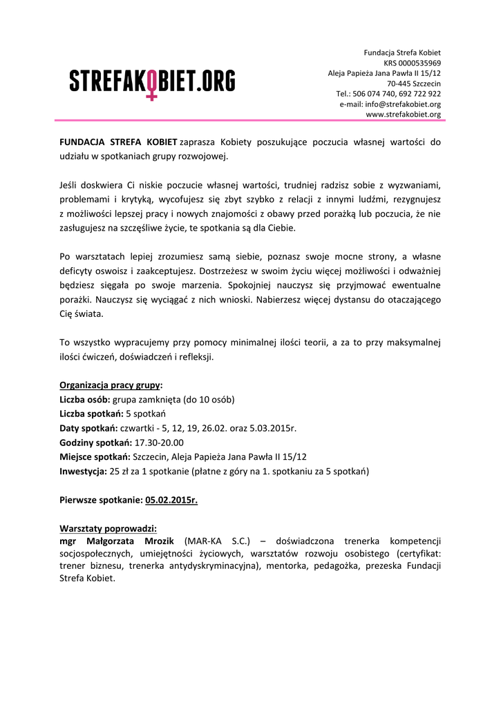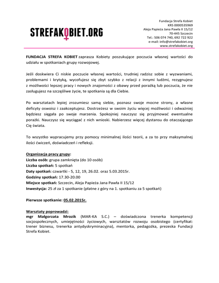 Fundacja Strefa Kobiet KRS 0000535969 Aleja Papieża Jana Pawła II 15/12 70-445 Szczecin Tel.: 506 074 740, 692 722 922 e-mail: [email protected] www.strefakobiet.org FUNDACJA STREFA KOBIET zaprasza Kobiety poszukujące poczucia własnej wartości do udziału w spotkaniach grupy rozwojowej. Jeśli doskwiera Ci niskie poczucie własnej wartości, trudniej radzisz sobie z wyzwaniami, problemami i krytyką, wycofujesz się zbyt szybko z relacji z innymi ludźmi, rezygnujesz z możliwości lepszej pracy i nowych znajomości z obawy przed porażką lub poczucia, że nie zasługujesz na szczęśliwe życie, te spotkania są dla Ciebie. Po warsztatach lepiej zrozumiesz samą siebie, poznasz swoje mocne strony, a własne deficyty oswoisz i zaakceptujesz. Dostrzeżesz w swoim życiu więcej możliwości i odważniej będziesz sięgała po swoje marzenia. Spokojniej nauczysz się przyjmować ewentualne porażki. Nauczysz się wyciągać z nich wnioski. Nabierzesz więcej dystansu do otaczającego Cię świata. To wszystko wypracujemy przy pomocy minimalnej ilości teorii, a za to przy maksymalnej ilości ćwiczeń, doświadczeń i refleksji. Organizacja pracy grupy: Liczba osób: grupa zamknięta (do 10 osób) Liczba spotkań: 5 spotkań Daty spotkań: czwartki - 5, 12, 19, 26.02. oraz 5.03.2015r. Godziny spotkań: 17.30-20.00 Miejsce spotkań: Szczecin, Aleja Papieża Jana Pawła II 15/12 Inwestycja: 25 zł za 1 spotkanie (płatne z góry na 1. spotkaniu za 5 spotkań) Pierwsze spotkanie: 05.02.2015r. Warsztaty poprowadzi: mgr Małgorzata Mrozik (MAR-KA S.C.) – doświadczona trenerka kompetencji socjospołecznych, umiejętności życiowych, warsztatów rozwoju osobistego (certyfikat: trener biznesu, trenerka antydyskryminacyjna), mentorka, pedagożka, prezeska Fundacji Strefa Kobiet.