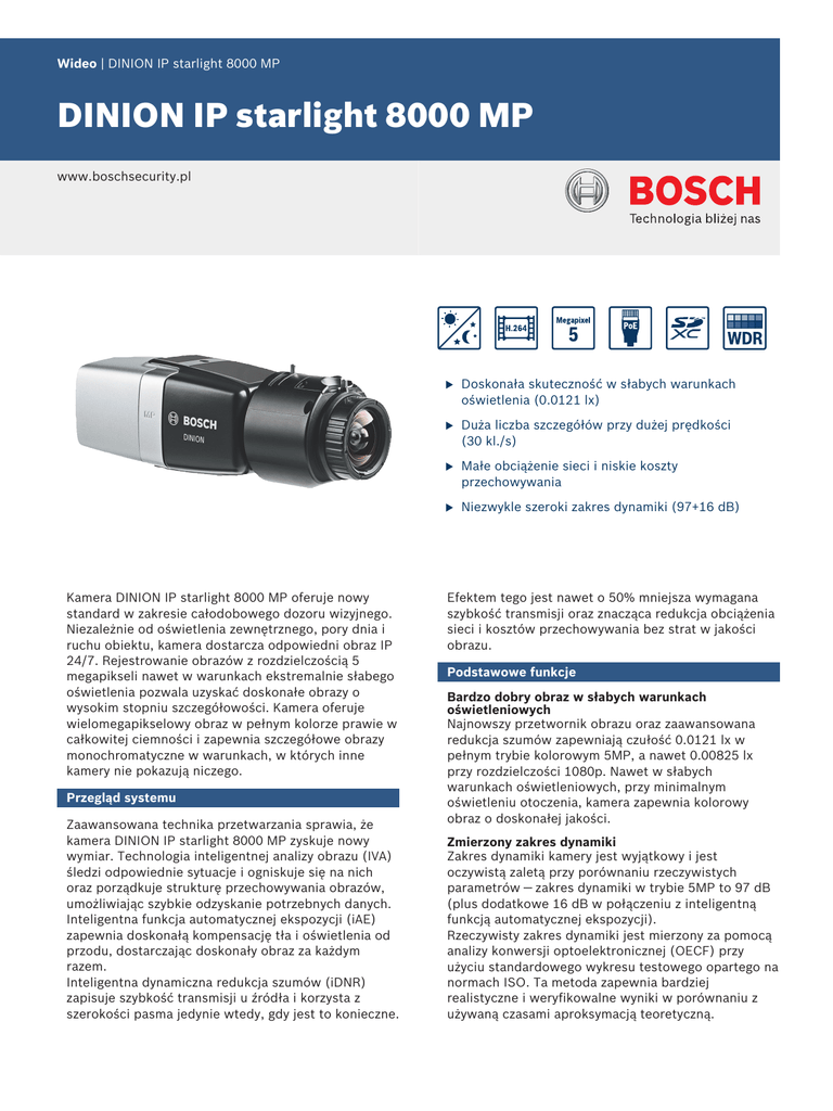 Wideo | DINION IP starlight 8000 MP DINION IP starlight 8000 MP www.boschsecurity.pl Kamera DINION IP starlight 8000 MP oferuje nowy standard w zakresie całodobowego dozoru wizyjnego. Niezależnie od oświetlenia zewnętrznego, pory dnia i ruchu obiektu, kamera dostarcza odpowiedni obraz IP 24/7. Rejestrowanie obrazów z rozdzielczością 5 megapikseli nawet w warunkach ekstremalnie słabego oświetlenia pozwala uzyskać doskonałe obrazy o wysokim stopniu szczegółowości. Kamera oferuje wielomegapikselowy obraz w pełnym kolorze prawie w całkowitej ciemności i zapewnia szczegółowe obrazy monochromatyczne w warunkach, w których inne kamery nie pokazują niczego. Przegląd systemu Zaawansowana technika przetwarzania sprawia, że kamera DINION IP starlight 8000 MP zyskuje nowy wymiar. Technologia inteligentnej analizy obrazu (IVA) śledzi odpowiednie sytuacje i ogniskuje się na nich oraz porządkuje strukturę przechowywania obrazów, umożliwiając szybkie odzyskanie potrzebnych danych. Inteligentna funkcja automatycznej ekspozycji (iAE) zapewnia doskonałą kompensację tła i oświetlenia od przodu, dostarczając doskonały obraz za każdym razem. Inteligentna dynamiczna redukcja szumów (iDNR) zapisuje szybkość transmisji u źródła i korzysta z szerokości pasma jedynie wtedy, gdy jest to konieczne. u Doskonała skuteczność w słabych warunkach oświetlenia (0.0121 lx) u Duża liczba szczegółów przy dużej prędkości (30 kl./s) u Małe obciążenie sieci i niskie koszty przechowywania u Niezwykle szeroki zakres dynamiki (97+16 dB) Efektem tego jest nawet o 50% mniejsza wymagana szybkość transmisji oraz znacząca redukcja obciążenia sieci i kosztów przechowywania bez strat w jakości obrazu. Podstawowe funkcje Bardzo dobry obraz w słabych warunkach oświetleniowych Najnowszy przetwornik obrazu oraz zaawansowana redukcja szumów zapewniają czułość 0.0121 lx w pełnym trybie kolorowym 5MP, a nawet 0.00825 lx przy rozdzielczości 1080p. Nawet w słabych warunkach oświetleniowych, przy minimalnym oświetleniu otoczenia, kamera zapewnia kolorowy obraz o doskonałej jakości. Zmierzony zakres dynamiki Zakres dynamiki kamery jest wyjątkowy i jest oczywistą zaletą przy porównaniu rzeczywistych parametrów — zakres dynamiki w trybie 5MP to 97 dB (plus dodatkowe 16 dB w połączeniu z inteligentną funkcją automatycznej ekspozycji). Rzeczywisty zakres dynamiki jest mierzony za pomocą analizy konwersji optoelektronicznej (OECF) przy użyciu standardowego wykresu testowego opartego na normach ISO. Ta metoda zapewnia bardziej realistyczne i weryfikowalne wyniki w porównaniu z używaną czasami aproksymacją teoretyczną. 2 | DINION IP starlight 8000 MP Inteligentna analiza obrazu Już po 20 min operator kamery może przeoczyć aż 90% tego, co widać na ekranie. Funkcja inteligentnej analizy obrazu (IVA) powiadamia użytkownika, kiedy zostanie wywołany uprzednio zdefiniowany alarm. Dzięki inteligentnemu połączeniu do 8 zasad IVA złożone zadania stają się łatwiejsze, a liczba fałszywych alarmów jest ograniczona do minimum. Funkcja IVA również porządkuje strukturę obrazów dzięki metadanym. Umożliwia to szybkie odzyskiwanie odpowiednich obrazów z wielogodzinnych nagrań. Metadane mogą także być użyteczne w dostarczaniu niepodważalnego materiału dowodowego oraz w optymalizacji procesów opartych na zliczaniu ludzi lub informacjach o gęstości tłumu. W przypadku funkcji IVA koncentrujemy się na powiadamianiu w razie potrzeby i pomocy w uzyskaniu odpowiednich danych. inteligentna funkcja automatycznej ekspozycji Zmiany oświetlenia z przodu i z tyłu mogą mieć negatywny wpływ na obrazy. Aby uzyskać doskonały obraz w każdej sytuacji, inteligentna funkcja automatycznej ekspozycji (iAE) dostosowuje ekspozycję kamery. Oferuje ona doskonałą kompensację oświetlenia z przodu i niezwykłą kompensację tła, automatycznie dostosowując te wartości do zmiennych warunków oświetlenia. W przypadku funkcji iAE naszym celem jest doskonała ekspozycja o każdej porze. Inteligentna dynamiczna redukcja szumów Spokojne sceny o małym ruchu lub bez ruchu wymagają mniejszej szybkości transmisji. Dzięki inteligentnemu odróżnianiu szumu od właściwych informacji funkcja dynamicznej redukcji szumów (iDNR) redukuje szybkość transmisji nawet o 50%. Ponieważ szum jest redukowany u źródła podczas rejestracji obrazu, niższa szybkość transmisji nie wpływa na jego jakość. Funkcja iDNR dostosowuje przestrzenną oraz czasową redukcję szumów (3DNR) na podstawie inteligentnej analizy zawartości sceny. Funkcja filtrowania przestrzennego kompensowanego ruchem (MCTF — motion compensated temporal filtering) ogranicza rozmycie związane zwykle ze standardowym filtrowaniem przestrzennym. Pozwala to zachować jakość obrazu przy szybko poruszających się obiektach, przy jednoczesnej optymalizacji szybkości transmisji. Nasz cel przy zastosowaniu funkcji iDNR to znaczne ograniczenie kosztów przechowywania i obciążenia sieci, dzięki wykorzystaniu szerokości pasma tylko wtedy, gdy jest to potrzebne. Kodowanie w oparciu o obszar Kodowanie w oparciu o obszar jest kolejną funkcją, która pozwala zmniejszyć wymaganą szerokość pasma. Istnieje możliwość ustawienia parametrów kompresji dla ośmiu obszarów programowanych przez użytkownika. Dzięki temu nieistotne fragmenty są efektywnie kompresowane, a większa szerokość pasma jest przydzielana ważnym elementom sceny. Zoptymalizowany profil szybkości transmisji W tabeli została przedstawiona średnia typowa zoptymalizowana szybkość transmisji w kb/s dla różnych częstotliwości odświeżania: kl./s 5MP (4:3) 5MP (16:9) 1080p 30 4950 4500 1600 25 4685 4259 1514 15 3941 3583 1274 10 3351 3046 1083 5 2342 2129 757 2 1009 917 326 Możliwość wyboru rozdzielczości i formatu obrazu Kamera charakteryzuje się trzema podstawowymi wariantami zastosowań, które można wybrać prz