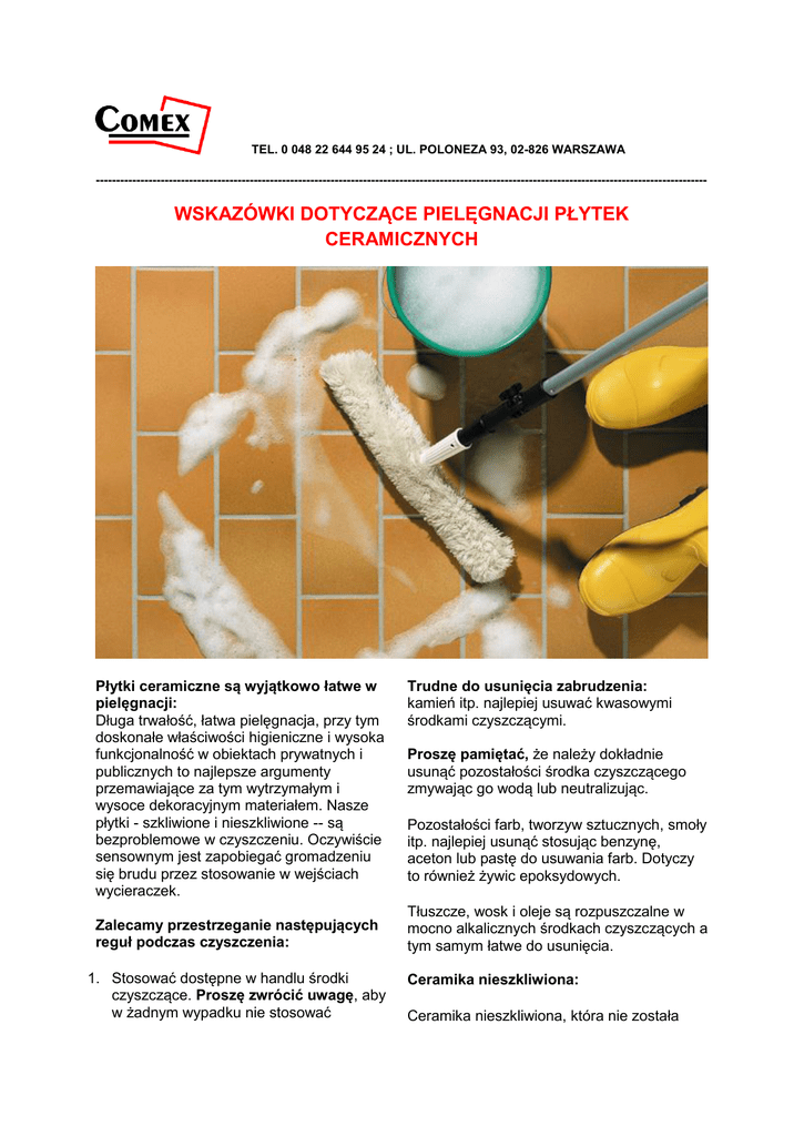 TEL. 0 048 22 644 95 24 ; UL. POLONEZA 93, 02-826 WARSZAWA ------------------------------------------------------------------------------------------------------------------------------------------------------- WSKAZÓWKI DOTYCZĄCE PIELĘGNACJI PŁYTEK CERAMICZNYCH Płytki ceramiczne są wyjątkowo łatwe w pielęgnacji: Długa trwałość, łatwa pielęgnacja, przy tym doskonałe właściwości higieniczne i wysoka funkcjonalność w obiektach prywatnych i publicznych to najlepsze argumenty przemawiające za tym wytrzymałym i wysoce dekoracyjnym materiałem. Nasze płytki - szkliwione i nieszkliwione -- są bezproblemowe w czyszczeniu. Oczywiście sensownym jest zapobiegać gromadzeniu się brudu przez stosowanie w wejściach wycieraczek. Zalecamy przestrzeganie następujących reguł podczas czyszczenia: 1. Stosować dostępne w handlu środki czyszczące. Proszę zwrócić uwagę, aby w żadnym wypadku nie stosować Trudne do usunięcia zabrudzenia: kamień itp. najlepiej usuwać kwasowymi środkami czyszczącymi. Proszę pamiętać, że należy dokładnie usunąć pozostałości środka czyszczącego zmywając go wodą lub neutralizując. Pozostałości farb, tworzyw sztucznych, smoły itp. najlepiej usunąć stosując benzynę, aceton lub pastę do usuwania farb. Dotyczy to również żywic epoksydowych. Tłuszcze, wosk i oleje są rozpuszczalne w mocno alkalicznych środkach czyszczących a tym samym łatwe do usunięcia. Ceramika nieszkliwiona: Ceramika nieszkliwiona, która nie została środków zawierających kwasy fluorowodorowe lub ich związki (fluorki). Związki te są agresywne dla ceramiki również w postaci bardzo rozcieńczonej. 2. Środek czyszczący po naniesieniu należy pozostawić na czas wniknięcia i rozpuszczenia zabrudzeń. 3. Należy czyścić przy pomocy szczotki lub ścierki. Nie wolno stosować gąbek lub szczotek z warstwą ścierną. 4. Rozpuszczony brud należy dokładnie zmyć wodą, zetrzeć lub zebrać. Pierwsze czyszczenie bezpośrednio po ułożeniu: Najpierw należy usunąć grube zabrudzenia a następnie dokładnie wyczyścić odpowiednim środkiem czyszczącym. Pozostałości po fugach cementowych należy usunąć przy pomocy kwasowych środków czyszczących, nazywanych zwykle w handlu preparatami do usuwania nalotów cementowych. Proszę pamiętać, że preparaty kwasowe są agresywne dla fug. Ich uszkodzeniu można zapobiec mocno je zwilżając przed czyszczeniem i i dokładnie zmywając czystą wodą po czyszczeniu. Zależnie od stopnia skoncentrowania konieczna może być neutralizacja. Normalne zabrudzenia usuwa się najlepiej środkami alkalicznymi lub neutralnymi. zaimpregnowana może ulec trwałemu zabrudzeniu bez możliwości jego dokładnego usunięcia. Ceramika nieszkliwiona o powierzchni nieulepszanej można zapobiegawczo impregnować jeśli przewiduje się możliwość wystąpienia zabrudzeń powierzchni tłuszczami lub olejami. Proszę pytać o odpowiednie środki w sklepach z płytkami ceramicznymi. Ceramika do specjalnych zastosowań: W naszym programie sprzedaży znajduje się szeroka paleta płytek antypoślizgowych szkliwionych i nieszkliwionych. Produkty te przeznaczone są do specjalnych zastosowań w obiektach przemysłowych, publicznych, strefach mokrych jak np. pływalnie, natryski, sauny, itd. Rozróżniamy w zależności od wykonania i zastosowania powierzchnie szorstkie i profilowane. Najbardziej efektywną metodą czyszczenia jest stosowanie maszyn ze szczotkami, urządzeń wysokociśnieniowych lub parowych. Nie wolno używać szczotek i ścierek zawierających środki ścierne, ponieważ może mieć to negatywny wpływ na antypoślizgowość powierzchni. Proszę zwrócić uwagę na to, że środki czyszczące i dezynfekujące należy dokładnie spłukać, ponieważ w przeciwnym razie powierzchnia pozostanie śliska. Zarówno do pierwszego jak też regularnego czyszczenia proponujemy używać alkalicznych środków czyszczących. W zależności od stopnia zabrudzenia można sporadycznie używać środków kwasowych. Czyszczenie obiektów przemysłowych, handlowych itp.: Jest ono konieczne w zależności od stopnia zabrudzenia. W przypadku szczególnie Firmy montujące płytki na pływalniach mają intensywnego ruchu należy czyścic swoją listę wypróbowanych środków wielokrotnie w ciągu dnia. Do utrzymania w czyszczących do okładzin ceramicznych. czystości wystarczają zwykle dostępne w handlu środki. Należy pamiętać, że środki z Także i my proponujemy stosować te środki do czyszczenia sprzedawanych przez nas dodatkiem substancji pielęgnujących, w płytek. szczególności tłuszczy, wosku i tworzyw sztucznych tworzą powłoki negatywnie wpływające na antypoślizgowość powierzchni i jej wygląd. COMEX sp. z o.o., ul. Poloneza 93, 02-826 Warszawa, tel. 0 048 22 644 95 24, e-mail: [email protected]; www.comex.waw.pl