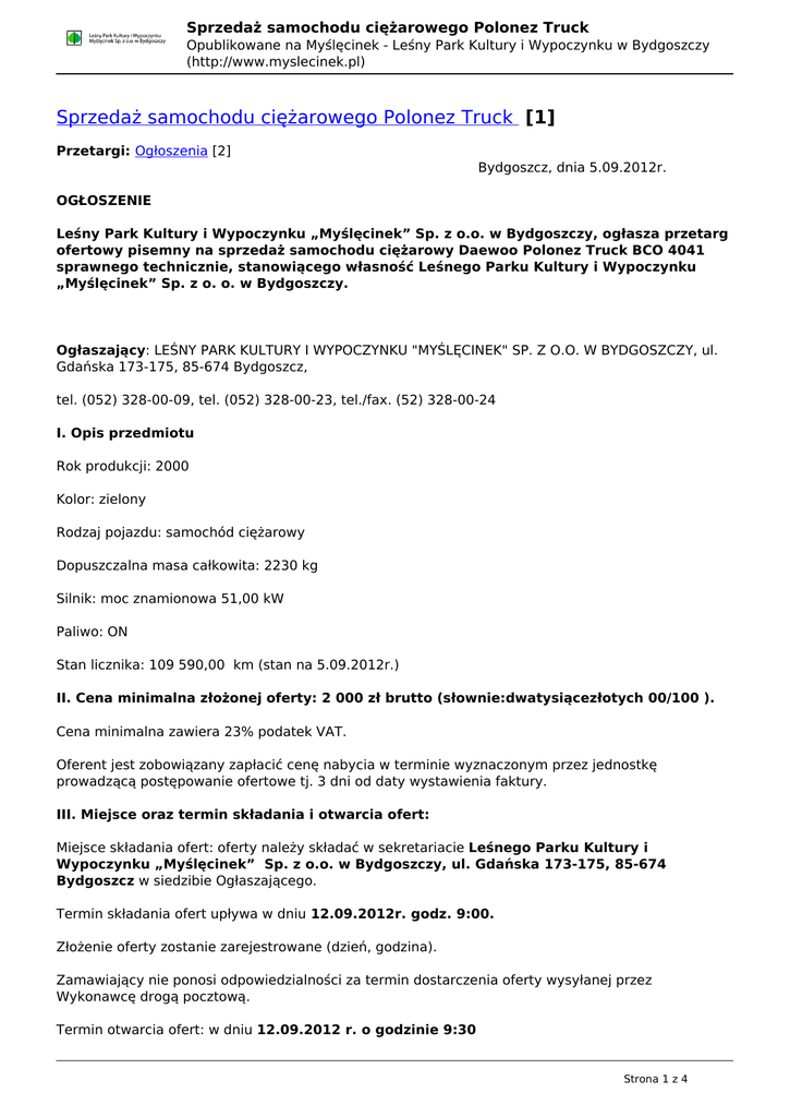 Sprzedaż samochodu ciężarowego Polonez Truck Opublikowane na Myślęcinek - Leśny Park Kultury i Wypoczynku w Bydgoszczy (http://www.myslecinek.pl) Sprzedaż samochodu ciężarowego Polonez Truck [1] Przetargi: Ogłoszenia [2] Bydgoszcz, dnia 5.09.2012r. OGŁOSZENIE Leśny Park Kultury i Wypoczynku „Myślęcinek” Sp. z o.o. w Bydgoszczy, ogłasza przetarg ofertowy pisemny na sprzedaż samochodu ciężarowy Daewoo Polonez Truck BCO 4041 sprawnego technicznie, stanowiącego własność Leśnego Parku Kultury i Wypoczynku „Myślęcinek” Sp. z o. o. w Bydgoszczy. Ogłaszający: LEŚNY PARK KULTURY I WYPOCZYNKU "MYŚLĘCINEK" SP. Z O.O. W BYDGOSZCZY, ul. Gdańska 173-175, 85-674 Bydgoszcz, tel. (052) 328-00-09, tel. (052) 328-00-23, tel./fax. (52) 328-00-24 I. Opis przedmiotu Rok produkcji: 2000 Kolor: zielony Rodzaj pojazdu: samochód ciężarowy Dopuszczalna masa całkowita: 2230 kg Silnik: moc znamionowa 51,00 kW Paliwo: ON Stan licznika: 109 590,00 km (stan na 5.09.2012r.) II. Cena minimalna złożonej oferty: 2 000 zł brutto (słownie:dwatysiącezłotych 00/100 ). Cena minimalna zawiera 23% podatek VAT. Oferent jest zobowiązany zapłacić cenę nabycia w terminie wyznaczonym przez jednostkę prowadzącą postępowanie ofertowe tj. 3 dni od daty wystawienia faktury. III. Miejsce oraz termin składania i otwarcia ofert: Miejsce składania ofert: oferty należy składać w sekretariacie Leśnego Parku Kultury i Wypoczynku „Myślęcinek” Sp. z o.o. w Bydgoszczy, ul. Gdańska 173-175, 85-674 Bydgoszcz w siedzibie Ogłaszającego. Termin składania ofert upływa w dniu 12.09.2012r. godz. 9:00. Złożenie oferty zostanie zarejestrowane (dzień, godzina). Zamawiający nie ponosi odpowiedzialności za termin dostarczenia oferty wysyłanej przez Wykonawcę drogą pocztową. Termin otwarcia ofert: w dniu 12.09.2012 r. o godzinie 9:30 Strona 1 z 4 Sprzedaż samochodu ciężarowego Polonez Truck Opublikowane na Myślęcinek - Leśny Park Kultury i Wypoczynku w Bydgoszczy (http://www.myslecinek.pl) Miejsce otwarcia ofert: Świetlica Leśnego Parku Kultury i Wypoczynku „Myślęcinek” Sp. z o.o. w Bydgoszczy, ul. Gdańska 173-175, 85-674 Bydgoszcz w siedzibie Ogłaszającego. IV. Opis sposobu przygotowania oferty. Ofertę należy złożyć w formie pisemnej, w języku polskim, a jej treść winna odpowiadać treści Ogłoszenia. Formularz oferty winien być podpisany przez Oferenta. Ofertę należy złożyć w zamkniętej kopercie zaadresowanej na: Leśny Park Kultury i Wypoczynku „Myślęcinek” Sp. z o.o. w Bydgoszczy, ul. Gdańska 173-175, 85-674 Bydgoszcz i oznaczonej: nazwą i adresem oferenta, nazwą zamówienia: Sprzedaż samochodu ciężarowego Polonez Truck oraz napisem: Nie otwierać przed dniem 12.09.2012 godzina 9:30. V. Wadium Warunkiem dopuszczenia do przetargu jest wpłacenie wadium w wysokości 200,00 zł (słownie: dwieściezłotych 00/100). Wadium należy wnieść w pieniądzu do Leśnego Parku Kultury i Wypoczynku „Myślęcinek” Sp. z o. o. w Bydgoszczy w formie płatności: - na konto bankowe nr 14 1320 1117 2032 2281 2000 0004 Leśnego Parku Kultury i Wypoczynku „Myślęcinek” Sp. z o. o. w Bydgoszczy- dowód wpłaty należy przedłożone w oryginale do dnia 12.09.2012 do godz. 9:00, lub, - gotówką do kasy LPKiW w siedzibie Zamawiającego do dnia 12.09.2012r. do godz. 9:00 tj. przed terminem składania ofert przez Oferenta. Wadium oferenta, który wygrał przetarg, zostanie zaliczone na poczet ceny nabycia. Wadia pozostałych oferentów zostaną zwrócone po wyborze oferty w zależności od formy jej wpłaty (w kasie lub na konto bankowe), jednak nie później niż przed upływem 3 dni od zakończenia przetargu w przypadku wpłaty na konto bankowe lub bezpośrednio w kasie uprzednio płacąc gotówką (siedziba LPKiW-budynek Zarządu). Oferent, który złoży najkorzystniejszą ofertę, a w wycofa się po jawnym otwarciu ofert, traci wadium. VI. Kryterium oceny Najwyższa zaoferowana cena zakupu. VII. Informacje dodatkowe 1. Pojazd posiada aktualne: - ubezpieczenie OC, AC, - badania techniczne. 2. Przedmiot ogłoszenia można obejrzeć w wyznaczonym przez Leśny Park Kultury i Wypoczynku „Myślęcinek” Sp. z o. o. w Bydgoszczy miejscu od poniedziałku do piątku od godziny 8:00 do 14:00 w Strona 2 z 4 Sprzedaż samochodu ciężarowego Polonez Truck Opublikowane na Myślęcinek - Leśny Park Kultury i Wypoczynku w Bydgoszczy (http://www.myslecinek.pl) dni robocze. 3. Przedmiot ogłoszenia zostanie wydany nabywcy niezwłocznie po uregulowaniu należności. 4. Sprzedający zastrzega sobie prawo odwołania przetargu bez podania przyczyny. Załącznik: 1) formularz ofertowy Załącznik formularz ofertowy.pdf [3] zdjęcie1.jpg [4] zdjęcie3.jpg [5] zdjęcie2.jpg [6] Zdjęcie4.jpg [7] Wielkość 27.56 KB 730.56 KB 817.28 KB 1.36 MB 619.09 KB Menu Aktualności Imprezy O nas Park Rozrywki Aktywny Wypoczynek Ogród Zoologiczny Ogród Botaniczny Konie KPCEE Dojazd How to get here Anreise Kontakty Sekretariat LPKiW E-mail: [email protected] Tel. 52-328-00-09, 23 Tel./Fax 52-328-00-24 Rzecznik prasowy E-mail: [email protected] Tel. 52-328-00-28 Dział marketingu E-mail: Park Rozrywki E-mail: dagmara.myszkowska@mysle cinek.pl Tel. 664-131-682 Ogród Zoologiczny KPCEE E-mail: [email protected] Tel.52-328-00-01 Ośrodek Rekreacji Konnej Tel. 724-560-016 E-mail: [email protected] Tel. 52-328-00-08 Strona 3 z 4 Sprzedaż samochodu ciężarowego Polonez Truck Opublikowane na Myślęcinek - Leśny Park Kultury i Wypoczynku w Bydgoszczy (http://www.myslecinek.pl) [email protected] Tel. 52-328-00-28 Ogród Botaniczny E-mail: [email protected] Adres URL źródła: http://www.myslecinek.pl/przetargi/ogloszenia/sprzedaz-samochoduciezarowego-polonez-truck-1#comment-0 Odnośniki [1] http://www.myslecinek.pl/przetargi/ogloszenia/sprzedaz-samochodu-ciezarowego-polonez-truck-1 [2] http://www.myslecinek.pl/przetargi/ogloszenia [3] http://www.myslecinek.pl/sites/default/files