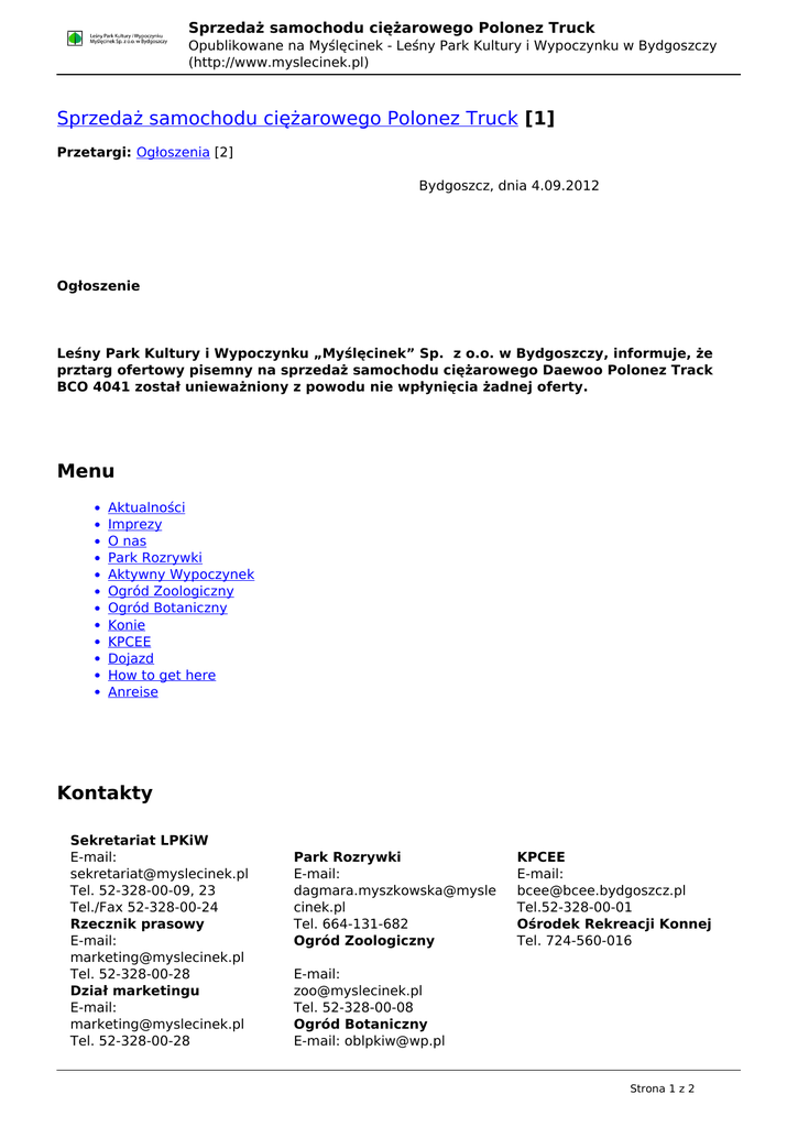 Sprzedaż samochodu ciężarowego Polonez Truck Opublikowane na Myślęcinek - Leśny Park Kultury i Wypoczynku w Bydgoszczy (http://www.myslecinek.pl) Sprzedaż samochodu ciężarowego Polonez Truck [1] Przetargi: Ogłoszenia [2] Bydgoszcz, dnia 4.09.2012 Ogłoszenie Leśny Park Kultury i Wypoczynku „Myślęcinek” Sp. z o.o. w Bydgoszczy, informuje, że prztarg ofertowy pisemny na sprzedaż samochodu ciężarowego Daewoo Polonez Track BCO 4041 został unieważniony z powodu nie wpłynięcia żadnej oferty. Menu Aktualności Imprezy O nas Park Rozrywki Aktywny Wypoczynek Ogród Zoologiczny Ogród Botaniczny Konie KPCEE Dojazd How to get here Anreise Kontakty Sekretariat LPKiW E-mail: [email protected] Tel. 52-328-00-09, 23 Tel./Fax 52-328-00-24 Rzecznik prasowy E-mail: [email protected] Tel. 52-328-00-28 Dział marketingu E-mail: [email protected] Tel. 52-328-00-28 Park Rozrywki E-mail: dagmara.myszkowska@mysle cinek.pl Tel. 664-131-682 Ogród Zoologiczny KPCEE E-mail: [email protected] Tel.52-328-00-01 Ośrodek Rekreacji Konnej Tel. 724-560-016 E-mail: [email protected] Tel. 52-328-00-08 Ogród Botaniczny E-mail: [email protected] Strona 1 z 2 Sprzedaż samochodu ciężarowego Polonez Truck Opublikowane na Myślęcinek - Leśny Park Kultury i Wypoczynku w Bydgoszczy (http://www.myslecinek.pl) Adres URL źródła: http://www.myslecinek.pl/przetargi/ogloszenia/sprzedaz-samochoduciezarowego-polonez-truck-0#comment-0 Odnośniki [1] http://www.myslecinek.pl/przetargi/ogloszenia/sprzedaz-samochodu-ciezarowego-polonez-truck-0 [2] http://www.myslecinek.pl/przetargi/ogloszenia Strona 2 z 2