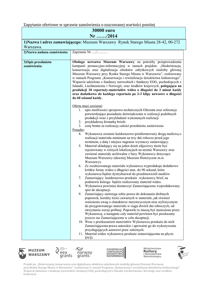 Zapytanie ofertowe w sprawie zamówienia o szacowanej wartości poniżej 30000 euro Nr ……/2014 1)Nazwa i adres zamawiającego: Muzeum Warszawy Rynek Starego Miasta 28-42, 00-272 Warszawa. 2)Nazwa nadana zamówieniu: Zapytanie Nr …./……… 3)Opis przedmiotu zamówienia: Obsługa newsowa Muzeum Warszawy na potrzeby przeprowadzenia kampanii promocyjno-informacyjnej w ramach projektu: „Modernizacja, konserwacja oraz digitalizacja obiektów zabytkowych siedziby głównej Muzeum Warszawy przy Rynku Starego Miasta w Warszawie”, realizowany w ramach Programu „Konserwacja i rewitalizacja dziedzictwa kulturowego”. Wsparcie udzielone z funduszy norweskich i funduszy EOG, pochodzących z Islandii, Liechtensteinu i Norwegii, oraz środków krajowych, polegająca na produkcji 10 reportaży-materiałów wideo o długości do 3 minut każdy oraz dodatkowo do każdego reportażu po 2-3 klipy newsowe o długości do 60 sekund każdy. Oferta musi zawierać: 1. opis możliwości sprzętowo-technicznych Oferenta oraz referencje potwierdzające posiadanie doświadczenia w realizacji podobnych produkcji wraz z przykładami wykonanych realizacji 2. przykładową formatkę briefu 3. cenę brutto za realizację całości przedmiotu zamówienia Ponadto: 4. Wykonawca zostanie każdorazowo poinformowany drogą mailową o realizacji materiału minimum na trzy dni robocze przed jego terminem, a datę i miejsce nagrania wyznaczy zamawiający. 5. Materiał składający się na jeden dzień zdjęciowy może być rejestrowany w różnych lokalizacjach na terenie Warszawy oraz zawierać materiały archiwalne z bazy Wykonawcy dotyczące Muzeum Warszawy (dawniej Muzeum Historyczne m.st. Warszawy). 6. Ze zrealizowanego materiału wykonawca wyprodukuje dodatkowo krótkie formy wideo o długości max. do 90 sekund, które wykonawca będzie dystrybuował do przedstawicieli mediów. 7. Zamawiający każdorazowo przekaże wykonawcy brief, na podstawie którego będzie realizowany materiał wideo. 8. Wykonawca powinien dostarczyć Zamawiającemu wyprodukowany spot do akceptacji. 9. Zamawiający zastrzega sobie prawo do dokonania drobnych poprawek, korekty treści zawartych w materiale, jak również wniesienia uwag o charakterze merytorycznym oraz stylistycznym do przygotowanego materiału w ciągu dwóch dni roboczych, od otrzymania wersji próbnej. Poprawki te muszą być naniesione przez Wykonawcę, a następnie cały materiał powinien być przekazany jeszcze raz Zamawiającemu w celu akceptacji. 10. Wraz z przekazaniem materiałów Wykonawca przekaże do nich Zamawiającemu prawa autorskie i upoważni go do wykonywania przysługujących autorowi praw zależnych. 11. Materiał wideo wykonawca przekaże zamawiającemu na płycie DVD. Projekt pn. „Modernizacja, konserwacja oraz digitalizacja obiektów zabytkowych siedziby głównej Muzeum Warszawy przy Rynku Starego Miasta w Warszawie”, realizowany w ramach Programu „Konserwacja i rewitalizacja dziedzictwa kulturowego”. Wsparcie udzielone z funduszy norweskich i funduszy EOG, pochodzących z Islandii, Liechtensteinu i Norwegii, oraz środków krajowych. 4)Pożądany termin wykonania: 5)Kryteria udziału: 5.1) Wiedza i doświadczenie (referencje): 5.2) Uprawnienia do wykonywania określonej działalności lub czynności: 5.3) Odpowiedni potencjał techniczny: 12. Wykonawca musi mieć możliwość dystrybuowania przygotowanych dla Muzeum materiałów na platformie cyfrowej zapewniającej publikację materiałów wideo na stronach internetowych Od momentu podpisania umowy do końca kwietnia 2016 r. Minimum trzy nagrane na płytę DVD materiały, nakręcone w ciągu ostatnich trzech lat potwierdzające spełnienie kryterium wyboru zgodnie z treścią pkt 7) zapytania ofertowego dot. punktacji przyznawanej za dotychczasowy dorobek nie dotyczy odpowiedni sprzęt audio-video i studio nagraniowe 5.4) Dysponowanie osobami zdolnymi do wykonania zamówienia: 5.5) Sytuacja ekonomicznej i finansowania nie dotyczy 6) Kryteria oceny ofert: - Koszt produkcji reportaży – 70% 7) Miejsce i forma składania ofert: 8) Termin składania ofert: - Dotychczasowy dorobek oferenta w realizacji krótkich filmów dla instytucji kultury, w tym w ramach wydarzeń z dziedziny kultury i sztuki –30% W siedzibie w godzinach pracy Muzeum lub e-mail: [email protected] Do dnia 26.03.2015 r. 9) Osoba do kontaktu ze strony zamawiającego: Aleksandra Derc-Jasińska tel.: 22 596 67 60 1. 2. 3. 4. nie dotyczy Muzeum Warszawy w przypadku zaakceptowania zakupu przez kierownika jednostki i zagwarantowania finansowania realizacji zamówienia, spośród prawidłowo zgłoszonych kandydatur wybierze podmiot, któremu powierzy realizację zamówienia. Muzeum Warszawy zastrzega sobie prawo kontaktu jedynie z wybranymi podmiotami. Niniejsze ogłoszenie nie stanowi oferty w rozumieniu kodeksu cywilnego i nie może stanowić podstawy do wysuwania roszczeń względem Muzeum Warszawy Muzeum nie ponosi kosztów sporządzenia oferty. Projekt pn. „Modernizacja, konserwacja oraz digitalizacja obiektów zabytkowych siedziby głównej Muzeum Warszawy przy Rynku Starego Miasta w Warszawie”, realizowany w ramach Programu „Konserwacja i rewitalizacja dziedzictwa kulturowego”. Wsparcie udzielone z funduszy norweskich i funduszy EOG, pochodzących z Islandii, Liechtensteinu i Norwegii, oraz środków krajowych. ....................................................... Zamawiający: Muzeum Warszawy ul. Rynek Starego Miasta 28-42, 00-272 Warszawa ( miejscowość, data ) Nazwa i adres zgłaszającego Nr telefonu: ……………………… Nr fax:……………………………. Osoba do kontaktu: ……………… (pieczątka) FORMULARZ OFERTOWY Oferujemy wykonanie produkcji 10 reportaży-materiałów wideo o długości do 3 minut każdy oraz dodatkowo do każdego reportażu po 2-3 klipy newsowe o długości do 60 sekund każdy, zgodnie z opisem przedmiotu zamówienia i na warunkach zawartych w zapytaniu ofer