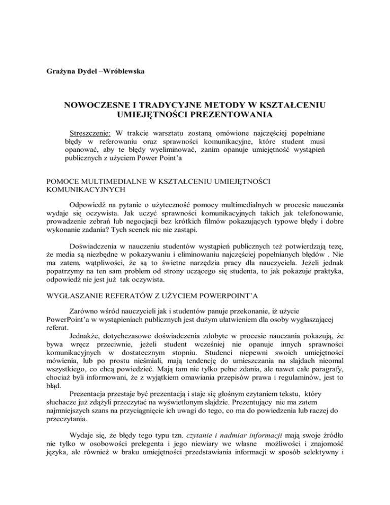 Grażyna Dydel –Wróblewska NOWOCZESNE I TRADYCYJNE METODY W KSZTAŁCENIU UMIEJĘTNOŚCI PREZENTOWANIA Streszczenie: W trakcie warsztatu zostaną omówione najczęściej popełniane błędy w referowaniu oraz sprawności komunikacyjne, które student musi opanować, aby te błędy wyeliminować, zanim opanuje umiejętność wystąpień publicznych z użyciem Power Point’a POMOCE MULTIMEDIALNE W KSZTAŁCENIU UMIEJĘTNOŚCI KOMUNIKACYJNYCH Odpowiedź na pytanie o użyteczność pomocy multimedialnych w procesie nauczania wydaje się oczywista. Jak uczyć sprawności komunikacyjnych takich jak telefonowanie, prowadzenie zebrań lub negocjacji bez krótkich filmów pokazujących typowe błędy i dobre wykonanie zadania? Tych scenek nic nie zastąpi. Doświadczenia w nauczeniu studentów wystąpień publicznych też potwierdzają tezę, że media są niezbędne w pokazywaniu i eliminowaniu najczęściej popełnianych błędów . Nie ma zatem, wątpliwości, że są to świetne narzędzia pracy dla nauczyciela. Jeżeli jednak popatrzymy na ten sam problem od strony uczącego się studenta, to jak pokazuje praktyka, odpowiedź nie jest już tak oczywista. WYGŁASZANIE REFERATÓW Z UŻYCIEM POWERPOINT’A Zarówno wśród nauczycieli jak i studentów panuje przekonanie, iż użycie PowerPoint’a w wystąpieniach publicznych jest dużym ułatwieniem dla osoby wygłaszającej referat. Jednakże, dotychczasowe doświadczenia zdobyte w procesie nauczania pokazują, że bywa wręcz przeciwnie, jeżeli student wcześniej nie opanuje innych sprawności komunikacyjnych w dostatecznym stopniu. Studenci niepewni swoich umiejętności mówienia, lub po prostu nieśmiali, mają tendencję do umieszczania na slajdach nieomal wszystkiego, co chcą powiedzieć. Mają tam nie tylko pełne zdania, ale nawet całe paragrafy, chociaż byli informowani, że z wyjątkiem omawiania przepisów prawa i regulaminów, jest to błąd. Prezentacja przestaje być prezentacją i staje się głośnym czytaniem tekstu, który słuchacze już zdążyli przeczytać na wyświetlonym slajdzie. Prezentujący nie ma zatem najmniejszych szans na przyciągnięcie ich uwagi do tego, co ma do powiedzenia lub raczej do przeczytania. Wydaje się, że błędy tego typu tzn. czytanie i nadmiar informacji mają swoje źródło nie tylko w osobowości prelegenta i jego niewiary we własne możliwości i znajomość języka, ale również w braku umiejętności przedstawiania informacji w sposób selektywny i 35 G. Dydel-Wróblewska relewantny . Studenci często usiłują przekazać jak najwięcej danych, chociaż znaczna część szczegółów jest zbędna dla opisania problemu. Natomiast reguła trzykrotnego powtórzenia informacji dotyczącej istoty prezentowanej sprawy: tell them what you are going to say, tell them, then tell them what you have just told them, jest bagatelizowana. W konsekwencji prezentacje często nie mają planu na początku lub podsumowania na końcu, chociaż środek referatu jest przeładowany. Podsumowując, studenci nie powinni używać PowerPoint’a do robienia prezentacji, wtedy, kiedy są to ich pierwsze próby samodzielnego wygłaszania referatów. TRADYCYJNE METODY REFEROWANIA Stosując tradycyjne metody możemy uniknąć opisanych wyżej błędów, przede wszystkim błędu nadmiaru informacji w dostępnym czasie. W przeciwieństwie do PowerPoint’a , stara metoda pojedynczych kartek po pierwsze, nie zachęca do umieszczania na nich dużej ilości szczegółów. Po drugie, słuchacze, nie widząc co jest napisane na następnych kartkach, znacznie łatwiej skupiają się na omawianym problemie, co niewątpliwie dodaje pewności osobie mówiącej. USTNE STESZCZENIA JAKO WSTĘP DO PREZENTACJI Zanim zaczniemy uczyć jak wygłaszać odczyty, powinniśmy uporać się najpierw z problemem selekcji i doboru informacji, żeby potem kształcić umiejętność streszczania. Praca z tekstem wydaje się być niezwykle ważnym ćwiczeniem. Nauczyciel powinien zacząć od ćwiczeń polegających na skracaniu tekstów ( precis) o 50%, z zachowaniem jak największej ilości informacji ważnej dla rozwiązania lub przedstawienia problemu. Takie dokładne streszczenie powinno studentom ułatwić sformułowanie krótkiego streszczenia, powiedzmy na 50 słów. Kolejnym krokiem jest ustne streszczenie tekstu z zachowaniem logiki wywodu. Ostatni krok to powrót do szczegółowego streszczenia, ale tym razem na kartkach, bez oryginalnego tekstu, czyli przygotowanie mini referatu (praca domowa), który zostanie wygłoszony na następnych zajęciach. WNIOSKI Konkludując, żeby studenci byli w stanie zrobić dobrą prezentację z zastosowaniem tak nowoczesnego narzędzia jakim jest PowerPoint muszą wcześniej opanować inne sprawności komunikacyjne. Muszą umieć: 1. rozpoznawać organizację tekstu, by zachować logikę wywodu 2. streszczać teksty, by wybrać najistotniejsze informacje, w ilości odpowiadającej ramom czasowym wystąpienia 3. nauczyć się tradycyjnego prezentowania z notatek, aby nie umieszczać na slajdach i nie czytać długich tekstów .