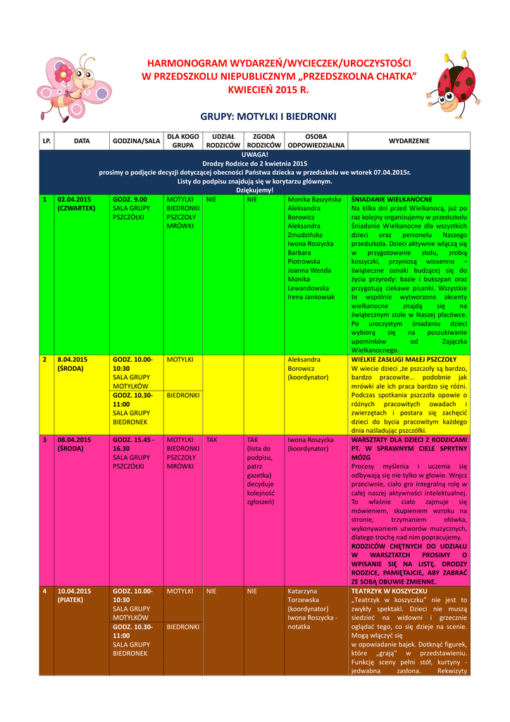 HARMONOGRAM WYDARZEŃ/WYCIECZEK/UROCZYSTOŚCI W PRZEDSZKOLU NIEPUBLICZNYM „PRZEDSZKOLNA CHATKA” KWIECIEŃ 2015 R. GRUPY: MOTYLKI I BIEDRONKI LP. 1 2 3 4 DLA KOGO UDZIAŁ ZGODA OSOBA WYDARZENIE GRUPA RODZICÓW RODZICÓW ODPOWIEDZIALNA UWAGA! Drodzy Rodzice do 2 kwietnia 2015 prosimy o podjęcie decyzji dotyczącej obecności Państwa dziecka w przedszkolu we wtorek 07.04.2015r. Listy do podpisu znajdują się w korytarzu głównym. Dziękujemy! 02.04.2015 GODZ. 9.00 MOTYLKI NIE NIE Monika Baszyńska ŚNIADANIE WIELKANOCNE (CZWARTEK) SALA GRUPY BIEDRONKI Aleksandra Na kilka dni przed Wielkanocą, już po PSZCZÓŁKI PSZCZOŁY Borowicz raz kolejny organizujemy w przedszkolu MRÓWKI Aleksandra Śniadanie Wielkanocne dla wszystkich Zmudzińska dzieci oraz personelu Naszego Iwona Roszycka przedszkola. Dzieci aktywnie włączą się Barbara w przygotowanie stołu, zrobią Piotrowska koszyczki, przyniosą wiosenno – Joanna Wenda świąteczne oznaki budzącej się do Monika życia przyrody: bazie i bukszpan oraz Lewandowska przygotują ciekawe pisanki. Wszystkie Irena Jankowiak te wspólnie wytworzone akcenty wielkanocne znajdą się na świątecznym stole w Naszej placówce. Po uroczystym śniadaniu dzieci wybiorą się na poszukiwanie upominków od Zajączka Wielkanocnego. 8.04.2015 GODZ. 10.00MOTYLKI Aleksandra WIELKIE ZASŁUGI MAŁEJ PSZCZOŁY (ŚRODA) 10:30 Borowicz W wiecie dzieci ,że pszczoły są bardzo, SALA GRUPY (koordynator) bardzo pracowite... podobnie jak MOTYLKÓW mrówki ale ich praca bardzo się różni. Podczas spotkania pszczoła opowie o GODZ. 10.30BIEDRONKI różnych pracowitych owadach i 11:00 zwierzętach i postara się zachęcić SALA GRUPY dzieci do bycia pracowitym każdego BIEDRONEK dnia naśladując pszczółki. 08.04.2015 GODZ. 15.45 MOTYLKI TAK TAK Iwona Roszycka WARSZTATY DLA DZIECI Z RODZICAMI (ŚRODA) 16.30 BIEDRONKI (lista do (koordynator) PT. W SPRAWNYM CIELE SPRYTNY SALA GRUPY PSZCZOŁY podpisu, MÓZG PSZCZÓŁKI MRÓWKI patrz Procesy myślenia i uczenia się gazetka) odbywają się nie tylko w głowie. Wręcz decyduje przeciwnie, ciało gra integralną rolę w kolejność całej naszej aktywności intelektualnej. zgłoszeń) To właśnie ciało zajmuje się mówieniem, skupieniem wzroku na stronie, trzymaniem ołówka, wykonywaniem utworów muzycznych, dlatego trochę nad nim popracujemy. RODZICÓW CHĘTNYCH DO UDZIAŁU W WARSZTATCH PROSIMY O WPISANIE SIĘ NA LISTĘ. DRODZY RODZICE, PAMIĘTAJCIE, ABY ZABRAĆ ZE SOBĄ OBUWIE ZMIENNE. 10.04.2015 GODZ. 10.00MOTYLKI NIE NIE Katarzyna TEATRZYK W KOSZYCZKU (PIATEK) 10:30 Torzewska „Teatrzyk w koszyczku” nie jest to SALA GRUPY (koordynator) zwykły spektakl. Dzieci nie muszą MOTYLKÓW Iwona Roszycka siedzieć na widowni i grzecznie notatka oglądać tego, co się dzieje na scenie. GODZ. 10.30BIEDRONKI Mogą włączyć się 11:00 w opowiadanie bajek. Dotknąć figurek, SALA GRUPY które „grają" w przedstawieniu. BIEDRONEK Funkcję sceny pełni stół, kurtyny jedwabna zasłona. Rekwizyty DATA GODZINA/SALA 5 GODZ. 11.4512.15 SALA GRUPY MOTYLKÓW 10.04.2015 GODZ. 10.30(PIĄTEK) 11.00 SALA GRUPY MOTYLKÓW 13.04.2015 GODZ. 11:30 – (PONIEDZIAŁEK) 12;30 SALA GRUPY MOTYLKÓW MOTYLE NIE BIEDRONKI NIE Magdalena Fórmankiewicz MOTYLE NIE BIEDRONKI NIE Magdalena Fórmankiewicz MOTYLKI NIE BIEDRONKI NIE Aleksandra Zmudzińska (koordynator) Aleksandra Borowicz 8 15.04.2015 (ŚRODA) CAŁY DZIEŃ MOTYLKI TAK BIEDRONKI TAK (lista do podpisu, patrz gazetka) decyduje kolejność zgłoszeń) Aleksandra Zmudzińska Aleksandra Borowicz Monika Baszyńska Iwona Roszycka 9 16.04.2015 (CZWARTEK) GODZ. 15:45 – 16:30 SALA GRUPY MOTYLKÓW MOTYLKI TAK TAK (lista do podpisu, patrz gazetka) decyduje kolejność zgłoszeń) Monika Baszyńska (koordynator) 10 18.04.2015 (SOBOTA) GODZ. 10:00 – 13:00 WSZYSTKIE SALE ZGODNIE Z ROZPISKĄ - NIE NIE CAŁA KADRA PRZEDSZKOLA 6 7 10.04.2015 (PIĄTEK) zazwyczaj są własnoręcznie zrobione, lalki nie mają rysów twarzy, dekoracje są lekkie i zwiewne. Są też wyroby z gliny i dary natury. A najciekawsze jest to, że cały teatrzyk można zmieścić w koszyczku. ODROBIENIE ZAJEĆ Z JĘZYKA ANGIELSKIEGO Z CZWARTKU 02.04.2015R. (zajęcia odwołane z powodu Śniadania Wielkanocnego) ODROBIENIE ZAJEĆ Z GIMNASTYKI OGÓLNOROZWOJOWEJ Z CZWARTKU 02.04.2015R. (zajęcia odwołane z powodu Śniadania Wielkanocnego) BAL PIŹAMOWY Hej wszystkie śpiochy! Czy wiecie, że dziś wcale nie będziecie musieli wyskakiwać ze swoich piżamek? Zabierajcie swoje ulubione podusie i przytulaki i przybywajcie na Bal Piżamowy! Oj nie, nie będziemy wcale spać! Może nasze harce i zabawy skończy wielka bitwa na poduszki? DRODZY RODZICE, PROSIMY ABY UBRAĆ W TEN DZIEŃ DZIECI W PIŻAMY ORAZ PROSIMY PRZYNIESIENIE W MIARĘ MOZLIWOŚCI PODUSZECZKI I UKOCHANEJ PRZYTULANKI DZIECKA. WYCIECZKA DO ZOO Przedszkolaki z najmłodszych grup udadzą się na niezwykle atrakcyjną wycieczkę do Myślęcinka. Naszą zabawę zaczniemy od zwiedzania ZOO. Dzieci spotkają podczas naszej wędrówki wiele wspaniałych i ciekawych zwierząt. Podczas naszego pobytu w Myślęcinku nie może również zabraknąć pobytu na placu zabaw gdzie nasze pociechy będą mogły rozładować swoje emocje nagromadzone podczas podróży po świecie zwierząt, ptaków czy owadów. ZAJĘCIA OTWARTE W GRUPIE MOTYLKÓW: ZWIERZĄTKA Z WIEJSKIEGO PODWÓRKA Serdecznie zapraszamy na zajęcia, podczas których chcemy pokazać Wam Drodzy Rodzice, jak się bawimy i uczymy. Pomogą nam w tym zwierzątka z wiejskiego podwórka. Razem z nimi rozpoznamy odgłosy, które wydają, będziemy je naśladować, zaśpiewamy, zagramy i wykonamy pracę plastyczną. Czeka nas i Was super zabawa. Serdecznie zapraszam! RODZICÓW CHĘTNYCH DO UDZIAŁU W ZAJĘCIACH PROSIMY O WPISANIE SIĘ NA LISTĘ. DRODZY RODZICE, PAMIĘTAJCIE, ABY ZABRAĆ ZE SOBĄ WYGODNE UBRANIE I OBUWIE ZMIENNE. DRZWI OTWARTE W PRZEDSZKOLNEJ CHATCE Maluszki, oraz rodziców zapraszamy do wspólnej zabawy w d