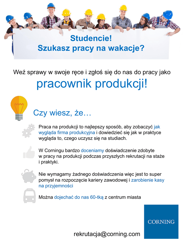 Studencie! Szukasz pracy na wakacje? Weź sprawy w swoje ręce i zgłoś się do nas do pracy jako pracownik produkcji! Czy wiesz, że… Praca na produkcji to najlepszy sposób, aby zobaczyć jak wygląda firma produkcyjna i dowiedzieć się jak w praktyce wygląda to, czego uczysz się na studiach. W Corningu bardzo doceniamy doświadczenie zdobyte w pracy na produkcji podczas przyszłych rekrutacji na staże i praktyki. Nie wymagamy żadnego doświadczenia więc jest to super pomysł na rozpoczęcie kariery zawodowej i zarobienie kasy na przyjemności Można dojechać do nas 60-tką z centrum miasta [email protected] Prześlij CV na stanowisko pracownik produkcji w firmie Corning Optical Communications Co oferujemy? • • • • zatrudnienie na umowę o pracę za pośrednictwem agencji pracy tymczasowej dofinansowanie do posiłków premie produkcyjne możliwość poznania firmy produkcyjnej i wzięcia udziału w rekrutacjach wewnętrznych Co będziesz robić? • • • montować drobne elementy, wykonywać proste prace produkcyjne, kontrolować jakość Gdzie? • • Stryków dogodny dojazd z kierunków: Łódź autobus linii 60, Zgierz autobus linii 2 A, Ozorków, Łęczyca, Koluszki, Brzeziny, Łowicz, Łyszkowice, Głowno (BUS) Aby wziąć udział w rekrutacji, wyślij CV na adres: [email protected] z dopiskiem „praca na wakacje”.