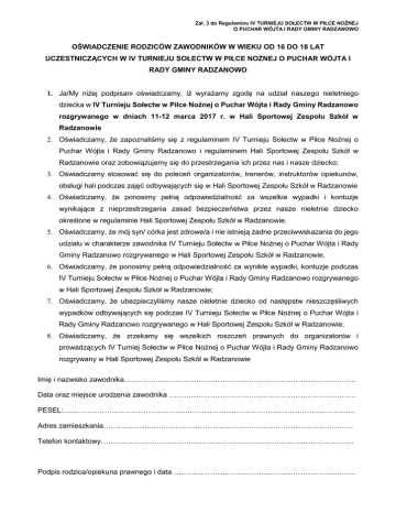 Zał. 3 do Regulaminu IV TURNIEJU SOŁECTW W PIŁCE NOŻNEJ O PUCHAR WÓJTA I RADY GMINY RADZANOWO OŚWIADCZENIE RODZICÓW ZAWODNIKÓW W WIEKU OD 16 DO 18 LAT UCZESTNICZĄCYCH W IV TURNIEJU SOŁECTW W PIŁCE NOŻNEJ O PUCHAR WÓJTA I RADY GMINY RADZANOWO 1. Ja/My niżej podpisani oświadczamy, iż wyrażamy zgodę na udział naszego nieletniego dziecka w IV Turnieju Sołectw w Piłce Nożnej o Puchar Wójta i Rady Gminy Radzanowo rozgrywanego w dniach 11-12 marca 2017 r. w Hali Sportowej Zespołu Szkół w Radzanowie 2. Oświadczamy, że zapoznaliśmy się z regulaminem IV Turnieju Sołectw w Piłce Nożnej o Puchar Wójta i Rady Gminy Radzanowo i regulaminem Hali Sportowej Zespołu Szkół w Radzanowie oraz zobowiązujemy się do przestrzegania ich przez nas i nasze dziecko; 3. Oświadczamy stosować się do poleceń organizatorów, trenerów, instruktorów opiekunów, obsługi hali podczas zajęć odbywających się w Hali Sportowej Zespołu Szkół w Radzanowie 4. Oświadczamy, że ponosimy pełną odpowiedzialność za wszelkie wypadki i kontuzje wynikające z nieprzestrzegania zasad bezpieczeństwa przez nasze nieletnie dziecko określone w regulaminie Hali Sportowej Zespołu Szkół w Radzanowie. 5. Oświadczamy, że mój syn/ córka jest zdrowe/a i nie istnieją żadne przeciwwskazania do jego udziału w charakterze zawodnika IV Turnieju Sołectw w Piłce Nożnej o Puchar Wójta i Rady Gminy Radzanowo rozgrywanego w Hali Sportowej Zespołu Szkół w Radzanowie. 6. Oświadczamy, że ponosimy pełną odpowiedzialność za wynikłe wypadki, kontuzje podczas IV Turnieju Sołectw w Piłce Nożnej o Puchar Wójta i Rady Gminy Radzanowo rozgrywanego w Hali Sportowej Zespołu Szkół w Radzanowie; 7. Oświadczamy, że ubezpieczyliśmy nasze nieletnie dziecko od następstw nieszczęśliwych wypadków odbywających się podczas IV Turnieju Sołectw w Piłce Nożnej o Puchar Wójta i Rady Gminy Radzanowo rozgrywanego w Hali Sportowej Zespołu Szkół w Radzanowie; 8. Oświadczamy, że zrzekamy się wszelkich roszczeń prawnych do organizatorów i prowadzących IV Turniej Sołectw w Piłce Nożnej o Puchar Wójta i Rady Gminy Radzanowo rozgrywany w Hali Sportowej Zespołu Szkół w Radzanowie Imię i nazwisko zawodnika…………………..………..…………………………………………………….. Data oraz miejsce urodzenia zawodnika ………….………………………………………………….…… PESEL:….…………………………………………………………………………………………………….. Adres zamieszkania………………..……………………………………………………………………….. Telefon kontaktowy………………………………………………………………………………………….. Podpis rodzica/opiekuna prawnego i data ………………………………………………………………...