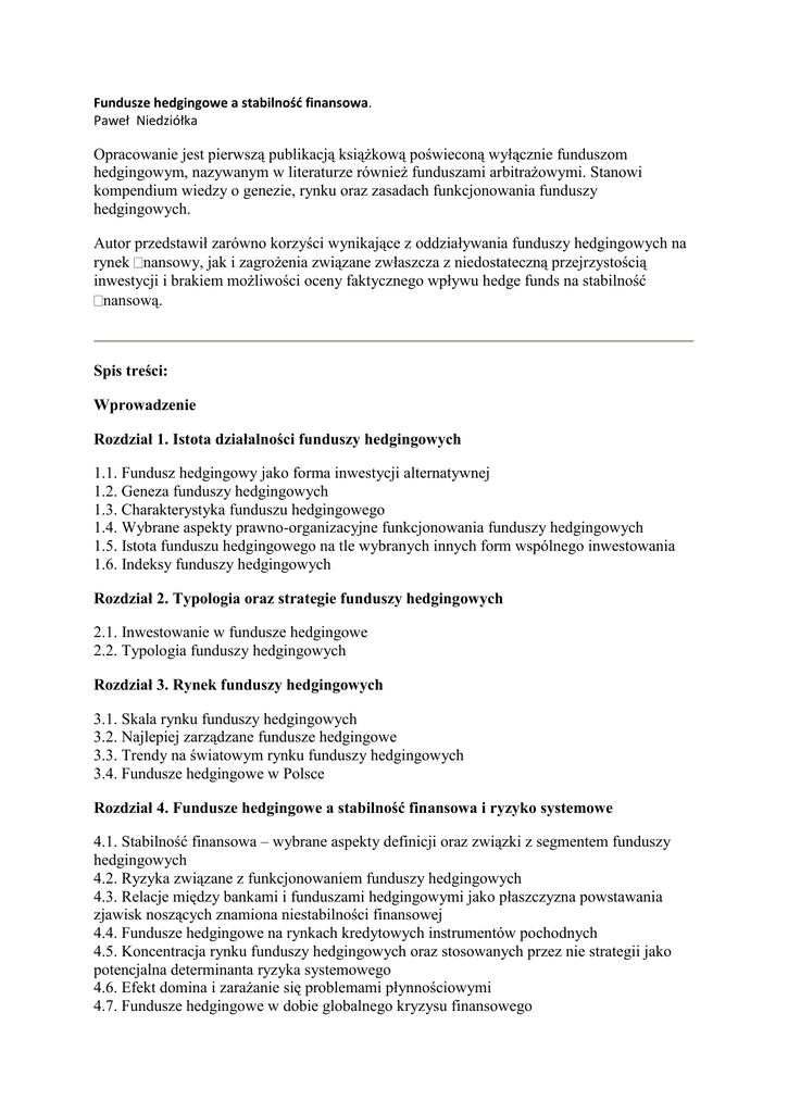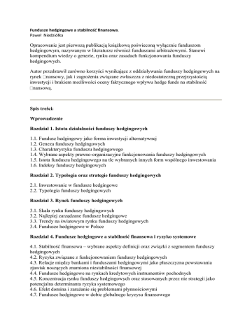 Fundusze hedgingowe a stabilność finansowa. Paweł Niedziółka Opracowanie jest pierwszą publikacją książkową poświeconą wyłącznie funduszom hedgingowym, nazywanym w literaturze również funduszami arbitrażowymi. Stanowi kompendium wiedzy o genezie, rynku oraz zasadach funkcjonowania funduszy hedgingowych. Autor przedstawił zarówno korzyści wynikające z oddziaływania funduszy hedgingowych na rynek nansowy, jak i zagrożenia związane zwłaszcza z niedostateczną przejrzystością inwestycji i brakiem możliwości oceny faktycznego wpływu hedge funds na stabilność nansową. Spis treści: Wprowadzenie Rozdział 1. Istota działalności funduszy hedgingowych 1.1. Fundusz hedgingowy jako forma inwestycji alternatywnej 1.2. Geneza funduszy hedgingowych 1.3. Charakterystyka funduszu hedgingowego 1.4. Wybrane aspekty prawno-organizacyjne funkcjonowania funduszy hedgingowych 1.5. Istota funduszu hedgingowego na tle wybranych innych form wspólnego inwestowania 1.6. Indeksy funduszy hedgingowych Rozdział 2. Typologia oraz strategie funduszy hedgingowych 2.1. Inwestowanie w fundusze hedgingowe 2.2. Typologia funduszy hedgingowych Rozdział 3. Rynek funduszy hedgingowych 3.1. Skala rynku funduszy hedgingowych 3.2. Najlepiej zarządzane fundusze hedgingowe 3.3. Trendy na światowym rynku funduszy hedgingowych 3.4. Fundusze hedgingowe w Polsce Rozdział 4. Fundusze hedgingowe a stabilność finansowa i ryzyko systemowe 4.1. Stabilność finansowa – wybrane aspekty definicji oraz związki z segmentem funduszy hedgingowych 4.2. Ryzyka związane z funkcjonowaniem funduszy hedgingowych 4.3. Relacje między bankami i funduszami hedgingowymi jako płaszczyzna powstawania zjawisk noszących znamiona niestabilności finansowej 4.4. Fundusze hedgingowe na rynkach kredytowych instrumentów pochodnych 4.5. Koncentracja rynku funduszy hedgingowych oraz stosowanych przez nie strategii jako potencjalna determinanta ryzyka systemowego 4.6. Efekt domina i zarażanie się problemami płynnościowymi 4.7. Fundusze hedgingowe w dobie globalnego kryzysu finansowego Rozdział 5. Rozwiązania ukierunkowane na ograniczenie ryzyka systemowego wynikającego z funkcjonowania funduszy hedgingowych 5.1. Regulacje dotyczące działalności funduszy hedgingowych w Stanach Zjednoczonych oraz w wybranych krajach europejskich 5.2. Międzynarodowe inicjatywy nadzorcze dotyczące funduszy hedgingowych 5.3. Rynkowe przedsięwzięcia regulacyjne związane z działalnością funduszy hedgingowych 5.4. Ocena funduszu hedgingowego przez niezależną instytucję – przykład aplikacji ratingowej Morningstar Rozdział 6. Studium przypadku – przyczyny i konsekwencje upadłości funduszy LTCM i Amaranth 6.1. LTCM – fundusz o znaczeniu systemowym 6.2. Amaranth – przykład upadłości bez znaczącego wpływu na inne instytucje finansowe Zakończenie Bibliografia Spis rysunków Spis wykresów Spis tabel