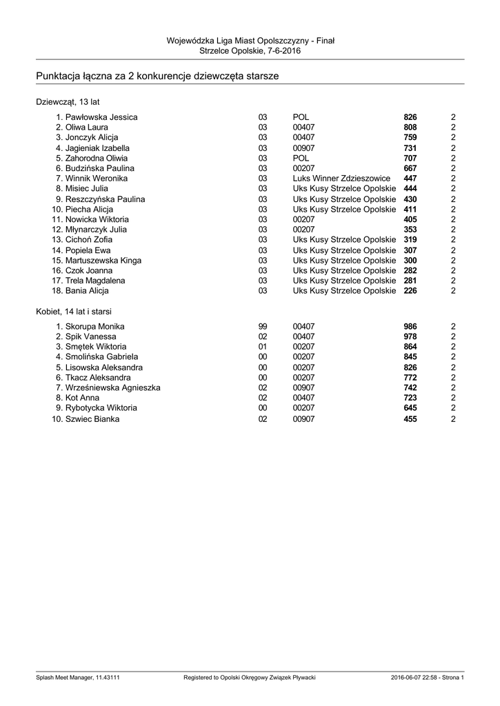 Wojewódzka Liga Miast Opolszczyzny - Finał Strzelce Opolskie, 7-6-2016 Punktacja łączna za 2 konkurencje dziewczęta starsze Dziewcząt, 13 lat 1. Pawłowska Jessica 2. Oliwa Laura 3. Jonczyk Alicja 4. Jagieniak Izabella 5. Zahorodna Oliwia 6. Budzińska Paulina 7. Winnik Weronika 8. Misiec Julia 9. Reszczyńska Paulina 10. Piecha Alicja 11. Nowicka Wiktoria 12. Młynarczyk Julia 13. Cichoń Zofia 14. Popiela Ewa 15. Martuszewska Kinga 16. Czok Joanna 17. Trela Magdalena 18. Bania Alicja 03 03 03 03 03 03 03 03 03 03 03 03 03 03 03 03 03 03 POL 00407 00407 00907 POL 00207 Luks Winner Zdzieszowice Uks Kusy Strzelce Opolskie Uks Kusy Strzelce Opolskie Uks Kusy Strzelce Opolskie 00207 00207 Uks Kusy Strzelce Opolskie Uks Kusy Strzelce Opolskie Uks Kusy Strzelce Opolskie Uks Kusy Strzelce Opolskie Uks Kusy Strzelce Opolskie Uks Kusy Strzelce Opolskie 826 808 759 731 707 667 447 444 430 411 405 353 319 307 300 282 281 226 2 2 2 2 2 2 2 2 2 2 2 2 2 2 2 2 2 2 99 02 01 00 00 00 02 02 00 02 00407 00407 00207 00207 00207 00207 00907 00407 00207 00907 986 978 864 845 826 772 742 723 645 455 2 2 2 2 2 2 2 2 2 2 Kobiet, 14 lat i starsi 1. Skorupa Monika 2. Spik Vanessa 3. Smętek Wiktoria 4. Smolińska Gabriela 5. Lisowska Aleksandra 6. Tkacz Aleksandra 7. Wrześniewska Agnieszka 8. Kot Anna 9. Rybotycka Wiktoria 10. Szwiec Bianka Splash Meet Manager, 11.43111 Registered to Opolski Okręgowy Związek Pływacki 2016-06-07 22:58 - Strona 1