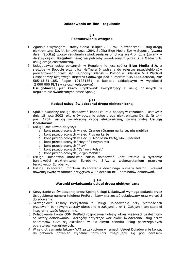 Doładowania on-line - regulamin §I Postanowienia wstępne 1. Zgodnie z wymogami ustawy z dnia 18 lipca 2002 roku o świadczeniu usług drogą elektroniczną Dz. U. Nr 144 poz. 1204, Spółka Blue Media S.A w Sopocie (zwana dalej: Spółką) tworzy regulamin świadczenia usług drogą elektroniczną (zwany w dalszej części: Regulaminem) na potrzeby świadczonych przez Blue Media S.A. usług drogą elektroniczną. 2. Usługodawcą usług opisanych w Regulaminie jest spółka Blue Media S.A. z siedzibą w Sopocie przy ulicy Haffnera 6 wpisana do rejestru przedsiębiorców prowadzonego przez Sąd Rejonowy Gdańsk – Północ w Gdańsku VIII Wydział Gospodarczy Krajowego Rejestru Sądowego pod numerem KRS 0000320590, NIP 585-13-51-185, Regon 191781561, o kapitale zakładowym w wysokości 2 000 000 PLN (w całości wpłaconym). 3. Usługobiorcą jest każdy użytkownik korzystający z usług opisanych w Regulaminie świadczonych przez Spółkę. § II Rodzaj usługi świadczonej drogą elektroniczną 1. Spółka świadczy usługę doładowań kont Pre-Paid będącą w rozumieniu ustawy z dnia 18 lipca 2002 roku o świadczeniu usług drogą elektroniczną Dz. U. Nr 144 poz. 1204, usługą świadczoną drogą elektroniczną, zwaną dalej Usługą Doładowań. 2. Usługa Doładowań dotyczy: a. kont przedpłaconych w sieci Orange (Orange na kartę, nju mobile) b. kont przedpłaconych w sieci Plus na kartę c. kont przedpłaconych w sieci T-Mobile na kartę, Mix i Internet d. kont przedpłaconych "Heyah" i Heyah Mix e. kont przedpłaconych "Play" f. kont przedpłaconych "Cyfrowy Polsat" g. kont przedpłaconych „Virgin Mobile” 3. Usługa Doładowań umożliwia zakup doładowań kont PrePaid w systemie bankowości elektronicznej Eurobanku S.A., z wykorzystaniem przelewu bankowego Eurobanku. 4. Usługa Doładowań umożliwia doładowanie dowolnego numeru telefonu PrePaid dowolną kwotą w ramach przyjętych w Załączniku nr 2 nominałów doładowań. § III Warunki świadczenia usługi drogą elektroniczną 1. Korzystanie ze świadczonej przez Spółkę Usługi Doładowań wymaga podania przez Usługobiorcę numeru telefonu PrePaid, który ma zostać doładowany oraz wartości doładowania. 2. Szczegółowe zasady korzystania z Usługi Doładowania przy płatnościach przelewem bankowym zostały określone w załączniku nr 1. Załącznik ten stanowi integralną część Regulaminu. 3. Doładowanie konta GSM PrePaid rozpoczyna kolejny okres ważności uzależniony od kwoty doładowania. Szczegóły dotyczące warunków świadczenia usług przez operatorów GSM są określone w aktualnym cenniku usług poszczególnych operatorów komórkowych. 4. W celu otrzymania faktury VAT za zakupione w ramach Usługi Doładowanie konta, Usługobiorca powinien wypełnić formularz znajdujący się pod adresem 5. 6. 7. 8. 9. https://zasilenia.faktura.pl/ z danymi Usługobiorcy niezbędnymi do wystawienia faktury wraz z adresem e-mail, podanym w celu przesłania faktury VAT drogą elektroniczną. Faktura VAT zostanie wystawiona zgodnie z przepisami prawa po wypełnieniu formularza zgodnie z niniejszym ustępem. Dane osobowe Usługobiorcy przetwarzane są w celu prawidłowej realizacji Usługi Doładowań, w oparciu o przepisy ustawy z dnia 29.08.1997 r. o ochronie danych osobowych (Dz.U. Nr 101 poz. 926). Podanie przez Usługobiorcę danych osobowych jest dobrowolne, ale konieczne do realizacji Usług Doładowania. Usługobiorca może - poprzez zaznaczenie stosownej opcji - wyrazić zgodę na otrzymywanie od Blue Media S.A. informacji handlowych drogą elektroniczną, zgodnie z przepisami ustawy o której mowa w par.1 ust.1. niniejszego Regulaminu. Administratorem zbioru danych osobowych Usługobiorcy jest Spółka. Usługobiorca ma prawo wglądu do swoich danych osobowych oraz prawo do żądania ich poprawienia. W celu korzystania z Usługi Doładowań niezbędne jest spełnienie przez Usługobiorcę następujących wymagań technicznych: a) posiadanie urządzeń zapewniających dostęp do sieci Internet, b) posiadanie zaktualizowanej przeglądarki internetowej zapewniającej prawidłowe wyświetlanie strony https://online.eurobank.pl c) posiadanie rachunku bankowego z dostępem przez Internet lub karty płatniczej wskazanej w Załączniku nr 1, za pomocą których Usługobiorca będzie realizował płatność za Usługę Doładowania. § IV Warunki zawierania i rozwiązywania umowy o świadczenie usługi drogą elektroniczną 1. Zawieranie i rozwiązywanie umów o świadczenie Usług Doładowań odbywa się za pośrednictwem portalu internetowego Eurobanku, wewnątrz bankowości elektronicznej. 2. Zawarcie umowy o realizację Usługi Doładowań następuje po potwierdzeniu zapoznania się i akceptacji niniejszego Regulaminu. §V Reklamacje 1. Składanie reklamacji odbywa się drogą elektroniczną na adres e-mail Spółki: [email protected]; telefonicznie na numer Spółki 0 58 7604 822 (połączenie płatne – koszt zgodnie z taryfą operatora), 0 801 800 822 (połączenie płatne 20 gr. brutto za każdą minutę połączenia), faxem – pod numerem 0 58 555 13 18 bądź pocztą – na adres Spółki. 2. Przedmiotem reklamacji jest wykonanie przez Spółkę Usługi Doładowań, niezgodnie z warunkami i zasadami określonymi w niniejszym Regulaminie. 3. Podstawy reklamacji nie może stanowić powoływanie się na okoliczność, iż numer doładowywanego telefonu został błędnie podany przez Usługobiorcę lub powoływanie się na okoliczności związane z nieprawidłowym funkcjonowaniem przeglądarki internetowej lub łącz telekomunikacyjnych po stronie Usługobiorcy. 4. Reklamacja winna zawierać wskazanie Usługobiorcy oraz zwięzły opis zgłaszanych zastrzeżeń. 5. Jeżeli reklamacja wymaga uzupełnienia Spółka zwraca się do Usługobiorcy z prośbą o podanie szczegółów świadczonej usługi. 6. Spółka rozpoznaje reklamację w terminie 14 dni od daty jej otrzymania. § VI Zastrzeżenia U