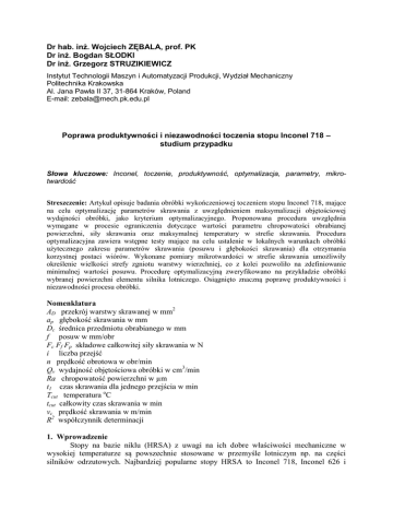 Dr hab. inż. Wojciech ZĘBALA, prof. PK Dr inż. Bogdan SŁODKI Dr inż. Grzegorz STRUZIKIEWICZ Instytut Technologii Maszyn i Automatyzacji Produkcji, Wydział Mechaniczny Politechnika Krakowska Al. Jana Pawła II 37, 31-864 Kraków, Poland E-mail: [email protected] Poprawa produktywności i niezawodności toczenia stopu Inconel 718 – studium przypadku Słowa kluczowe: Inconel, toczenie, produktywność, optymalizacja, parametry, mikrotwardość Streszczenie: Artykuł opisuje badania obróbki wykończeniowej toczeniem stopu Inconel 718, mające na celu optymalizację parametrów skrawania z uwzględnieniem maksymalizacji objętościowej wydajności obróbki, jako kryterium optymalizacyjnego. Proponowana procedura uwzględnia wymagane w procesie ograniczenia dotyczące wartości parametru chropowatości obrabianej powierzchni, siły skrawania oraz maksymalnej temperatury w strefie skrawania. Procedura optymalizacyjna zawiera wstępne testy mające na celu ustalenie w lokalnych warunkach obróbki użytecznego zakresu parametrów skrawania (posuwu i głębokości skrawania) dla otrzymania korzystnej postaci wiórów. Wykonane pomiary mikrotwardości w strefie skrawania umożliwiły określenie wielkości strefy zgniotu warstwy wierzchniej, co z kolei pozwoliło na zdefiniowanie minimalnej wartości posuwu. Procedurę optymalizacyjną zweryfikowano na przykładzie obróbki wybranej powierzchni elementu silnika lotniczego. Osiągnięto znaczną poprawę produktywności i niezawodności procesu obróbki. Nomenklatura AD przekrój warstwy skrawanej w mm2 ap głębokość skrawania w mm Dc średnica przedmiotu obrabianego w mm f posuw w mm/obr Fc Ff Fp składowe całkowitej siły skrawania w N i liczba przejść n prędkość obrotowa w obr/min Qv wydajność objętościowa obróbki w cm3/min Ra chropowatość powierzchni w µm t1 czas skrawania dla jednego przejścia w min Tcut temperatura oC tcut całkowity czas skrawania w min vc prędkość skrawania w m/min R2 współczynnik determinacji 1. Wprowadzenie Stopy na bazie niklu (HRSA) z uwagi na ich dobre właściwości mechaniczne w wysokiej temperaturze są powszechnie stosowane w przemyśle lotniczym np. na części silników odrzutowych. Najbardziej popularne stopy HRSA to Inconel 718, Inconel 626 i Waspaloy. Około 45% odkuwek i 15% odlewów jest wykonywanych ze stopu Inconel 718 [6,29]. Pomimo dobrych właściwości konstrukcyjnych stopy na bazie niklu są materiałami trudnoskrawalnymi. Inconel 718 charakteryzuje się wysoką twardością w podwyższonej temperaturze, co determinuje wysoki opór skrawania. Stop ten ma tendencję do utwardzania się w warstwie przypowierzchniowej. Niska przewodność cieplna przyczynia się do powstawania wysokiej temperatury w strefie skrawania. Wynosi ona od 900°C przy niskiej prędkości skrawania, rzędu 30 m/min, do 1300°C przy 300 m/min [18]. Skład chemiczny większości stopów niklu zawiera 10-20% chromu, do 8% glinu i tytanu łącznie, od 5 do 15% kobaltu i niewielkie ilości boru, chromu, magnezu i węgla. Pozostałe składniki to molibden, niob i wolfram. Od końca lat siedemdziesiątych stopy niklu są obiektem szczegółowych badań [4,10,12,13,15,21-23,26,27,34]. Szczególną uwagę przykłada się do jakości powierzchni i spójności warstwy wierzchniej części wykonanych z tych stopów [24,31]. Jest to istotne z uwagi na trwałość, wytrzymałość zmęczeniową i funkcjonalność obrobionych części [2,3,5,35,36]. Proces obróbki może mieć miejsce wówczas, gdy konieczna siła, właściwie usytuowana w czasie i przestrzeni, jest przyłożona do przedmiotu obrabianego. Siła działająca na ostrze musi przezwyciężyć opór materiału obrabianego, jego sprężyste i plastyczne odkształcenia oraz opór tarcia podczas tworzenia nowej powierzchni [9,28,33]. Analiza literatury opisującej zjawiska występujące w procesie skrawania wykazuje, że wraz ze wzrostem prędkości skrawania (przy stałej wartości wydajności skrawania) następuje zmniejszenie wartości siły skrawania [14]. Pozwala to na obróbkę przedmiotów cienkościennych. Wpływ prędkości skrawania na siłę skrawania i chropowatość powierzchni jest powiązany z wpływem prędkości odkształcenia warstwy skrawanej na granicę plastyczności obrabianego materiału i zużycie narzędzia [11,16]. Temperatura w strefie obróbki jest ściśle powiązana z prędkością skrawania i wzrasta przy jej większych wartościach. Ciepło zmienia mikrostrukturę stopu i powoduje powstawania naprężeń [25]. Przy niskich prędkościach skrawania dominującą rolę odgrywa zużycie ścierne na powierzchni przyłożenia [8]. Przy wyższych prędkościach skrawania występuje zużycie adhezyjne i dyfuzyjne [20]. Wiele artykułów poświęcono optymalizacji obróbki stopu Inconel 718. Zagadnienia dotyczące optymalizacji procesu skrawania stopu Inconel 718 z chropowatością powierzchni jako kryterium optymalizacyjnym były prezentowane w [1,16-18,35]. W [1] rozpatrywano kryterium ekonomiczne w optymalizacji procesu obróbki hybrydowej. Inne podejście do optymalizacji parametrów skrawania zaprezentowano w [7], gdzie głównym kryterium była maksymalizacja okresu trwałości ostrza i minimalizacja kosztów wytwarzania. Podobne podejście dotyczące optymalizacji parametrów frezowania zaprezentowali autorzy w [19]. Optymalizację parametrów skrawania za pomocą RSM (Response Surface Methodology) rozpatrywano w [1]. Algorytm genetyczny w połączeniu ze sztuczną siecią neuronową, jako inteligentną techniką optymalizacji parametrów skrawania stopu Inconel 718 opisano w [30]. Inne podejście optymalizacji toczenia szybkościowego HSC przy pomocy TGRA (Taguchi Grey Relational Analysis) opisano w [26]. Z uwagi na fizyczne właściwości stopu Inconel 718 oraz utwardzanie warstwy wierzchniej w wyniku odkształcenia i niskiej przewodności cieplnej występuje brak dedykowanych procedur optymalizacji z kryterium produktywno
