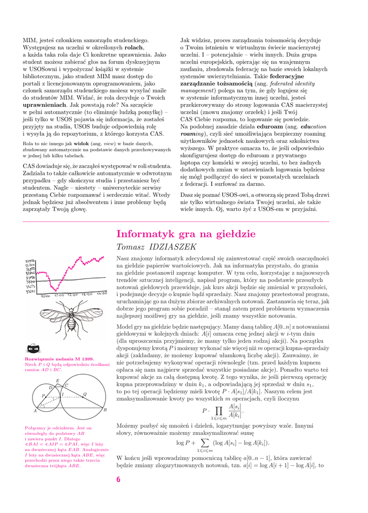 MIM, jesteś członkiem samorządu studenckiego. Występujesz na uczelni w określonych rolach, a każda taka rola daje Ci konkretne uprawnienia. Jako student możesz zabierać głos na forum dyskusyjnym w USOSowni i wypożyczać książki w systemie bibliotecznym, jako student MIM masz dostęp do portali z licencjonowanym oprogramowaniem, jako członek samorządu studenckiego możesz wysyłać maile do studentów MIM. Widać, że rola decyduje o Twoich uprawnieniach. Jak powstają role? Na szczęście w pełni automatycznie (to eliminuje ludzką pomyłkę) – jeśli tylko w USOS pojawia się informacja, że zostałeś przyjęty na studia, USOS buduje odpowiednią rolę i wysyła ją do repozytorium, z którego korzysta CAS. Rola to nic innego jak widok (ang. view ) w bazie danych, zbudowany automatycznie na podstawie danych przechowywanych w jednej lub kilku tabelach. CAS dowiaduje się, że zacząłeś występować w roli studenta. Zadziała to także całkowicie automatycznie w odwrotnym przypadku – gdy skończysz studia i przestaniesz być studentem. Nagle – niestety – uniwersyteckie serwisy przestaną Ciebie rozpoznawać i serdecznie witać. Wtedy jednak będziesz już absolwentem i inne problemy będą zaprzątały Twoją głowę. Jak widzisz, proces zarządzania tożsamością decyduje o Twoim istnieniu w wirtualnym świecie macierzystej uczelni. I – potencjalnie – wielu innych. Duża grupa uczelni europejskich, opierając się na wzajemnym zaufaniu, zbudowała federację na bazie swoich lokalnych systemów uwierzytelniania. Takie federacyjne zarządzanie tożsamością (ang. federated identity management) polega na tym, że gdy logujesz się w systemie informatycznym innej uczelni, jesteś przekierowywany do strony logowania CAS macierzystej uczelni (znowu znajomy orzełek) i jeśli Twój CAS Ciebie rozpozna, to logowanie się powiedzie. Na podobnej zasadzie działa eduroam (ang. education roaming), czyli sieć umożliwiająca bezpieczny roaming użytkowników jednostek naukowych oraz szkolnictwa wyższego. W praktyce oznacza to, że jeśli odpowiednio skonfigurujesz dostęp do eduroam z prywatnego laptopa czy komórki w swojej uczelni, to bez żadnych dodatkowych zmian w ustawieniach logowania będziesz się mógł podłączyć do sieci w pozostałych uczelniach z federacji. I surfować za darmo. Dasz się poznać USOS-owi, a otworzą się przed Tobą drzwi nie tylko wirtualnego świata Twojej uczelni, ale także wiele innych. Oj, warto żyć z USOS-em w przyjaźni. Informatyk gra na giełdzie Tomasz IDZIASZEK Nasz znajomy informatyk zdecydował się zainwestować część swoich oszczędności na giełdzie papierów wartościowych. Jak na informatyka przystało, do grania na giełdzie postanowił zaprząc komputer. W tym celu, korzystając z najnowszych trendów sztucznej inteligencji, napisał program, który na podstawie przeszłych notowań giełdowych przewiduje, jak kurs akcji będzie się zmieniał w przyszłości, i podejmuje decyzje o kupnie bądź sprzedaży. Nasz znajomy przetestował program, uruchamiając go na dużym zbiorze archiwalnych notowań. Zastanawia się teraz, jak dobrze jego program sobie poradził – stanął zatem przed problemem wyznaczenia najlepszej możliwej gry na giełdzie, jeśli znamy wszystkie notowania. Rozwiązanie zadania M 1399. Niech P i Q będą odpowiednio środkami ramion AD i BC. Model gry na giełdzie będzie następujący. Mamy daną tablicę A[0..n] z notowaniami giełdowymi w kolejnych dniach: A[i] oznacza cenę jednej akcji w i-tym dniu (dla uproszczenia przyjmiemy, że mamy tylko jeden rodzaj akcji). Na początku dysponujemy kwotą P i możemy wykonać nie więcej niż m operacji kupna-sprzedaży akcji (zakładamy, że możemy kupować ułamkową liczbę akcji). Zauważmy, że nie potrzebujemy wykonywać operacji równolegle (tzn. przed każdym kupnem opłaca się nam najpierw sprzedać wszystkie posiadane akcje). Ponadto warto też kupować akcje za całą dostępną kwotę. Z tego wynika, że jeśli pierwszą operację kupna przeprowadzimy w dniu k1 , a odpowiadającą jej sprzedaż w dniu s1 , to po tej operacji będziemy mieli kwotę P · A[s1 ]/A[k1 ]. Naszym celem jest zmaksymalizowanie kwoty po wszystkich m operacjach, czyli iloczynu Y A[si ] . P· A[ki ] 1¬i¬m Połączmy je odcinkiem. Jest on równoległy do podstawy AB i zawiera punkt I. Dlatego ) BAI = < ) AIP = < ) P AI, więc I leży < na dwusiecznej kąta EAB. Analogicznie I leży na dwusiecznej kąta ABE, więc przechodzi przez niego także trzecia dwusieczna trójkąta ABE. Możemy pozbyć się mnożeń i dzieleń, logarytmując powyższy wzór. Innymi słowy, równoważnie możemy zmaksymalizować sumę X log P + (log A[si ] − log A[ki ]). 1¬i¬m W końcu jeśli wprowadzimy pomocniczą tablicę a[0..n − 1], która zawierać będzie zmiany zlogarytmowanych notowań, tzn. a[i] = log A[i + 1] − log A[i], to 6 Rys. 1. Przykładowa tablica a dla n = 9. Optymalne rozwiązanie dla m = 2 to dwa zaznaczone fragmenty o sumach 7 i 6. Przedział i fragment oznaczają w tym artykule to samo, używamy jednak dwóch nazw, by łatwo było wyrazić operację znajdowania przedziału o maksymalnej sumie, który zawiera się w pewnym ustalonym przedziale. Mówimy wtedy, że szukamy „maksymalnego fragmentu w zadanym przedziale”. Piszemy również, że znajdujemy maksymalny fragment, choć opisane algorytmy wyznaczają jedynie sumę liczb w tym fragmencie. Modyfikację algorytmów, by wyznaczały również końce fragmentu, pozostawiamy jako ćwiczenie dla Czytelników. nasze zadanie sprowadzi się do wybrania co najwyżej m rozłącznych fragmentów [ki , si ), które maksymalizują sumę liczb do nich należących (rys. 1): X (a[ki ] + a[ki + 1] + . . . + a[si − 1]). 1¬i¬m Dla m = 1 jest to klasyczne zadanie znajdowania fragmentu tablicy o największej sumie, które może być znane Czytelnikom. Z kolei jego uogólnienie dla m 2 było treścią zadania p