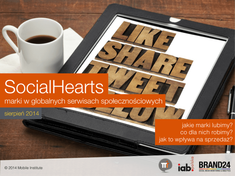 SocialHearts marki w globalnych serwisach społecznościowych sierpień 2014 jakie marki lubimy? co dla nich robimy? jak to wpływa na sprzedaż? © 2014 Mobile Institute na wstępie… Media społecznościowe dosyć dawno wtargnęły do Polski i zawładnęły codziennym życiem dużej części z nas. Miliony Polaków nie wyobrażają sobie już bez nich życia. Nasze konta społecznościowe mają często po kilka lat. Według wyników majowych Megapanel PBI/Gemius zasięg Facebook w Polsce to 77% i 16,7 mln Polaków (wzrost o 591 tys. od marca), a 15,56 mln w przypadku YouTube. W USA mówi się już od jakiegoś czasu o tzw. syndromie SMAD czyli Social Media Addicted Disorder. Badania podają, że przeciętny pracownik w USA spędza 24% swojego czasu pracy korzystając z różnych mediów społecznościowych, a powrót po takiej wycieczce w wirtualny świat społecznościowy do wykonywania realnej pracy zajmuje mu średnio 23 minuty. Według dostępnych danych 21% kobiet w Stanach budzi się w środku nocy, żeby sprawdzić status na Facebooku, a 27% kobiet i mężczyzn sprawdza status będąc w toalecie. Dziwne dane, powiecie, ale wystarczy spojrzeć na przebieg współczesnych świąt albo poobserwować przez chwilę pary w warszawskiej czy sopockiej restauracji, żeby stwierdzić, że być może SMAD nie jest tak odległą przyszłością nawet u nas. A jednak pomimo tak wielkiej popularności mediów społecznościowych, dla biznesu w Polsce, pewne pytania wciąż pozostają bez odpowiedzi, szczególnie takiej wprost w postaci recepty na efektywne działania w tym kanale komunikacji. Wobec tego my pokusiliśmy się o ich pozyskanie, a w tym najważniejszej - czy social media sprzedają? W szczególności Facebook. Oprócz tego spytaliśmy użytkowników social media o zasięgu globalnym o to: czy i dlaczego lubią marki w mediach społecznościowych? za co je lubią? co marki powinny robić, żeby zaskarbić sobie sympatię fanów? Jeżeli któreś z tych pytań jest tym, które zadajecie sobie na co dzień, albo chociaż czasem, prowadząc swój biznes - ten raport jest zdecydowanie dla Was! Zapraszam do lektury SocialHearts, a na wszelkie pytania, uwagi i pomysły czekam pod mailem. ! ! Katarzyna Czuchaj-Łagód Chief Research Officer, Mobile Institute autor bloga 6na5kobiet.pl [email protected] © 2014 Mobile Institute w raporcie • kogo przebadaliśmy - nasi respondenci • korzystanie z social media - kiedy, z ilu, jakich mediów korzystamy • biznes w social media - czy miejsce marek jest w social media • o kontencie - co marka powinna komunikować • statystyki - jakie i ile marek lubimy • aktywności konsumenckie - co robimy dla marek • wizerunek - co myślimy o markach aktywnych w social media patronat © 2014 Mobile Institute 3 Kogo przebadaliśmy? © 2014 Mobile Institute o badaniu… Sondaż SocialHearts został przeprowadzony w dniach 6-10 maja 2014 techniką CAWI i CAMI (Computer Assissted Web Interviewing i Computer Assisted Mobile Interviewing) metodą Real Time Sampling (emisja ankiet na stronach internetowych). Uczestników badania pozyskiwaliśmy wśród użytkowników kluczowych międzynarodowych serwisów społecznościowych obecnych w Polsce (Facebook, Google+, Twitter i LinkedIn) oraz blogów mających swoje konta w tych serwisach społecznościowych. Próba nie jest reprezentatywna dla populacji internautów w Polsce ale naszym celem było zdobycie opinii internautów korzystających z najpopularniejszych serwisów społecznościowych o globalnym zasięgu, także pod kątem biznesowym. Ten cel zdecydowanie udało się nam zrealizować. Pozyskaliśmy odpowiedzi N=750 takich osób. Nasza próba charakteryzuje się niewielką nadreprezentacją mężczyzn w stosunku do próby internautów (57% vs 51%). Ze względu na specyfikę zagadnienia badaliśmy osoby w wieku powyżej 15 lat. SocialHearts to pierwsze badanie o social media przeprowadzone wyłącznie w kanale social media Płeć (N=750) Wiek (N=750) 1% 8% 1% 27% 32% 15-18 18-24 25-34 35-44 45-54 >55 43% 57% 31% © 2014 Mobile Institute 5 Kobieta Mężczyzna o badaniu… Strukturę próby naszego badania ze względu na używanie poszczególnych serwisów społecznościowych pokazujemy na wykresie obok. Respondenci najczęściej korzystali z Facebook (78%), YouTube (73%), Spotify (42%), Twitter (38%), Instagram (38%) i Google+ (24%). Pozostałe serwisy, o które zapytaliśmy, takie jak LinkedIn, Snapchat, GoldenLine, Foursquare, Pinterest, NK.pl i Foodspotting uzyskały wskazania poniżej 20%. Struktura próby pod względem używalności serwisów społecznościowych (N=750) 78% Facebook 73% YouTube W stosunku do wyników Megapanel PBI/Gemius uzyskaliśmy mniejszą liczbę użytkowników YouTube i NK.pl, przy czym NK.pl jako serwis polski nie stanowił głównego obszaru naszego zainteresowania, a sondaż prowadziliśmy na osobach w wieku powyżej 15 lat, czyli grupie węższej niż w przypadku Megapanel PBI/Gemius. 42% Spotify Twitter 38% Instagram 38% Google+ 24% * użytkownik mógł wskazać więcej niż jedną odpowiedź Zaskakująco wysoka pozycja młodego serwisu Spotify Najpopularniejsze serwisy społecznościowe w Polsce wg Megapanel PBI/Gemius (zasięg >20%) 77% Facebook 72% YouTube NK.pl 27% źródło: Megapanel PBI/Gemius, maj 2014 © 2014 Mobile Institute 6 Korzystanie z social media © 2014 Mobile Institute wypowiedź ekspercka Mikołaj Winkiel Chief Evangelist, Brand 24 Rok 2014 wydaje się być bardzo stabilny jeżeli chodzi o serwisy społecznościowe w Polsce. Stabilne wzrosty liczby użytkowników Facebooka i Twittera świadczą o tym, że coraz więcej osób decyduje się na wejście w social media. Zmienia się też grupa docelowa na tych serwisach – najlepszym przykładem jest Twitter, gdzie jeszcze niedawno większość stanowili sportowcy, politycy i dziennikarze. Tymczasem, jak obserwujemy w wynikach monitoringu dla największych marek, znaczą część twitterowiczów stanowi