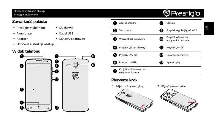 Skrócona instrukcja obsługi Prestigio MultiPhone Zawartość pakietu • Słuchawki • Akumulator • Kabel USB • Adapter • Stylowy pokrowiec • Skrócona instrukcja obsługi Widok telefonu 1 6 2 7 8 9 10 13 8 Głośnik 2 Słuchawka 9 Przycisk regulacji głośności 3 Wyświetlacz dotykowy 10 Przycisk włącznika/ wyłącznika zasilania 4 Przycisk „Ekran główny” 11 Przycisk „Wróć” 5 Przycisk „Menu” 12 Gniazdo słuchawek 6 Port mikro-USB 13 Aparat tylny 7 Czujnik zbliżeniowy oraz natężenia światła Pierwsze kroki 1.Zdjąć pokrywę tylną. 3 4 5 12 1 Aparat przedni 11 2.Wyjąć akumulator. PL • Prestigio MultiPhone Skrócona instrukcja obsługi Prestigio MultiPhone 3.Włożyć kartę SIM. 4.Włożyć kartę pamięci. Ładowanie telefonu PL Przyłączyć telefon do ładowarki podróżnej kablem USB, a ładowarkę do gniazda sieci elektrycznej. Operacje wykonywane opuszkami palców 5.Nałożyć pokrywę tylną. 6.Włączyć telefon, naciskając i przytrzymując przycisk przełącznika włączenia/ wyłączenia. Urządzenie obsługuje dwie (2) karty SIM wykorzystywane do połączeń głosowych oraz przesyłania danych. Podczas połączenia głosowego lub transferu danych z użyciem jednej karty SIM, druga karta jest nieaktywna (nie jest zalogowana w sieci operatora komórkowego, czyli nie może odbierać połączeń ani przesyłać danych). Po zakończeniu połączenia lub sesji przesyłu danych, obydwie karty SIM stają się ponownie aktywne i logują się do sieci operatorów. • Puknięcie • Przytrzymanie • Powiększenie • Zmniejszanie • Szybkie przesuwanie • Przesuwanie • Przewijanie • Przeciąganie Skrócona instrukcja obsługi Prestigio MultiPhone Nawiązywanie połączenia telefonicznego • Puknięcie ikony w celu wyświetlenia klawiatury i bezpośredniego wpisania numeru. • Puknięcie ikony w celu wyświetlenia listy kontaktów i wybranie kontaktu. 2.Puknięcie ikony Połącz. • P uknąć ikonę aplikacji na ekranie głównym lub w menu głównym, by uruchomić aplikację. Ekran główny jest miejscem dostępu do wszystkich funkcji telefonu. Ekran główny może zawierać wiele stron. Ukryte strony wyświetlane są szybkim przesuwaniem palca po ekranie w lewo lub w prawo. Dodawanie ikony aplikacji do ekranu głównego 1.Puknąć na ekranie głównym ikonę Tapeta. Dane techniczne Element Specyfikacja Procesor Wysokowydajny czterordzeniowy procesor 1,3 GHz Pamięć RAM 1GB+ROM 4GB eMMC, slot Micro SD obsługujący karty o pojemności do 32GB System operacyjny Android 4.2 , by wyświetlić menu, dotknąć i przytrzymać ikonę aplikacji, a następnie przeciągnąć ikonę na podgląd strony ekranu głównego. Ustawianie tapety Korzystanie z aplikacji Uruchamianie aplikacji Ekran główny Puknąć na ekranie głównym ikonę 2.Wybrać jedną z następujących opcji: Galeria, Tapety animowane, Tapeta wideo lub Tapety. 3.Wybrać ikonę i puknąć opcję Ustaw tapetę. Alternatywnie, wybrać obraz, wyskalować go przeciągnięciem ramki, a następnie puknąć przycisk OK. , a następnie opcję PL 1.Dostępne są następujące metody: Skrócona instrukcja obsługi Prestigio MultiPhone 5" QHD (960*540) IPS, dotykowy pojemnościowy Aparat fotograficzny Przedni 2 MP FF, tylny 8 MP auto ogniskowanie Pasma UMTS: 900/2100MHz;GSM: 900/1800MHz Złącza Micro USB 2.0, Micro SD (kompatybilne z micro SDHC) Komunikacja WiFi (802.11 b/g/n), 3G, Bluetooth 3.0 Akumulator 4000 mAh Wymiary 144*73.3*10.9 mm (Dł. x Szer. x Wys.) Waga 192 g PL Wyświetlacz Informacje dotyczące swoistego tempa pochłaniania energii Najwyższa wartość SAR dla niniejszego modelu PAP5503 DUO zarejestrowana podczas testu zgodności z normą wyniosła 0.397 W/kg (10g) według zaleceń ICNIRP. Ponieważ wyroby firmy Prestigio są na bieżąco unowocześniane i ulepszane, wygląd lub funkcjonalność zainstalowanego oprogramowania i/ lub komponentów sprzętowych może odbiegać od opisów przedstawionych w niniejszej „Skróconej instrukcji obsługi”. Firma Prestigio oświadcza, że przedmiotowy wyrób spełnia podstawowe wymogi i jest zgodny z innymi istotnymi uregulowaniami Dyrektywy 1999/5/EC. Pełna deklaracja zgodności jest dostępna na stronie: http://www.prestigio.com/compliance. By uniknąć potencjalnego uszkodzenia słuchu, należy unikać dłuższej ekspozycji na głośne dźwięki.