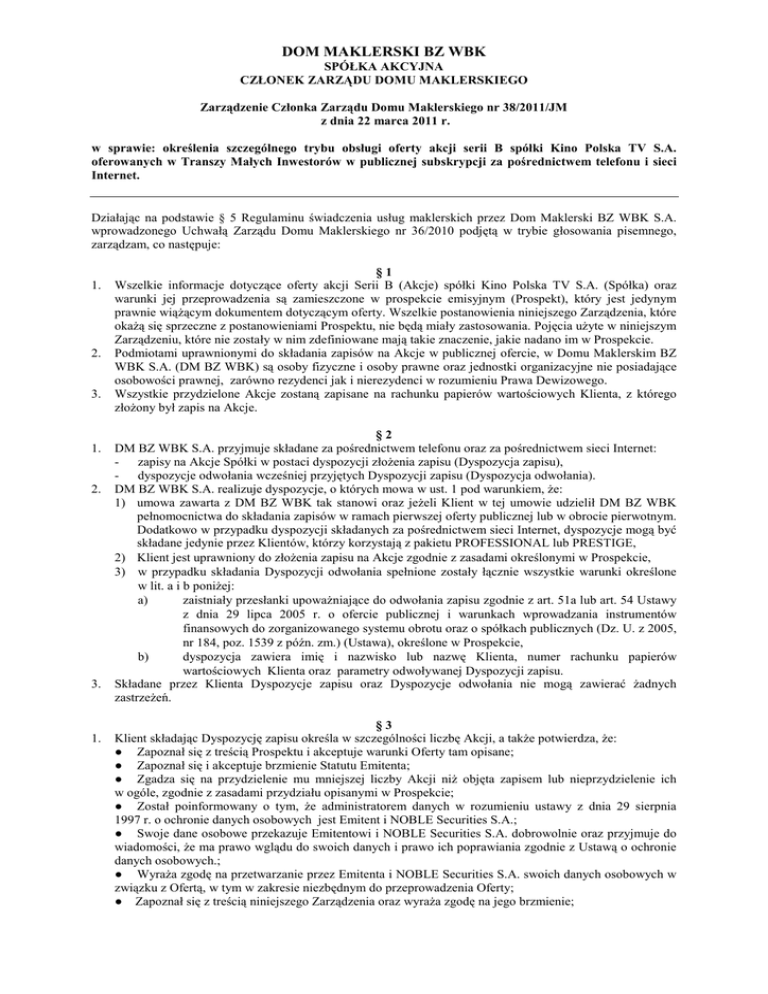 DOM MAKLERSKI BZ WBK SPÓŁKA AKCYJNA CZŁONEK ZARZĄDU DOMU MAKLERSKIEGO Zarządzenie Członka Zarządu Domu Maklerskiego nr 38/2011/JM z dnia 22 marca 2011 r. w sprawie: określenia szczególnego trybu obsługi oferty akcji serii B spółki Kino Polska TV S.A. oferowanych w Transzy Małych Inwestorów w publicznej subskrypcji za pośrednictwem telefonu i sieci Internet. Działając na podstawie § 5 Regulaminu świadczenia usług maklerskich przez Dom Maklerski BZ WBK S.A. wprowadzonego Uchwałą Zarządu Domu Maklerskiego nr 36/2010 podjętą w trybie głosowania pisemnego, zarządzam, co następuje: 1. 2. 3. 1. 2. 3. 1. §1 Wszelkie informacje dotyczące oferty akcji Serii B (Akcje) spółki Kino Polska TV S.A. (Spółka) oraz warunki jej przeprowadzenia są zamieszczone w prospekcie emisyjnym (Prospekt), który jest jedynym prawnie wiąŜącym dokumentem dotyczącym oferty. Wszelkie postanowienia niniejszego Zarządzenia, które okaŜą się sprzeczne z postanowieniami Prospektu, nie będą miały zastosowania. Pojęcia uŜyte w niniejszym Zarządzeniu, które nie zostały w nim zdefiniowane mają takie znaczenie, jakie nadano im w Prospekcie. Podmiotami uprawnionymi do składania zapisów na Akcje w publicznej ofercie, w Domu Maklerskim BZ WBK S.A. (DM BZ WBK) są osoby fizyczne i osoby prawne oraz jednostki organizacyjne nie posiadające osobowości prawnej, zarówno rezydenci jak i nierezydenci w rozumieniu Prawa Dewizowego. Wszystkie przydzielone Akcje zostaną zapisane na rachunku papierów wartościowych Klienta, z którego złoŜony był zapis na Akcje. §2 DM BZ WBK S.A. przyjmuje składane za pośrednictwem telefonu oraz za pośrednictwem sieci Internet: - zapisy na Akcje Spółki w postaci dyspozycji złoŜenia zapisu (Dyspozycja zapisu), - dyspozycje odwołania wcześniej przyjętych Dyspozycji zapisu (Dyspozycja odwołania). DM BZ WBK S.A. realizuje dyspozycje, o których mowa w ust. 1 pod warunkiem, Ŝe: 1) umowa zawarta z DM BZ WBK tak stanowi oraz jeŜeli Klient w tej umowie udzielił DM BZ WBK pełnomocnictwa do składania zapisów w ramach pierwszej oferty publicznej lub w obrocie pierwotnym. Dodatkowo w przypadku dyspozycji składanych za pośrednictwem sieci Internet, dyspozycje mogą być składane jedynie przez Klientów, którzy korzystają z pakietu PROFESSIONAL lub PRESTIGE, 2) Klient jest uprawniony do złoŜenia zapisu na Akcje zgodnie z zasadami określonymi w Prospekcie, 3) w przypadku składania Dyspozycji odwołania spełnione zostały łącznie wszystkie warunki określone w lit. a i b poniŜej: a) zaistniały przesłanki upowaŜniające do odwołania zapisu zgodnie z art. 51a lub art. 54 Ustawy z dnia 29 lipca 2005 r. o ofercie publicznej i warunkach wprowadzania instrumentów finansowych do zorganizowanego systemu obrotu oraz o spółkach publicznych (Dz. U. z 2005, nr 184, poz. 1539 z późn. zm.) (Ustawa), określone w Prospekcie, b) dyspozycja zawiera imię i nazwisko lub nazwę Klienta, numer rachunku papierów wartościowych Klienta oraz parametry odwoływanej Dyspozycji zapisu. Składane przez Klienta Dyspozycje zapisu oraz Dyspozycje odwołania nie mogą zawierać Ŝadnych zastrzeŜeń. §3 Klient składając Dyspozycję zapisu określa w szczególności liczbę Akcji, a takŜe potwierdza, Ŝe: ● Zapoznał się z treścią Prospektu i akceptuje warunki Oferty tam opisane; ● Zapoznał się i akceptuje brzmienie Statutu Emitenta; ● Zgadza się na przydzielenie mu mniejszej liczby Akcji niŜ objęta zapisem lub nieprzydzielenie ich w ogóle, zgodnie z zasadami przydziału opisanymi w Prospekcie; ● Został poinformowany o tym, Ŝe administratorem danych w rozumieniu ustawy z dnia 29 sierpnia 1997 r. o ochronie danych osobowych jest Emitent i NOBLE Securities S.A.; ● Swoje dane osobowe przekazuje Emitentowi i NOBLE Securities S.A. dobrowolnie oraz przyjmuje do wiadomości, Ŝe ma prawo wglądu do swoich danych i prawo ich poprawiania zgodnie z Ustawą o ochronie danych osobowych.; ● WyraŜa zgodę na przetwarzanie przez Emitenta i NOBLE Securities S.A. swoich danych osobowych w związku z Ofertą, w tym w zakresie niezbędnym do przeprowadzenia Oferty; ● Zapoznał się z treścią niniejszego Zarządzenia oraz wyraŜa zgodę na jego brzmienie; 2. 3. 1. 2. 3. 1. 2. 3. 4. 5. 1. 2. Składając Dyspozycję odwołania Klient potwierdza, Ŝe: - zapoznał się z treścią niniejszego Zarządzenia oraz zna warunki realizacji Dyspozycji odwołania określone w § 2 niniejszego Zarządzenia i wyraŜa zgodę na ich brzmienie, - w przypadku zrealizowania Dyspozycji odwołania, odwoływany zapis zostanie odwołany lub odwoływana Dyspozycja zapisu nie zostanie wykonana, - przyjął do wiadomości, Ŝe złoŜenie Dyspozycji odwołania jest nieodwołalne. DM BZ WBK S.A. nie ponosi odpowiedzialności za przydzielenie mniejszej liczby Akcji Spółki niŜ określona w zapisie lub za nieprzydzielenie ich w ogóle, zgodnie z odpowiednimi zapisami Prospektu. §4 DM BZ WBK blokuje środki na opłacenie zapisu na Akcje na rachunku Klienta, z którego składana jest Dyspozycja zapisu. Na opłacenie zapisu wykorzystane mogą być jedynie wolne środki finansowe. W systemie „Inwestor online” środki takie oznaczone są jako „Środki pod wypłatę lub zlecenia na rynek terminowy”. Środki na opłacenie zapisu w wysokości równej wartości zapisu (iloczyn liczby Akcji i Ceny emisyjnej powiększone o kwotę prowizji maklerskiej muszą znajdować się na rachunku Klienta w chwili składania Dyspozycji zapisu. W przeciwnym wypadku Dyspozycja zapisu nie zostanie przyjęta. W przypadku wystąpienia przyczyn powodujących konieczność zwrotu całości lub części kwoty wpłaconej na opłacenie zapisu, zwrot ten zostanie dokonany na rachunek pienięŜny słuŜący do obsługi rachunku papierów wartościowych, z którego złoŜony był zapis na Akcje. §5 Dyspozycje zapisu składane za pośrednictwem telefonu przyjmowane będą w terminie składania zapisów