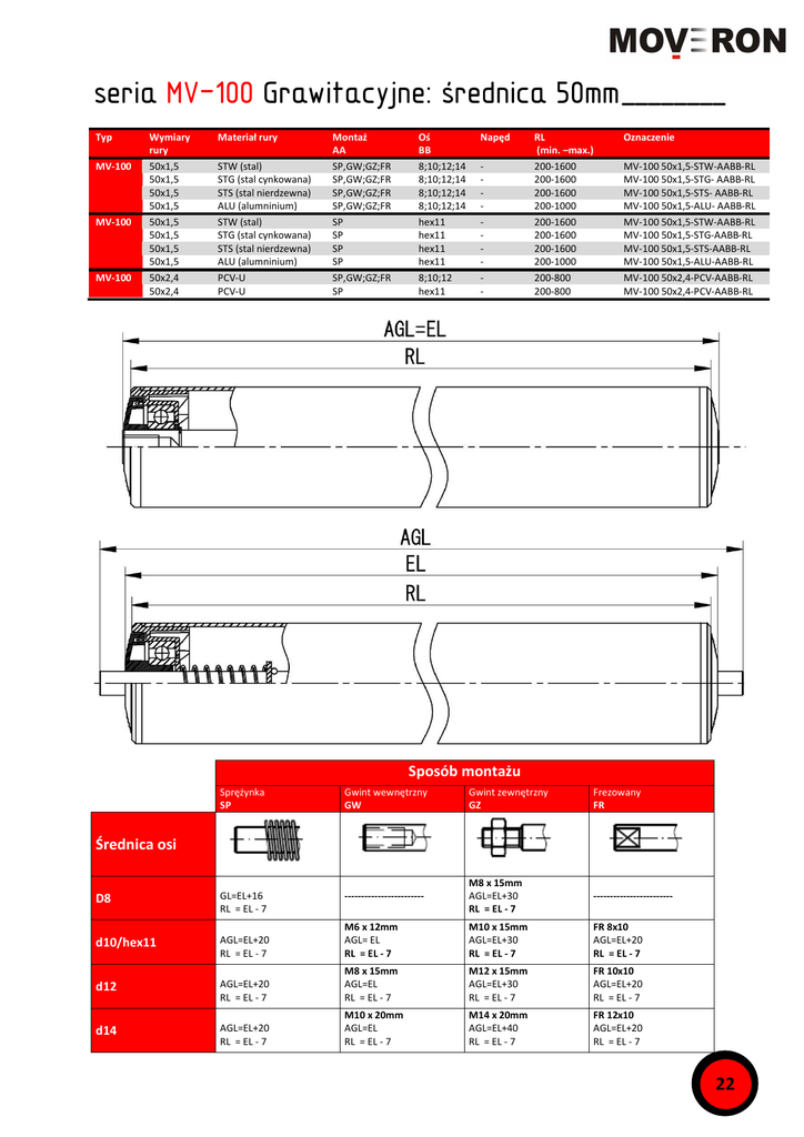 seria MV-100 Grawitacyjne: średnica 50mm________ Typ MV-100 MV-100 MV-100 Wymiary rury 50x1,5 50x1,5 50x1,5 50x1,5 50x1,5 50x1,5 50x1,5 50x1,5 50x2,4 50x2,4 Materiał rury STW (stal) STG (stal cynkowana) STS (stal nierdzewna) ALU (alumninium) STW (stal) STG (stal cynkowana) STS (stal nierdzewna) ALU (alumninium) PCV-U PCV-U Montaż AA SP,GW;GZ;FR SP,GW;GZ;FR SP,GW;GZ;FR SP,GW;GZ;FR SP SP SP SP SP,GW;GZ;FR SP Oś BB 8;10;12;14 8;10;12;14 8;10;12;14 8;10;12;14 hex11 hex11 hex11 hex11 8;10;12 hex11 Napęd - RL (min. –max.) 200-1600 200-1600 200-1600 200-1000 200-1600 200-1600 200-1600 200-1000 200-800 200-800 Oznaczenie MV-100 50x1,5-STW-AABB-RL MV-100 50x1,5-STG- AABB-RL MV-100 50x1,5-STS- AABB-RL MV-100 50x1,5-ALU- AABB-RL MV-100 50x1,5-STW-AABB-RL MV-100 50x1,5-STG-AABB-RL MV-100 50x1,5-STS-AABB-RL MV-100 50x1,5-ALU-AABB-RL MV-100 50x2,4-PCV-AABB-RL MV-100 50x2,4-PCV-AABB-RL Sposób montażu Sprężynka SP Gwint wewnętrzny GW Gwint zewnętrzny GZ Frezowany FR D8 GL=EL+16 RL = EL - 7 ------------------------ M8 x 15mm AGL=EL+30 RL = EL - 7 ------------------------ d10/hex11 AGL=EL+20 RL = EL - 7 M6 x 12mm AGL= EL RL = EL - 7 M10 x 15mm AGL=EL+30 RL = EL - 7 FR 8x10 AGL=EL+20 RL = EL - 7 d12 AGL=EL+20 RL = EL - 7 M8 x 15mm AGL=EL RL = EL - 7 M12 x 15mm AGL=EL+30 RL = EL - 7 FR 10x10 AGL=EL+20 RL = EL - 7 d14 AGL=EL+20 RL = EL - 7 M10 x 20mm AGL=EL RL = EL - 7 M14 x 20mm AGL=EL+40 RL = EL - 7 FR 12x10 AGL=EL+20 RL = EL - 7 Średnica osi 22 MV-100C Przeznaczenie: rolki grawitacyjne, stożkowe do budowy łuków przenośników do transportu wewnętrznego materiałów lekkich i średnio ciężkich Przemieszczane towary: paczki, worki, kartony Rura/ stożki: wewnętrzne rury ze stali cynkowanej (średnica zew. 50mm), stal kwasoodporna(średnica zew. 50mm), nasadki stożkowe o średnicy minimalnej stożka 53,4mm i kącie rozwarcia stożka 3,6o wykonane z polipropylenu. Oś: d10; hex11; d12; d14 wykonane z precyzyjnych prętów ciągnionych, Łożyska: łożyska precyzyjne 6202 (ZZ lub 2RS) , Oprawy: polipropylenowe (PP) oprawy łożyskowe, Prędkość: liniowa ładunku 1,2 m/s Opcje: niestandardowe położenie początku stożka, Obciążalność: maksymalnie 50daN obciążenia ciągłego na rolkę. 23 Projektowanie łuków: Oz [Ty Ow 900 Ustalenie promienia wewnętrznego łuku, Projektowanie łuków należy rozpocząć od ustalenia promienia wewnętrznego Rw, mierzonego od środka łuku do wewnętrznej strony burty –początku długości montażowej rolki EL. Za optymalne należy przyjąć promień wewnętrzny Rw mieszczący się w przedziale od 700 do 900mm. Dla łuków z tego przedziału, przy zastosowaniu maksymalnej liczby rolek uzyskujemy minimalne kąty między tworzącymi stożków sąsiadujących rolek. Dla łuku o Rw=900mm zbudowanego z maksymalnej liczby 25 rolek kąt ten wynosi 0 stopni. Ustalenie szerokości łuku przenośnika czyli długości montażowej (EL), Wartość długości minimalnej (EL min) rolek tworzących łuk przenośnika zależy od wymiarów transportowanego ładunku i może zostać wyliczone ze wzoru. EL = 50~150 Ustalenie liczby rolek w łuku i rozstawu otworów montażowych w burtach łuku przenośnika. Rw 700mm 750mm 800mm 850mm 900mm max. Liczba rolek Ow 20 21 23 24 25 55,5mm 56,5mm 54,8mm 55,7 56,5mm Maksymalną liczbę rolek podaje powyższa tabela. Dla danej liczby rolek i promienia Rw podano rozstaw otworów montażowych w wewnętrznej burcie łuku. Dla dowolnej wartości Rw i dowolnej liczby rolek (Li) obliczenia Ow można wykonać wg wzoru Ow=1,507xRw/(Li-1). Wartość Oz wylicza się wg wzoru Oz=Ow Rz /Rw 24 Rolki stożkowe mogą być zbudowane maksymalnie z 10 segmentów. Oznacza to, że długość EL rolki grawitacyjnej, stożkowej zbudowanej z 10 elementów będzie wynosiło 989,5mm. Na poniższym rysunku pokazano wartości średnic na końcu poszczególnych segmentów tworzących rolkę stożkową. 25 seria MV-100C Grawitacyjne, stoŜkowe: 50mm_____ Typ MV-100C MV-100C Wymiary rury 50x1,5 50x1,5 50x1,5 50x1,5 Materiał rury STG (stal cynkowana) STS (stal nierdzewna) STG (stal cynkowana) STS (stal nierdzewna) Montaż AA SP,GW;GZ;FR SP,GW;GZ;FR SP SP Oś BB 10;12;14 10;12;14 hex11 hex11 Napęd - RL (min. –max.) 250-900 250-900 250-900 250-900 Oznaczenie MV-100C 50x1,5-STG- AABB-RL MV-100C 50x1,5-STS- AABB-RL MV-100C 50x1,5-STG-AABB-RL MV-100C 50x1,5-STS-AABB-RL Sposób montażu Sprężynka SP Gwint wewnętrzny GW Gwint zewnętrzny GZ Frezowany FR D8 AGL=EL+20 RL = EL - 11 ----------------- M8 x 15mm AGL=EL+30 RL = EL - 11 ---------------- d10/hex11 AGL=EL+20 RL = EL - 11 M6 x 12mm AGL= EL RL = EL - 11 M10 x 15mm AGL=EL+30 RL = EL - 11 FR 8x10 AGL=EL+20 RL = EL - 11 d12 AGL=EL+20 RL = EL - 11 M8 x 15mm AGL=EL RL = EL - 11 M12 x 15mm AGL=EL+30 RL = EL - 11 FR 10x10 AGL=EL+20 RL = EL - 11 d14 AGL=EL+20 RL = EL - 11 M10 x 20mm AGL=EL RL = EL - 11 M14 x 20mm AGL=EL+40 RL = EL - 11 FR 12x10 AGL=EL+20 RL = EL - 11 Średnica osi 26 Opcjonalnie możliwe jest zamówienie rolki stożkowej z przesuniętym początkiem najmniejszego segmentu. Wartość przesunięcia A w mm pokazaną na rysunku należy podać przy zamawianiu takiej opcji rolki stożkowej, grawitacyjnej. 27
