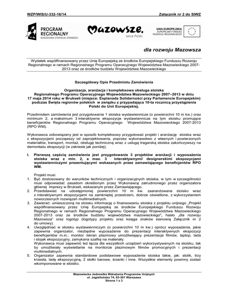 WZP/WIS/U-332-16/14 Załącznik nr 2 do SIWZ dla rozwoju Mazowsza Wydatek współfinansowany przez Unię Europejską ze środków Europejskiego Funduszu Rozwoju Regionalnego w ramach Regionalnego Programu Operacyjnego Województwa Mazowieckiego 20072013 oraz ze środków budżetu Województwa Mazowieckiego Szczegółowy Opis Przedmiotu Zamówienia Organizacja, aranżacja i kompleksowa obsługa stoiska Regionalnego Programu Operacyjnego Województwa Mazowieckiego 2007–2013 w dniu 17 maja 2014 roku w Brukseli (miejsce: Esplanada Solidarności przy Parlamencie Europejskim) podczas Święta regionów polskich w związku z przypadająca 10-ta rocznicą przystąpienia Polski do Unii Europejskiej. Przedmiotem zamówienia jest przygotowanie 1 stoiska wystawiennicze (o powierzchni 10 m kw.) oraz minimum 2, a maksimum 3 interaktywne ekspozycje wystawiennicze na tym stoisku promujące beneficjentów Regionalnego Programu Operacyjnego Województwa Mazowieckiego 2007-2013 (RPO WM). Wykonawca zobowiązany jest w sposób kompleksowy przygotować projekt i aranżację stoiska wraz z ekspozycjami począwszy od zaprojektowania, poprzez wykonawstwo z własnych i powierzonych materiałów, transport, montaż, obsługę techniczną wraz z usługą tragarską stoiska zakończywszy na demontażu ekspozycji (w zakresie jak poniżej). I. Pierwszą częścią zamówienia jest przygotowanie 3 projektów aranżacji i wyposażenia stoiska wraz z min. 2, a max. 3 interaktywnymi/ designerskimi ekspozycjami wystawienniczymi prezentującymi wskazanych przez zamawiającego beneficjentów RPO WM. Projekt musi: 1. Być dostosowany do warunków technicznych i organizacyjnych stoiska, w tym w szczególności musi odpowiadać zasadom określonym przez Wykonawcę zatrudnionego przez organizatora głównej imprezy w Brukseli, wskazanym przez Zamawiającego. 2. Przedstawiać na udostępnionej powierzchni 10 m kw. zaaranżowane stoisko wraz z interaktywnymi ekspozycjami na zamkniętej przestrzeni, dobrze oświetlone, z wykorzystaniem nowoczesnych rozwiązań multimedialnych. 3. Zawierać: umieszczoną na stoisku informację o finansowaniu stoiska z projektu unijnego „Projekt współfinansowany przez Unię Europejską ze środków Europejskiego Funduszu Rozwoju Regionalnego w ramach Regionalnego Programu Operacyjnego Województwa Mazowieckiego 2007-2013 oraz ze środków budżetu województwa mazowieckiego", hasło „dla rozwoju Mazowsza” oraz logotyp (logotypy projektu oraz księga znaków stanowią Załącznik nr 2 do umowy). 4. Uwzględniać w stoisku wystawienniczym (o powierzchni 10 m kw.) oprócz wyposażenia, jakie zapewnia organizator, niezbędne wyposażenie do prezentacji interaktywnych ekspozycji beneficjentów m.in.: monitor /ekran plazmowy umożliwiający prezentacje filmów, laptop, lada i stojak ekspozycyjny, zamykana szafkę na materiały. Wykonawca musi zapewnić też łącza dla wszystkich urządzeń wykorzystywanych na stoisku, tak by umożliwiały wyświetlanie na monitorze plazmowym filmów promocyjnych i prezentacji multimedialnych. 5. Organizator zapewnia standardowe podstawowe wyposażenie stoiska takie, jak: stolik, trzy krzesła, ladę ekspozycyjną, 2 stołki barowe, ścianki i inne. Wszystkie elementy powinny zostać wkomponowane w stoisko. Mazowiecka Jednostka Wdrażania Programów Unijnych ul. Jagiellońska 74, 03-301 Warszawa Strona 1 z 3 WZP/WIS/U-332-16/14 Załącznik nr 2 do SIWZ 6. Wykonawca musi zaproponować aranżację stoiska wystawienniczego w dostarczone przez Zamawiającego informacje/zdjęcia, które zostaną przez Wykonawcę dopracowane graficznie, dostosowane do wydruku i zamontowane na ściance stoiska w formie wydruku na szkle lub innym materiale zastosowanym przez Wykonawcę (nie może być w formie wydruku papierowego). Plansze mają być podświetlone od wewnątrz. 7. Wykonawca musi zaproponować interaktywną aranżację od 2 do 3 projektów beneficjentów Regionalnego Programu Operacyjnego Województwa Mazowieckiego, wskazanych przez Zamawiającego. Kontakt i nawiązanie współpracy ze wskazanym beneficjentem/ami celem przygotowania w/w projektów eksponowanych na stoisku zostanie wskazany przez Zamawiającego. 8. Wykonawca musi uwzględnić wymagania w zakresie instalacji wod.-kan. i elektrycznej przypisane do powierzchni wystawienniczej wynajętej przez Zamawiającego, zgodnie ze specyfikacją przesłaną od Organizatora (lub po uzgodnieniach z Organizatorem). Wykonawca w terminie do 7 dni od dnia podpisania umowy z Zamawiającym dostarczy do Zamawiającego co najmniej 3 różne projekty stoiska. Każdy projekt ma być sporządzony w wersji papierowej i elektronicznej, obejmującej co najmniej siatkę rzutów (z przodu, z boku, z góry), wizualizację stoiska z opcją włączonego i wyłączonego oświetlenia oraz wymiary poszczególnych elementów. Zamawiający w terminie 5 dni od daty dostarczenia przez Wykonawcę propozycji projektów dokona wyboru projektu stoiska. Wykonawca zobowiązany jest uwzględnić wszelkie uwagi Zamawiającego oraz Organizatora zgłoszone do projektu. II. Drugą częścią zamówienia jest wykonanie stoiska. W ramach tego etapu Wykonawca dokona aranżacji, organizacji instalacji stoiska na powierzchni wystawienniczej wskazanej/wynajętej przez Zamawiającego i Organizatora, zgodnie z projektem zaakceptowanym i wybranym przez Zamawiającego, z materiałów Wykonawcy lub dostarczonych przez Zamawiającego, zgodnie z zasadami określonymi przez Organizatora całej imprezy, w dniu poprzedzającym wydarzenie, tj. 16.05.2014 r. Dodatkowo Wykonawca zapewni transport materiałów promocyjnych Zamawiającego oraz wyposażenia /ekspozycji prezentowanej na Stoisku obejmującego materiały informacyjno-promocyjne − publikacje (maksymalnie do ok. 3 000 kg), materiałów promocyjnych (maksymalnie do ok. 1 500 kg), eksponatów i innych niezbędnych elementów do zabudowy Stoiska w Brukseli na trasie z Warszawy do Brukseli i z Brukseli do Warszawy. Po pod