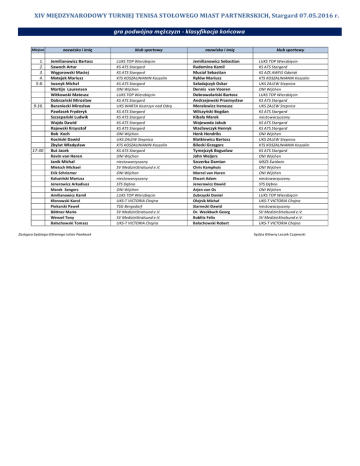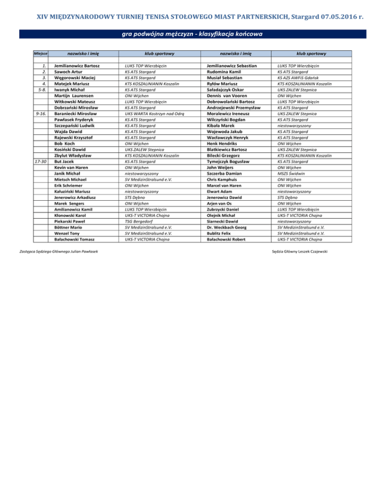 XIV MIĘDZYNARODOWY TURNIEJ TENISA STOŁOWEGO MIAST PARTNERSKICH, Stargard 07.05.2016 r. gra podwójna mężczyzn - klasyfikacja końcowa Miejsce nazwisko i imię 1. 2. 3. 4. 5-8. Jemilianowicz Bartosz Sawoch Artur Węgorowski Maciej Matejek Mariusz Iwanyk Michał Martijn Laurensen Witkowski Mateusz Dobrzański Mirosław Baraniecki Mirosław Pawłasek Fryderyk Szczepański Ludwik Wajda Dawid Rajewski Krzysztof Bob Koch Kosiński Dawid Zbylut Władysław But Jacek Kevin van Haren Janik Michał 9-16. 17-30 Mietsch Michael Erik Schriemer Kałuziński Mariusz Jenerowicz Arkadiusz Marek Sengers Amilianowicz Kamil Kłonowski Karol Piekarski Paweł Böttner Mario Wenzel Tony Bałachowski Tomasz Zastępca Sędziego Głównego Julian Pawłasek klub sportowy LUKS TOP Wierzbięcin KS ATS Stargard KS ATS Stargard KTS KOSZALINIANIN Koszalin KS ATS Stargard ONI Wijchen LUKS TOP Wierzbięcin KS ATS Stargard UKS WARTA Kostrzyn nad Odrą KS ATS Stargard KS ATS Stargard KS ATS Stargard KS ATS Stargard ONI Wijchen UKS ZALEW Stepnica KTS KOSZALINIANIN Koszalin KS ATS Stargard ONI Wijchen niestowarzyszony SV MedizinStralsund e.V. ONI Wijchen niestowarzyszony STS Dębno ONI Wijchen LUKS TOP Wierzbięcin UKS-T VICTORIA Chojna TSG Bergedorf SV MedizinStralsund e.V. SV MedizinStralsund e.V. UKS-T VICTORIA Chojna nazwisko i imię Jemilianowicz Sebastian Rudomina Kamil Musiał Sebastian Ryłów Mariusz Saładajczyk Oskar Dennis van Vooren Dobrowolański Bartosz Andrzejewski Przemysław Moralewicz Ireneusz Wilczyński Bogdan Kibała Marek Wojewoda Jakub Wacławczyk Henryk Henk Hendriks Blatkiewicz Bartosz Bilecki Grzegorz Tymejczyk Bogusław John Weijers Szczerba Damian Chris Kamphuis Marcel van Haren Elwart Adam Jenerowicz Dawid Arjen van Os Zubrzycki Daniel Olejnik Michał Siarnecki Dawid Dr. Weckbach Georg Bublitz Felix Bałachowski Robert klub sportowy LUKS TOP Wierzbięcin KS ATS Stargard KS AZS AWFiS Gdańsk KTS KOSZALINIANIN Koszalin UKS ZALEW Stepnica ONI Wijchen LUKS TOP Wierzbięcin KS ATS Stargard UKS ZALEW Stepnica KS ATS Stargard niestowarzyszony KS ATS Stargard KS ATS Stargard ONI Wijchen UKS ZALEW Stepnica KTS KOSZALINIANIN Koszalin KS ATS Stargard ONI Wijchen MSZS Świdwin ONI Wijchen ONI Wijchen niestowarzyszony STS Dębno ONI Wijchen LUKS TOP Wierzbięcin UKS-T VICTORIA Chojna niestowarzyszony SV MedizinStralsund e.V. SV MedizinStralsund e.V. UKS-T VICTORIA Chojna Sędzia Główny Leszek Czajewski