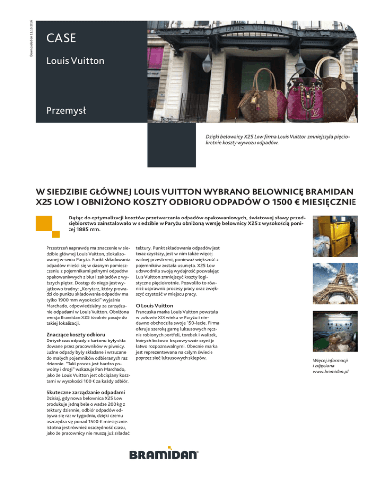 Downloaded on 12.10.2016 CASE Louis Vuitton Przemysł Dzięki belownicy X25 Low firma Louis Vuitton zmniejszyła pięciokrotnie koszty wywozu odpadów. W SIEDZIBIE GŁÓWNEJ LOUIS VUITTON WYBRANO BELOWNICĘ BRAMIDAN X25 LOW I OBNIŻONO KOSZTY ODBIORU ODPADÓW O 1500 € MIESIĘCZNIE Dążąc do optymalizacji kosztów przetwarzania odpadów opakowaniowych, światowej sławy przedsiębiorstwo zainstalowało w siedzibie w Paryżu obniżoną wersję belownicy X25 z wysokością poniżej 1885 mm. Przestrzeń naprawdę ma znaczenie w siedzibie głównej Louis Vuitton, zlokalizowanej w sercu Paryża. Punkt składowania odpadów mieści się w ciasnym pomieszczeniu z pojemnikami pełnymi odpadów opakowaniowych z biur i zakładów z wyższych pięter. Dostęp do niego jest wyjątkowo trudny: „Korytarz, który prowadzi do punktu składowania odpadów ma tylko 1900 mm wysokości” wyjaśnia Marchado, odpowiedzialny za zarządzanie odpadami w Louis Vuitton. Obniżona wersja Bramidan X25 idealnie pasuje do takiej lokalizacji. Znaczące koszty odbioru Dotychczas odpady z kartonu były składowane przez pracowników w piwnicy. Luźne odpady były składane i wrzucane do małych pojemników odbieranych raz dziennie. ”Taki proces jest bardzo powolny i drogi” wskazuje Pan Marchado, jako że Louis Vuitton jest obciążany kosztami w wysokości 100 € za każdy odbiór. Skuteczne zarządzanie odpadami Dzisiaj, gdy nowa belownica X25 Low produkuje jedną bele o wadze 200 kg z tektury dziennie, odbiór odpadów odbywa się raz w tygodniu, dzięki czemu oszczędza się ponad 1500 € miesięcznie. Istotna jest również oszczędność czasu, jako że pracownicy nie muszą już składać tektury. Punkt składowania odpadów jest teraz czystszy, jest w nim także więcej wolnej przestrzeni, ponieważ większość z pojemników została usunięta. X25 Low udowodniła swoją wydajność pozwalając Luis Vuitton zmniejszyć koszty logistyczne pięciokrotnie. Pozwoliło to również usprawnić procesy pracy oraz zwiększyć czystość w miejscu pracy. O Louis Vuitton Francuska marka Louis Vuitton powstała w połowie XIX wieku w Paryżu i niedawno obchodziła swoje 150-lecie. Firma oferuje szeroką gamę luksusowych ręcznie robionych portfeli, torebek i walizek, których beżowo-brązowy wzór czyni je łatwo rozpoznawalnymi. Obecnie marka jest reprezentowana na całym świecie poprzez sieć luksusowych sklepów. Więcej informacji i zdjęcia na www.bramidan.pl Korzyści dla firm kosztów zarządzania · Redukcja odpadami · Lepsza logistyka · Większa efektywność PRZEMYSŁ Typowe przedsiębiorstwo otrzymuje codziennie ogromne ilości towarów potrzebnych do prowadzenia bieżącej działalności. Po ich rozpakowaniu pozostaje mnóstwo materiałów pakunkowych, z którymi trzeba coś zrobić. Efektywne zarządzanie nimi przekłada się bezpośrednio na wyniki finansowe. Skomplikowany transport wewnętrzny Transporty surowców oraz części zapasowych dostarczane są często na paletach zabezpieczonych tekturą i folią plastikową. Po rozpakowaniu materiały zużyte do pakowania są zbierane i przenoszone do dużych kontenerów na zewnątrz firmy. Zarządzanie niesprasowanymi odpadami jest jednak czasochłonne, a opłaty za wywóz i wynajem pojemników są wysokie. Optymalizacja procesu Postawmy belownicę bliżej linii produkcyjnej, bezpośrednio u źródła powstawania odpadów. Wywóz mocno sprasowanych bel jest łatwiejszy i dużo tańszy, a co więcej bele można wywozić rzadziej. Pracownicy nie muszą już ciąć i składać pustych kartonów ani zmagać się z nieporęczną folią. Swój czas mogą poświęcić na ważniejsze i bardziej produktywne zajęcia. Bramidan SA Łowińskiego 9 31-752 Kraków Tel. +48 12 680 88 80 Fax +48 12 680 63 10 [email protected]