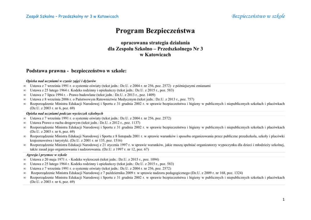 Zespół Szkolno – Przedszkolny nr 3 w Katowicach Bezpieczeństwo w szkole Program Bezpieczeństwa opracowana strategia działania dla Zespołu Szkolno – Przedszkolnego Nr 3 w Katowicach Podstawa prawna - bezpieczeństwo w szkole: Opieka nad uczniami w czasie zajęć i dyżurów Ustawa z 7 września 1991 r. o systemie oświaty (tekst jedn.: Dz.U. z 2004 r. nr 256, poz. 2572) z późniejszymi zmianami Ustawa z 25 lutego 1964 r. Kodeks rodzinny i opiekuńczy (tekst jedn.: Dz.U. z 2015 r., poz. 583) Ustawa z 7 lipca 1994 r. - Prawo budowlane (tekst jedn.: Dz.U. z 2013 r., poz. 1409) Ustawa z 8 września 2006 r. o Państwowym Ratownictwie Medycznym (tekst jedn.: Dz.U. z 2013 r., poz. 757) Rozporządzenie Ministra Edukacji Narodowej i Sportu z 31 grudnia 2002 r. w sprawie bezpieczeństwa i higieny w publicznych i niepublicznych szkołach i placówkach (Dz.U. z 2003 r. nr 6, poz. 69) Opieka nad uczniami podczas wycieczek szkolnych • Ustawa z 7 września 1991 r. o systemie oświaty (tekst jedn.: Dz.U. z 2004 r. nr 256, poz. 2572) • Ustawa Prawo o ruchu drogowym (tekst jedn.: Dz.U. z 2012 r., poz. 1137) • Rozporządzenie Ministra Edukacji Narodowej i Sportu z 31 grudnia 2002 r. w sprawie bezpieczeństwa i higieny w publicznych i niepublicznych szkołach i placówkach (Dz.U. z 2003 r. nr 6, poz. 69) • Rozporządzenie Ministra Edukacji Narodowej i Sportu z 8 listopada 2001 r. w sprawie warunków i sposobu organizowania przez publiczne przedszkola, szkoły i placówki krajoznawstwa i turystyki. (Dz.U. z 2001 r. nr 135, poz. 1516) • Rozporządzenie Ministra Edukacji Narodowej z 21 stycznia 1997 r. w sprawie warunków, jakie muszą spełniać organizatorzy wypoczynku dla dzieci i młodzieży szkolnej, także zasad jego organizowania i nadzorowania. (Dz.U. z 1997 r. nr 12, poz. 67) Agresja i przemoc w szkole • Ustawa z 20 maja 1971 r. - Kodeks wykroczeń (tekst jedn.: Dz.U. z 2015 r., poz. 1094) • Ustawa z 25 lutego 1964 r. Kodeks rodzinny i opiekuńczy (tekst jedn.: Dz.U. z 2015 r., poz. 583) • Ustawa z 7 września 1991 r. o systemie oświaty (tekst jedn.: Dz.U. z 2004 r. nr 256, poz. 2572) • Rozporządzenie Ministra Edukacji Narodowej z 7 października 2009 r. w sprawie nadzoru pedagogicznego (Dz.U. z 2009 r. nr 168, poz. 1324) • Rozporządzenie Ministra Edukacji Narodowej i Sportu z 31 grudnia 2002 r. w sprawie bezpieczeństwa i higieny w publicznych i niepublicznych szkołach i placówkach (Dz.U. z 2003 r. nr 6, poz. 69) • • • • • 1 Zespół Szkolno – Przedszkolny nr 3 w Katowicach Bezpieczeństwo w szkole Wypadki w szkole Ustawa z 7 września 1991 r. o systemie oświaty (tekst jedn.: Dz.U. z 2004 r. nr 256, poz. 2572) Ustawa z 30 października 2002 r. o ubezpieczeniu społecznym z tytułu wypadków przy pracy i chorób zawodowych (tekst jedn.: Dz.U. z 2015 r., poz. 1242) Rozporządzenie Rady Ministrów z 28 lipca 1998 r. w sprawie ustalania okoliczności i przyczyn wypadków przy pracy oraz sposobu ich dokumentowania, a także zakresu informacji zamieszczanych w rejestrze wypadków przy pracy (Dz.U. z 1998 r. nr 115, poz. 744) • Rozporządzenie Ministra Edukacji Narodowej i Sportu z 31 grudnia 2002 r. w sprawie bezpieczeństwa i higieny w publicznych i niepublicznych szkołach i placówkach (Dz.U. z 2003 r. nr 6, poz. 69) Bhp w szkole • Ustawa z 24 sierpnia 1991 r. o Państwowej Straży Pożarnej (tekst jedn.: Dz.U. z 2013 r., poz. 1340) • Ustawa z 24 sierpnia 1991 r. o ochronie przeciwpożarowej. (tekst. jedn.: Dz.U. z 2009 r. nr 178, poz. 1380) • Rozporządzenie Ministra Edukacji Narodowej i Sportu z 31 grudnia 2002 r. w sprawie bezpieczeństwa i higieny w publicznych i niepublicznych szkołach i placówkach (Dz.U. z 2003 r. nr 6, poz. 69) • Rozporządzenie Ministra Gospodarki i Pracy z 27 lipca 2004 r. w sprawie szkolenia w dziedzinie bezpieczeństwa i higieny pracy (Dz.U. z 2004 r. nr 180, poz. 1860) • Rozporządzenie Ministra Gospodarki Przestrzennej i Budownictwa z 1 października 1993 r. w sprawie bezpieczeństwa i higieny pracy przy eksploatacji, remontach i konserwacji sieci kanalizacyjnych. (Dz.U. z 1993 r. nr 96, poz. 437) • • • Podstawowe założenia programu: • Praca wszystkich nauczycieli, pracowników szkoły, uczniów, rodziców środowiska w kierunku poprawy stanu bezpieczeństwa uczniów w szkole; • Działania w zakresie bezpieczeństwa w ramach realizowanych w szkole programów: wychowawczego i profilaktycznego; • Analiza i wdrażanie procedur postępowania w sytuacjach kryzysowych i zagrożenia bezpieczeństwa uczniów; Adresaci programu: • • • • • Wszyscy uczniowie szkoły, nauczyciele, dyrektor szkoły i jego zastępcy, rodzice, pracownicy szkoły. 2 Zespół Szkolno – Przedszkolny nr 3 w Katowicach Bezpieczeństwo w szkole Cele programu: Cele główne: 1. 2. 3. 4. Podniesienie stanu bezpieczeństwa szkoły. Eliminowanie wszelkich form agresji psychicznej i fizycznej. Kształtowanie właściwych postaw uczniowskich zgodnie z prawami i obowiązkami ucznia. Tworzenie warunków do różnorodnych form aktywności uczniów na terenie szkoły. Cele szczegółowe: 1. Podejmowanie szybkich i trafnych działań interwencyjnych w sytuacjach zagrażających uczniom zgodnie ze Statutem Szkoły. 2. Poszerzanie wiedzy uczniów w zakresie bezpieczeństwa. 3. Współpraca z rodzicami i środowiskiem na rzecz poprawy bezpieczeństwa w szkole i jej otoczeniu - systematyczne informowanie rodziców i uczniów o zasadach bezpieczeństwa. 4. Niwelowanie miejsc niebezpiecznych w szkole. 5. Kreowanie wspierającego i bezpiecznego środowiska szkolnego. 6. Prowadzenie szerokiej akcji profilaktycznej mającej na celu podnoszenie bezpieczeństwa uczniów oraz zapobieganie uzależnieniom i przemocy wśród uczniów („Nie dla dopalaczy”, „Nie dla cyberprzemocy”) 7. Kształtowanie współpracy między instytucjami i podmiotami szkoły Ewaluacja: • • • • bieżące rozmowy z uczniami, rodzicami; ankiety dla uczniów, ro