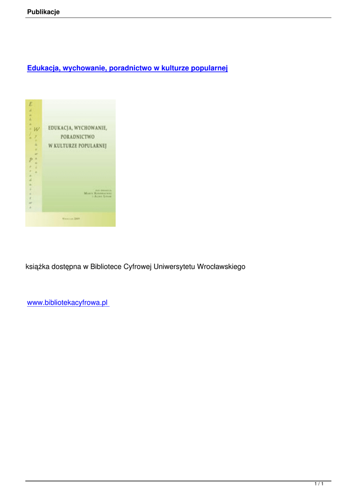 Publikacje Edukacja, wychowanie, poradnictwo w kulturze popularnej książka dostępna w Bibliotece Cyfrowej Uniwersytetu Wrocławskiego www.bibliotekacyfrowa.pl 1/1