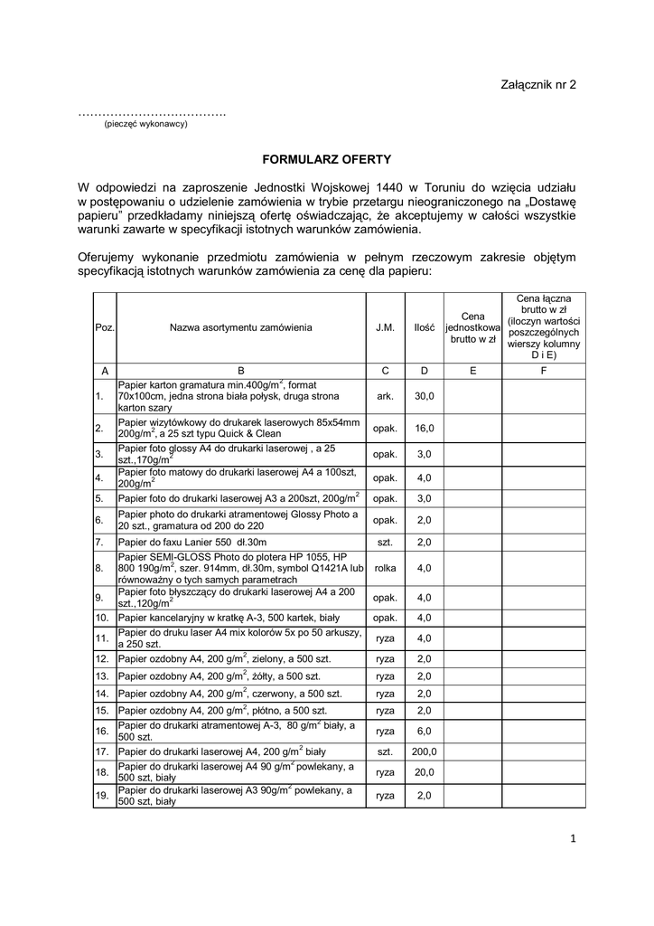 Załącznik nr 2 ………………………………. (pieczęć wykonawcy) FORMULARZ OFERTY W odpowiedzi na zaproszenie Jednostki Wojskowej 1440 w Toruniu do wzięcia udziału w postępowaniu o udzielenie zamówienia w trybie przetargu nieograniczonego na „Dostawę papieru” przedkładamy niniejszą ofertę oświadczając, że akceptujemy w całości wszystkie warunki zawarte w specyfikacji istotnych warunków zamówienia. Oferujemy wykonanie przedmiotu zamówienia w pełnym rzeczowym zakresie objętym specyfikacją istotnych warunków zamówienia za cenę dla papieru: Poz. Nazwa asortymentu zamówienia J.M. Ilość A B Papier karton gramatura min.400g/m 2, format 70x100cm, jedna strona biała połysk, druga strona karton szary Papier wizytówkowy do drukarek laserowych 85x54mm 200g/m2, a 25 szt typu Quick & Clean Papier foto glossy A4 do drukarki laserowej , a 25 2 szt.,170g/m Papier foto matowy do drukarki laserowej A4 a 100szt, 200g/m2 Papier foto do drukarki laserowej A3 a 200szt, 200g/m2 C D ark. 30,0 opak. 16,0 opak. 3,0 opak. 4,0 opak. 3,0 opak. 2,0 Papier do faxu Lanier 550 dł.30m szt. Papier SEMI-GLOSS Photo do plotera HP 1055, HP 8. 800 190g/m2, szer. 914mm, dł.30m, symbol Q1421A lub rolka równoważny o tych samych parametrach Papier foto błyszczący do drukarki laserowej A4 a 200 9. opak. 2 szt.,120g/m 10. Papier kancelaryjny w kratkę A-3, 500 kartek, biały opak. Papier do druku laser A4 mix kolorów 5x po 50 arkuszy, 11. ryza a 250 szt. 2 12. Papier ozdobny A4, 200 g/m , zielony, a 500 szt. ryza 2,0 2 ryza 2,0 2 ryza 2,0 2 ryza 2,0 ryza 6,0 szt. 200,0 ryza 20,0 ryza 2,0 1. 2. 3. 4. 5. 6. Papier photo do drukarki atramentowej Glossy Photo a 20 szt., gramatura od 200 do 220 7. 13. Papier ozdobny A4, 200 g/m , żółty, a 500 szt. 14. Papier ozdobny A4, 200 g/m , czerwony, a 500 szt. 15. Papier ozdobny A4, 200 g/m , płótno, a 500 szt. 2 Papier do drukarki atramentowej A-3, 80 g/m biały, a 16. 500 szt. 2 17. Papier do drukarki laserowej A4, 200 g/m biały 2 Papier do drukarki laserowej A4 90 g/m powlekany, a 18. 500 szt, biały Papier do drukarki laserowej A3 90g/m2 powlekany, a 19. 500 szt, biały Cena łączna brutto w zł Cena (iloczyn wartości jednostkowa poszczególnych brutto w zł wierszy kolumny D i E) E F 4,0 4,0 4,0 4,0 2,0 1 2 20. Papier do drukarki laserowej A-4 90 g/m biały, białość, CIE D65 od 162 do 169, a 500 szt. Papier do drukarki atramentowej A-4 (a 500szt), 2 gramatura 80g/m (+/-3), białość CIE D65 od 162 do 169. Papier do drukarki laserowej A4 - 500 szt., biały, gramatura 80g/m2(+/-3), białość CIE D65 od 162 do 169. Papier Heavyheight Coated A0 do plotera HP1055, 2 HP800, szer.914mm, dł.30m, gramat.130 g/m ,symbol C6030C lub równoważny o tych samych parametrach 2 Papier Coated 98 g/m do plotera HP1055, HP800, dł. 45m , szer.914 mm, symbol C6020B lub równoważny o tych samych parametrach Papier Super Heavy Wight Plus Matte gram. 210g/m2 do plotera, szer. 914mm, dł. 30,5m, symbol papieru Q6627A lub równoważny o tych samych parametrach Papier ozdobny A-4, 180-190g/m2 , faktura płótno, biały ryza 250,0 ryza 250,0 ryza 72,0 rolka 2,0 rolka 4,0 rolka 1,0 szt. 117,0 27. Papier do druku komputerowego 1+1 240x12 a 900 kart opak. 8,0 28. Papier do druku komputerowego 1+2 240x12 a 600 kart opak. 8,0 29. Papier do druku komputerowego 1+3 240x12 a 450 kart Papier do druku komputerowego 1+0 390x12 a 2000 30. kart Papier do druku komputerowego 1+4 240x12 a 2000 31. kart Papier do druku komputerowego1+0 240x12 a 2000 32. kart Papier do kserokopiarki A4, 80g/m2, biały, wg skali 33. białości CIE 161±2, a 500 szt. Papier do kserokopiarki A3, 80g/m2, biały, wg skali 34. białości CIE 161±2, a 500 szt. opak. 8,0 opak. 3,0 opak. 5,0 opak. 10,0 ryza 508,0 ryza 14,0 21. 22. 23. 24. 25. 26. 35. RAZEM: (suma wierszy kolumny F, tj. od F1 do F34) Cena oferty brutto za dostawę papieru ogółem wynosi: ………………… zł, (F 35) słownie: ……………………………………………………………………………………… . w tym VAT: ……% ……………………………. zł. Zamówienie wykonamy w terminie do 14 dni roboczych od dnia podpisania umowy. Oświadczamy, że: 1. Zapoznaliśmy się ze specyfikacją istotnych warunków zamówienia i nie wnosimy do niej zastrzeżeń oraz posiedliśmy informacje konieczne do przygotowania oferty. 2. Projekt umowy (załącznik nr 3 do SIWZ) i zawarte w nim postanowienia, zostały przez nas zaakceptowane. Zobowiązujemy się, w przypadku wyboru naszej oferty, do zawarcia umowy na określonych warunkach, w miejscu i terminie wyznaczonym przez zamawiającego. 3. Czujemy się związani niniejszą ofertą przez czas wskazany w SIWZ, tj. przez okres 30 dni, licząc od daty ostatecznego terminu składania ofert. …………………………………. (miejscowość, data) ………………………………………. (podpis osoby/osób uprawnionej/ych do reprezentowania wykonawcy) 2