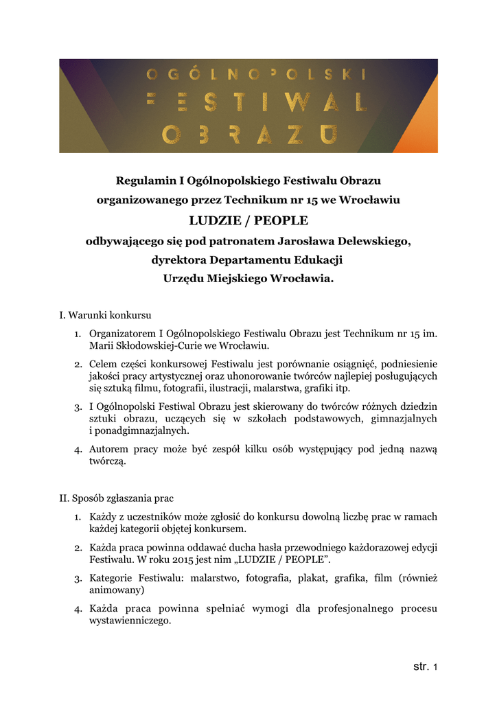 Regulamin I Ogólnopolskiego Festiwalu Obrazu organizowanego przez Technikum nr 15 we Wrocławiu LUDZIE / PEOPLE odbywającego się pod patronatem Jarosława Delewskiego, dyrektora Departamentu Edukacji Urzędu Miejskiego Wrocławia. I. Warunki konkursu 1. Organizatorem I Ogólnopolskiego Festiwalu Obrazu jest Technikum nr 15 im. Marii Skłodowskiej-Curie we Wrocławiu. 2. Celem części konkursowej Festiwalu jest porównanie osiągnięć, podniesienie jakości pracy artystycznej oraz uhonorowanie twórców najlepiej posługujących się sztuką filmu, fotografii, ilustracji, malarstwa, grafiki itp. 3. I Ogólnopolski Festiwal Obrazu jest skierowany do twórców różnych dziedzin sztuki obrazu, uczących się w szkołach podstawowych, gimnazjalnych i ponadgimnazjalnych. 4. Autorem pracy może być zespół kilku osób występujący pod jedną nazwą twórczą. II. Sposób zgłaszania prac 1. Każdy z uczestników może zgłosić do konkursu dowolną liczbę prac w ramach każdej kategorii objętej konkursem. 2. Każda praca powinna oddawać ducha hasła przewodniego każdorazowej edycji Festiwalu. W roku 2015 jest nim „LUDZIE / PEOPLE”. 3. Kategorie Festiwalu: malarstwo, fotografia, plakat, grafika, film (również animowany) 4. Każda praca powinna spełniać wymogi dla profesjonalnego procesu wystawienniczego. str. 1 5. Na konkurs są przyjmowane prace powstałe w latach 2013–2015. 6. Prace należy nadesłać w nieprzekraczalnym terminie 30 września 2015 roku. Do pracy należy dołączyć wypełnioną i wydrukowaną kartę zgłoszenia oraz opis pracy (maksymalnie 500 znaków). Minimalny format prac drukowanych to 20x30 cm. 7. Organizator poinformuje zgłaszającego drogą e-maila zwrotnego o przyjęciu zgłoszenia. Zgłoszenie niepełne lub błędnie wypełnione nie zostanie zaakceptowane. 8. Nadsyłane prace nie podlegają zwrotowi. 9. Prace powinny być zapakowane w sposób zapewniający bezpieczny transport – przesyłki zniszczone nie będą wystawione. Organizatorzy nie odpowiadają za uszkodzenia prac w trakcie transportu. 10. Koszty przesyłek i inne nieprzewidziane opłaty ponosi nadsyłający. 11. Prace dostarczone po terminie do siedziby Organizatora mogą wziąć udział w Festiwalu jako prace pozakonkursowe. III. Komisja konkursowa 1. Jury co roku składa się z osób profesjonalnie zajmujących się projektowaniem, poligrafią, typografią, malarstwem, ilustracją i fotografią. Na posiedzeniu Jury ze swego grona wybierze przewodniczącego Jury. Jurorzy nie będą głosować na prace, z którymi mieli jakikolwiek profesjonalny kontakt. 2. Komisja konkursowa na podstawie nadesłanych reprodukcji dokona wyboru obrazów na wystawę, który będzie jednoznaczny z nominowaniem autorów tych obrazów do Nagrody. 3. Ogłoszenie listy autorów nominowanych do Nagrody i zaproszonych do udziału w wystawie konkursowej nastąpi na stronie internetowej www.zs25.pl 4. Wybór laureatów Nagród zostanie ogłoszony na stronie internetowej. Wręczenie Nagród nastąpi podczas oficjalnego otwarcia wystawy w galerii wybranej przez Organizatora. 5. W konkursie zostanie przyznana jedna Nagroda w każdej kategorii oraz wyróżnienia honorowe w postaci udziału w wystawie konkursowej. Organizator dopuszcza możliwość przyznania wyróżnień i nagród dodatkowych. 6. Jurorzy mogą zdecydować również o nieprzyznaniu nagród w tych kategoriach, w których ich zdaniem nie było prac godnych wyróżnienia. 7. Od werdyktu komisji konkursowej nie przysługuje odwołanie. IV. Postanowienia końcowe str. 2 1. Zgłoszenie udziału w konkursie jest jednoznaczne z zaakceptowaniem niniejszego regulaminu i wszystkich decyzji komisji konkursowej oraz Organizatora. Naruszenie postanowień regulaminu może prowadzić do wykluczenia z udziału w konkursie. 2. Prace wymienione w zgłoszeniu konkursowym muszą stanowić dzieło autorskie Zgłaszającego i nie mogą posiadać wad prawnych. Zgłaszający potwierdza (w formularzu zgłoszenia), że jest świadom odpowiedzialności przewidzianej przez prawo autorskie, prawa pokrewne i Kodeks Cywilny w przypadku podania informacji niezgodnej z prawdą. 3. Uczestnicy wystawy przenoszą na Organizatora autorskie prawa majątkowe oraz prawa pokrewne w zakresie niezbędnym do przeprowadzenia konkursu, organizacji wystawy konkursowej oraz informowania o konkursie i wystawie w materiałach własnych Organizatora oraz Technikum nr 15 we Wrocławiu, a także w innych środkach przekazu, w szczególności rozporządzania nimi i korzystania z nich na następujących polach eksploatacji: digitalizacja, wprowadzenie do pamięci komputera, sporządzenie wydruku komputerowego, zwielokrotnienie przez druk, nagranie na nośniku pamięci, wprowadzenie do obrotu, upublicznienie w Internecie (na podstawie ustawy z dnia 4 lutego 1994 r. o prawach autorskich i prawach pokrewnych – Dz.U. z 2006 r., nr 90, poz. 631 ze zm.). 4. Wszystkie nagrodzone prace zostaną włączone do zbiorów Galerii Technikum nr 15 we Wrocławiu lub innych instytucji kulturalnych miasta Wrocławia współpracujących z Organizatorami. 5. Organizator zastrzega sobie prawo dokonywania zmian w regulaminie. 6. Regulamin jest dostępny na stronie internetowej www.zs25.pl oraz www.facebook.com/Technikum15 V. Kontakt z organizatorem: Marek Sosnowski, tel. 602465189, e-mail: [email protected] Jakub Kamiński, tel. 508733530, e-mail: [email protected] Agata Grzych, tel. 791823366, e-mail: [email protected] Technikum nr 15 im. Marii Skłodowskiej-Curie ul. Skwierzyńska 1-7 53-521 Wrocław tel. 71 7986901 fax. 71 7984401 e-mail: [email protected] str. 3