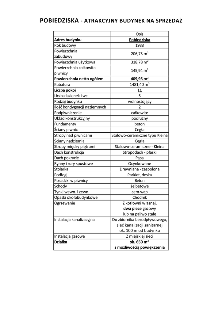 POBIEDZISKA - ATRAKCYJNY BUDYNEK NA SPRZEDAŻ Adres budynku Rok budowy Powierzchnia zabudowy Powierzchnia użytkowa Powierzchnia całkowita piwnicy Powierzchnia netto ogółem Kubatura Liczba pokoi Liczba łazienek i wc Rodzaj budynku Ilość kondygnacji naziemnych Podpiwniczenie Układ konstrukcyjny Fundamenty Ściany piwnic Stropy nad piwnicami Ściany nadziemia Stropy między piętrami Dach konstrukcja Dach pokrycie Rynny i rury spustowe Stolarka Podłogi Posadzki w piwnicy Schody Tynki wewn. i zewn. Opaski okołobudynkowe Ogrzewanie Instalacja kanalizacyjna Instalacja gazowa Działka Opis Pobiedziska 1988 206,75 m2 318,78 m2 145,94 m2 409,95 m2 1481,40 m3 11 5 wolnostojący 2 całkowite podłużny beton Cegła Stalowo-ceramiczne typu Kleina Cegła Stalowo-ceramiczne - Kleina Stropodach - płaski Papa Ocynkowane Drewniana - zespolona Parkiet, deska Beton żelbetowe cem-wap Chodnik Z kotłowni własnej, dwa piece gazowy lub na paliwo stałe Do zbiornika bezodpływowego, sieć kanalizacji sanitarnej ok. 100 m od budynku Z miejskiej sieci ok. 650 m2 z możliwością powiększenia
