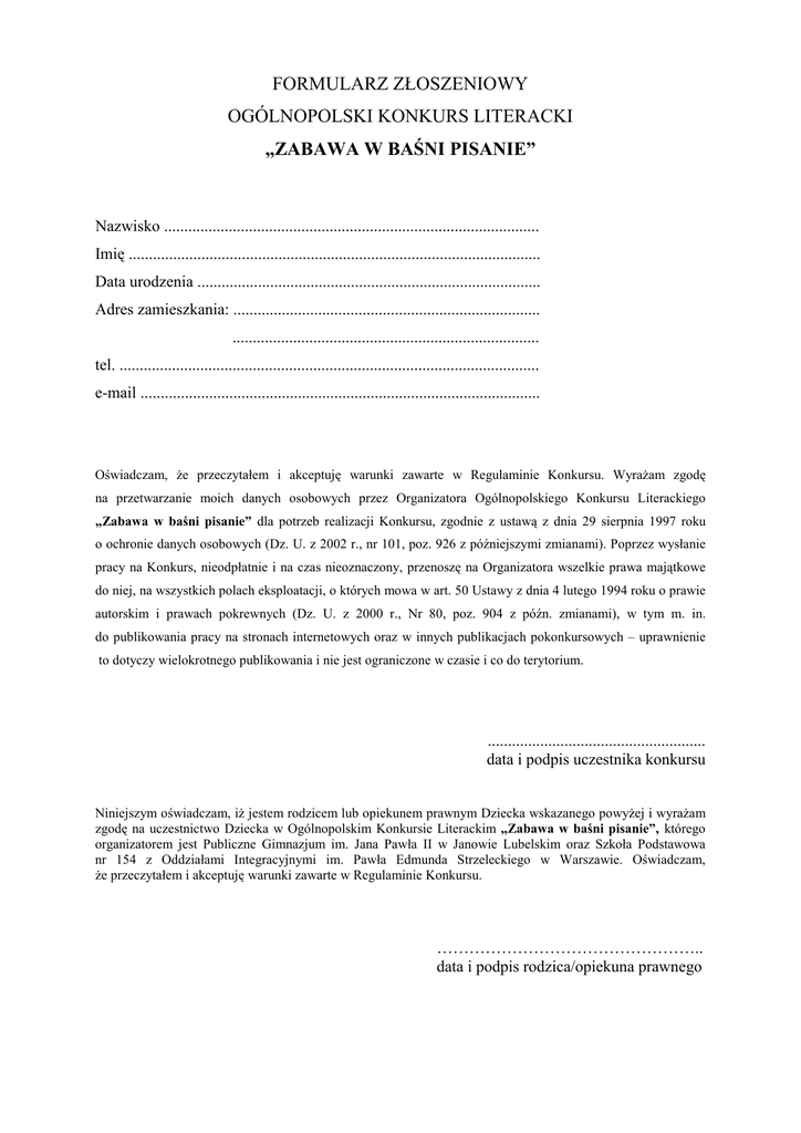 FORMULARZ ZŁOSZENIOWY OGÓLNOPOLSKI KONKURS LITERACKI „ZABAWA W BAŚNI PISANIE” Nazwisko ............................................................................................. Imię ...................................................................................................... Data urodzenia ..................................................................................... Adres zamieszkania: ............................................................................ ............................................................................ tel. ........................................................................................................ e-mail ................................................................................................... Oświadczam, że przeczytałem i akceptuję warunki zawarte w Regulaminie Konkursu. Wyrażam zgodę na przetwarzanie moich danych osobowych przez Organizatora Ogólnopolskiego Konkursu Literackiego „Zabawa w baśni pisanie” dla potrzeb realizacji Konkursu, zgodnie z ustawą z dnia 29 sierpnia 1997 roku o ochronie danych osobowych (Dz. U. z 2002 r., nr 101, poz. 926 z późniejszymi zmianami). Poprzez wysłanie pracy na Konkurs, nieodpłatnie i na czas nieoznaczony, przenoszę na Organizatora wszelkie prawa majątkowe do niej, na wszystkich polach eksploatacji, o których mowa w art. 50 Ustawy z dnia 4 lutego 1994 roku o prawie autorskim i prawach pokrewnych (Dz. U. z 2000 r., Nr 80, poz. 904 z późn. zmianami), w tym m. in. do publikowania pracy na stronach internetowych oraz w innych publikacjach pokonkursowych – uprawnienie to dotyczy wielokrotnego publikowania i nie jest ograniczone w czasie i co do terytorium. ...................................................... data i podpis uczestnika konkursu Niniejszym oświadczam, iż jestem rodzicem lub opiekunem prawnym Dziecka wskazanego powyżej i wyrażam zgodę na uczestnictwo Dziecka w Ogólnopolskim Konkursie Literackim „Zabawa w baśni pisanie”, którego organizatorem jest Publiczne Gimnazjum im. Jana Pawła II w Janowie Lubelskim oraz Szkoła Podstawowa nr 154 z Oddziałami Integracyjnymi im. Pawła Edmunda Strzeleckiego w Warszawie. Oświadczam, że przeczytałem i akceptuję warunki zawarte w Regulaminie Konkursu. ………………………………………….. data i podpis rodzica/opiekuna prawnego
