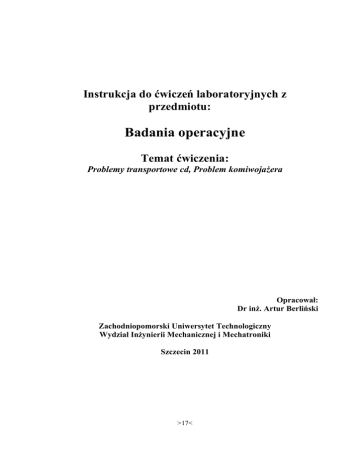 Instrukcja do ćwiczeń laboratoryjnych z przedmiotu: Badania operacyjne Temat ćwiczenia: Problemy transportowe cd, Problem komiwojażera Opracował: Dr inż. Artur Berliński Zachodniopomorski Uniwersytet Technologiczny Wydział Inżynierii Mechanicznej i Mechatroniki Szczecin 2011 >17< Problemy do rozwiązania w ramach ćwiczeń laboratoryjnych Zadanie 1 Dwa zakłady produkują jednorodny towar i dostarczają go do trzech odbiorców z wykorzystaniem dwóch punktów pośrednich (magazynów). Bezpośredni transport z zakładów do odbiorców jest niemożliwy. Koszty transportu w zł za tonę podają tabele: Z1 Z2 M1 25 17 M2 20 15 O1 15 13 M1 M2 O2 17 21 O3 19 12 Moce produkcyjne zakładów wynoszą 50 i 80 ton, popyt odbiorców 25,25 i 40 ton, zaś pojemność magazynów 70 i 70 ton. Zakłady nie muszą w pełni wykorzystywać swoich mocy produkcyjnych, a magazyny nie składują nadwyżki podaży. Wiedząc, że koszty magazynowania towaru chwilowo przechowywanego w magazynach wynoszą 30 i 37 zł na tonę, ustalić plan przewozów minimalizujący łączne koszty. A) Ile wynoszą całkowite koszty transportu z zakładów do magazynów? B) Ile wynoszą całkowite koszty transportu z magazynów do odbiorców? C) Ile wynoszą całkowite koszty magazynowania? Zadanie 2 Trzech dostawców dostarcza towar do trzech odbiorców. Podaż dostawców wynosi 30, 40 i 30 ton, zaś popyt odbiorców odpowiednio 27, 37 i 36 ton. Jednostkowe koszty transportu podaje poniższa tabela. Jednostkowe koszty produkcji u dostawców wynoszą odpowiednio 1 tys. zł, 2 tys. zł oraz 3 tys. zł. Należy znaleźć plan dostaw minimalizujący łączne koszty transportu i produkcji. Dostawcy\odbiorcy D1 D2 D3 O2 5 10 2 O1 2 2 1 O3 4 8 1 Zadanie 3 Sześć stacji kolejowych wzajemnie przesyła sobie wagony załadowane różnymi towarami. Wagony po wyładowaniu towarów są przeznaczone pod załadunek towarów wywożonych z danej stacji do innych stacji. Jeżeli liczba wagonów nadchodzących jest większa od liczby wagonów potrzebnych pod załadunek, to dana stacja wysyła puste wagony do tych stacji, w których ujawnia się deficyt pustych wagonów. Jeżeli natomiast liczba wagonów przychodzących jest mniejsza od liczby wagonów potrzebnych pod załadunek, to dana stacja otrzymuje puste >18< wagony od tych stacji, w których wystąpiła nadwyżka pustych wagonów. Tabela podaje odległości między stacjami oraz przywóz i wywóz pełnych wagonów. S1 S2 S3 Stacje S1 S2 S3 S4 S5 S6 Wywóz pełnych wagonów S4 S5 S6 odległości (w km) 0 20 0 60 30 0 30 50 25 0 40 90 23 39 0 22 75 48 45 84 0 30 40 50 30 25 5 Przywóz pełnych wagonów 70 40 10 20 10 30 180 Należy ustalić taki plan przemieszczeń pustych wagonów pomiędzy stacjami. Aby łączny przebieg pustych wagonów był możliwie najmniejszy. ¾ określić popyt na puste wagony i podaż pustych wagonów, ¾ zapisać problem w postaci makiety zamkniętego zadania transportowego. Problem komiwojażera Problem komiwojażera (TSP - ang. traveling salesman problem) jest zagadnieniem z teorii grafów, polegającym na znalezieniu minimalnego cyklu Hamiltona w pełnym grafie ważonym. Nazwa pochodzi od typowej ilustracji problemu, przedstawiającej go z punktu widzenia wędrownego sprzedawcy (komiwojażera): dane jest n miast, które komiwojażer ma odwiedzić, oraz odległość pomiędzy każdą parą miast. Można rozróżnić symetryczny problem komiwojażera (STSP), polegający na tym, że odległość pomiędzy miastami A i B jest zawsze taka sama, oraz asymetryczny problem (ATSP), gdzie odległość od miasta A do miasta B może być inna, niż odległość od miasta B do miasta A. Znane są metody optymalizacyjne – przybliżone rozwiązujące problem komiwojażera bazujące, np. na algorytmie mrówkowym. Współcześnie wobec możliwości komputerowego wspomagania rozwiązywania problemów optymalizacji, efektywnym sposobem generowania rozwiązań problemu komiwojażera, nawet dla złożonych problemów, może być zastosowanie także metod dokładnych, takich jak programowanie liniowe. Model programowania liniowego problemu komiwojażera zakłada minimalizcję funkcji celu, wyrażającej sumę wszystkich cykli Hamiltona w grafie: n n ∑∑ c i =1 j =1 i, j ⋅ xi , j → min Przy ograniczeniach n ∑x j =1 i, j = 1 ; (i = 1,2,3,..., n) >19< n ∑x i =1 i, j = 1 ; ( j = 1,2,3,..., n) u i − u j + nxi , j ≤ n − 1 ; (i, j = 2,3,..., n; i ≠ j ) xi, j ∈ C + gdzie: n - liczbmiast, ci , j - odległość pomiędzy dwoma sąsiednimi miastami, xi , j - zmienna incydencji, określająca występowanie danego zabiegu, u i - dodatkowa zmienna ciągłości cyklu Hamiltona. Zadanie komiwojażera można rozwiązać stosując algorytm simpleks. Dyskretyzację zmiennych do liczb całkowitych można przeprowadzić metodą Land Doiga. Zadanie 4 Komiwojażer ma odwiedzić klientów w czterech punktach miasta i wrócić do domu. Mieszka w pobliżu klienta k2. Dana jest macierz odległości między tymi punktami: K1 K2 K3 K4 K1 ∞ 14 10 5 K2 15 ∞ 3 4 K3 11 6 ∞ 11 K4 20 10 9 ∞ A) Ustalić, o ile minimalna droga przynajmniej się wydłuży, jeżeli zamknięty zostanie odcinek <k3,k2>. B) Podać kolejność odwiedzania klientów. Zadanie 5 Mechanik ma naprawić uszkodzony sprzęt w kilku miejscach, a następnie wrócić do domu. Mieszka w pobliżu jednego z tych punktów. Dana jest macierz odległości między tymi punktami: P1 P2 P3 P4 P1 ∞ 14 9 5 P2 15 ∞ 3 4 P3 20 6 ∞ 11 P4 11 10 9 ∞ A) Mechanik mieszka w pobliżu punktu P3. Jaka powinna być kolejność ich odwiedzania? B) Ile wynosiłaby długość drogi, gdyby mechanik poruszał się w kierunku przeciwnym do wyznaczonej trasy optymalnej? Kiedy długości obu tras (wyznaczonej i przeciwnej do wyznaczonej) byłyby takie same? C) Ustalić, o ile wydłuży się przynajmniej najkrótsza droga, jeżeli z powodu remontu ulicy zamknięty zostanie odcinek <p1,p4>. D) Ustalić długość najkrótszej drogi, gdy zabl