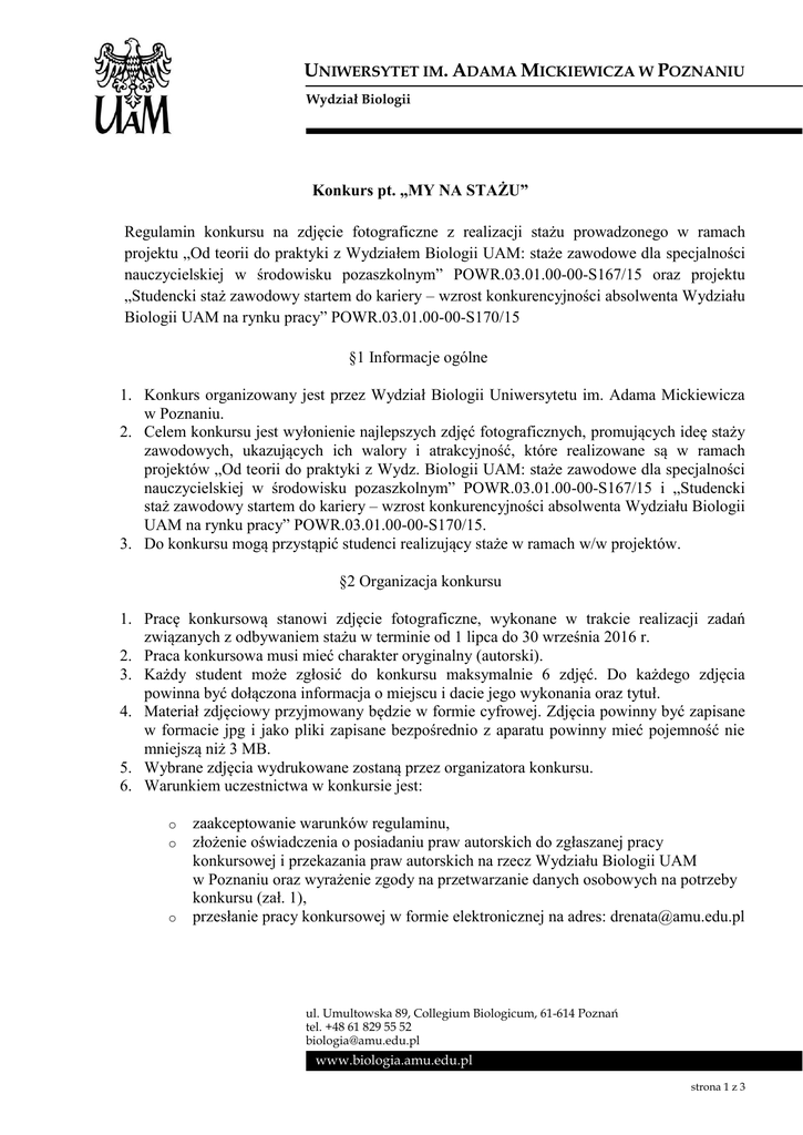 UNIWERSYTET IM. ADAMA MICKIEWICZA W POZNANIU Wydział Biologii Konkurs pt. „MY NA STAŻU” Regulamin konkursu na zdjęcie fotograficzne z realizacji stażu prowadzonego w ramach projektu „Od teorii do praktyki z Wydziałem Biologii UAM: staże zawodowe dla specjalności nauczycielskiej w środowisku pozaszkolnym” POWR.03.01.00-00-S167/15 oraz projektu „Studencki staż zawodowy startem do kariery – wzrost konkurencyjności absolwenta Wydziału Biologii UAM na rynku pracy” POWR.03.01.00-00-S170/15 §1 Informacje ogólne 1. Konkurs organizowany jest przez Wydział Biologii Uniwersytetu im. Adama Mickiewicza w Poznaniu. 2. Celem konkursu jest wyłonienie najlepszych zdjęć fotograficznych, promujących ideę staży zawodowych, ukazujących ich walory i atrakcyjność, które realizowane są w ramach projektów „Od teorii do praktyki z Wydz. Biologii UAM: staże zawodowe dla specjalności nauczycielskiej w środowisku pozaszkolnym” POWR.03.01.00-00-S167/15 i „Studencki staż zawodowy startem do kariery – wzrost konkurencyjności absolwenta Wydziału Biologii UAM na rynku pracy” POWR.03.01.00-00-S170/15. 3. Do konkursu mogą przystąpić studenci realizujący staże w ramach w/w projektów. §2 Organizacja konkursu 1. Pracę konkursową stanowi zdjęcie fotograficzne, wykonane w trakcie realizacji zadań związanych z odbywaniem stażu w terminie od 1 lipca do 30 września 2016 r. 2. Praca konkursowa musi mieć charakter oryginalny (autorski). 3. Każdy student może zgłosić do konkursu maksymalnie 6 zdjęć. Do każdego zdjęcia powinna być dołączona informacja o miejscu i dacie jego wykonania oraz tytuł. 4. Materiał zdjęciowy przyjmowany będzie w formie cyfrowej. Zdjęcia powinny być zapisane w formacie jpg i jako pliki zapisane bezpośrednio z aparatu powinny mieć pojemność nie mniejszą niż 3 MB. 5. Wybrane zdjęcia wydrukowane zostaną przez organizatora konkursu. 6. Warunkiem uczestnictwa w konkursie jest: o o o zaakceptowanie warunków regulaminu, złożenie oświadczenia o posiadaniu praw autorskich do zgłaszanej pracy konkursowej i przekazania praw autorskich na rzecz Wydziału Biologii UAM w Poznaniu oraz wyrażenie zgody na przetwarzanie danych osobowych na potrzeby konkursu (zał. 1), przesłanie pracy konkursowej w formie elektronicznej na adres: [email protected] ul. Umultowska 89, Collegium Biologicum, 61-614 Poznań tel. +48 61 829 55 52 [email protected] www.biologia.amu.edu.pl strona 1 z 3 lub złożenie na nośniku w pokoju 1-27 w Collegium Biologicum u dr Renaty Dudziak lub w Biurze Projektu w pok. 0-58, do dnia 14 października 2016 r. 7. Rozstrzygnięcie konkursu nastąpi do dnia 10 listopada 2016 roku. §3 Zasady przyznawania nagród 1. Kryteria oceny nadesłanych prac: ukazanie walorów i atrakcyjności staży zawodowych, estetyka i walory artystyczne prac. 2. Nagrodzone prace wyodrębni jury, w skład którego wchodzą Dziekan Wydziału Biologii oraz czterech nauczycieli akademickich z Wydziału Biologii UAM . 3. Decyzja jury jest ostateczna. 4. Przewidziano następujące nagrody i wyróżnienia: Nagrody: I miejsce – nagroda rzeczowa o wartości 1000 zł i wydrukowanie zdjęcia, II miejsce – nagroda rzeczowa o wartości 500 zł i wydrukowanie zdjęcia, dwa III miejsca – nagroda rzeczowa o wartości 250 zł i wydrukowanie zdjęcia, Wyróżnienia: wydrukowanie wybranych zdjęć. 5. Nagrody zostaną sfinansowane z funduszy organizatora konkursu. 6. Nagrody zostaną wręczone do końca listopada 2016 r. 7. Lista zwycięzców niniejszego konkursu zostanie opublikowana na stronie internetowej Wydziału Biologii UAM, do 10 listopada 2016 roku. 8. Zwycięzcy konkursu zostaną powiadomieni indywidualnie, drogą elektroniczną, o wynikach konkursu i sposobie odbioru nagrody. §4 Postanowienia końcowe 1. W przypadku złożenia nieprawdziwego oświadczenia o posiadaniu praw autorskich do zgłaszanej pracy konkursowej uczestnik ponosić będzie stosowną odpowiedzialność. 2. Regulamin konkursu dostępny jest na stronach http://www.biologia.amu.edu.pl/page.php?id=programy&ip=stazowe http://biurowb.home.amu.edu.pl/staze/page.php?id=projekty_stazowe&ip=ogloszenia oraz rozesłany do wszystkich stażystów biorących udział w obu projektach stażowych. 3. Organizator konkursu zastrzega sobie prawo do innego niż to określono w §3, ust.4, rozdziału nagród. 4. W sprawach nieuregulowanych w niniejszym Regulaminie rozstrzyga Dziekan Wydziału Biologii. Dziekan Wydziału Biologii UAM w Poznaniu Prof. dr hab. Bogdan Jackowiak strona 2 z 3 UNIWERSYTET IM. ADAMA MICKIEWICZA W POZNANIU Wydział Biologii Zał. 1. Do regulaminu konkursu „MY NA STAŻU” OŚWIADCZENIE UCZESTNIKA KONKURSU W związku z przystąpieniem do konkursu pt. „MY NA STAŻU” na zdjęcie z realizacji stażu w ramach projektu „Od teorii do praktyki z Wydziałem Biologii UAM: staże zawodowe dla specjalności nauczycielskiej w środowisku pozaszkolnym” POWR.03.01.00-00-S167/15 oraz projektu „Studencki staż zawodowy startem do kariery – wzrost konkurencyjności absolwenta Wydziału Biologii UAM na rynku pracy” POWR.03.01.00-00-S170/15 - oświadczam, że zapoznałam/łem się z regulaminem konkursu zamieszczonym na stronach http://www.biologia.amu.edu.pl/page.php?id=programy&ip=stazowe http://biurowb.home.amu.edu.pl/staze/page.php?id=projekty_stazowe&ip=ogloszenia - oświadczam, że posiadam prawa autorskie do zgłaszanej pracy konkursowej, - przekazuję prawa autorskie do pracy konkursowej na rzecz Wydziału Biologii UAM w Poznaniu - wyrażam zgodę na przetwarzanie moich danych osobowych na potrzeby tego konkursu. data i czytelny podpis uczestnika ul. Umultowska 89, Collegium Biologicum, 61-614 Poznań tel. +48 61 829 55 52 [email protected] www.biologia.amu.edu.pl strona 3 z 3