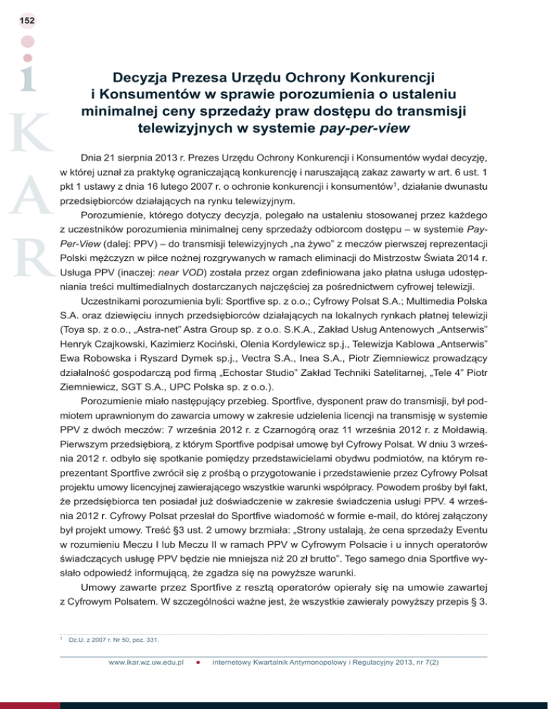 152 Decyzja Prezesa Urzędu Ochrony Konkurencji i Konsumentów w sprawie porozumienia o ustaleniu minimalnej ceny sprzedaży praw dostępu do transmisji telewizyjnych w systemie pay-per-view Dnia 21 sierpnia 2013 r. Prezes Urzędu Ochrony Konkurencji i Konsumentów wydał decyzję, w której uznał za praktykę ograniczającą konkurencję i naruszającą zakaz zawarty w art. 6 ust. 1 pkt 1 ustawy z dnia 16 lutego 2007 r. o ochronie konkurencji i konsumentów1, działanie dwunastu przedsiębiorców działających na rynku telewizyjnym. Porozumienie, którego dotyczy decyzja, polegało na ustaleniu stosowanej przez każdego z uczestników porozumienia minimalnej ceny sprzedaży odbiorcom dostępu – w systemie PayPer-View (dalej: PPV) – do transmisji telewizyjnych „na żywo” z meczów pierwszej reprezentacji Polski mężczyzn w piłce nożnej rozgrywanych w ramach eliminacji do Mistrzostw Świata 2014 r. Usługa PPV (inaczej: near VOD) została przez organ zdefiniowana jako płatna usługa udostępniania treści multimedialnych dostarczanych najczęściej za pośrednictwem cyfrowej telewizji. Uczestnikami porozumienia byli: Sportfive sp. z o.o.; Cyfrowy Polsat S.A.; Multimedia Polska S.A. oraz dziewięciu innych przedsiębiorców działających na lokalnych rynkach płatnej telewizji (Toya sp. z o.o., „Astra-net” Astra Group sp. z o.o. S.K.A., Zakład Usług Antenowych „Antserwis” Henryk Czajkowski, Kazimierz Kociński, Olenia Kordylewicz sp.j., Telewizja Kablowa „Antserwis” Ewa Robowska i Ryszard Dymek sp.j., Vectra S.A., Inea S.A., Piotr Ziemniewicz prowadzący działalność gospodarczą pod firmą „Echostar Studio” Zakład Techniki Satelitarnej, „Tele 4” Piotr Ziemniewicz, SGT S.A., UPC Polska sp. z o.o.). Porozumienie miało następujący przebieg. Sportfive, dysponent praw do transmisji, był podmiotem uprawnionym do zawarcia umowy w zakresie udzielenia licencji na transmisję w systemie PPV z dwóch meczów: 7 września 2012 r. z Czarnogórą oraz 11 września 2012 r. z Mołdawią. Pierwszym przedsiębiorą, z którym Sportfive podpisał umowę był Cyfrowy Polsat. W dniu 3 września 2012 r. odbyło się spotkanie pomiędzy przedstawicielami obydwu podmiotów, na którym reprezentant Sportfive zwrócił się z prośbą o przygotowanie i przedstawienie przez Cyfrowy Polsat projektu umowy licencyjnej zawierającego wszystkie warunki współpracy. Powodem prośby był fakt, że przedsiębiorca ten posiadał już doświadczenie w zakresie świadczenia usługi PPV. 4 września 2012 r. Cyfrowy Polsat przesłał do Sportfive wiadomość w formie e-mail, do której załączony był projekt umowy. Treść §3 ust. 2 umowy brzmiała: „Strony ustalają, że cena sprzedaży Eventu w rozumieniu Meczu I lub Meczu II w ramach PPV w Cyfrowym Polsacie i u innych operatorów świadczących usługę PPV będzie nie mniejsza niż 20 zł brutto”. Tego samego dnia Sportfive wysłało odpowiedź informującą, że zgadza się na powyższe warunki. Umowy zawarte przez Sportfive z resztą operatorów opierały się na umowie zawartej z Cyfrowym Polsatem. W szczególności ważne jest, że wszystkie zawierały powyższy przepis § 3. 1 Dz.U. z 2007 r. Nr 50, poz. 331. www.ikar.wz.uw.edu.pl internetowy Kwartalnik Antymonopolowy i Regulacyjny 2013, nr 7(2) 153 Tomasz Krzyżewski Decyzja Prezesa Urzędu Ochrony Konkurencji i Konsumentów w sprawie porozumienia… Zdaniem Prezesa UOKiK porozumienie trwało co najmniej od dnia 4 września 2012 r., kiedy to w umowie z Cyfrowym Polsatem pojawił się wspomniany zapis, aż do momentu transmisji drugiego meczu, to znaczy do 11 września 2012 r. Postanowieniem z dnia 8 listopada 2012 r. Prezes Urzędu Ochrony Konkurencji i Konsumentów wszczął z urzędu postępowanie antymonopolowe w związku z podejrzeniem naruszenia art. 6 ust. 1 pkt 1 u.o.k.i.k. poprzez zawarcie porozumienia na krajowym rynku obrotu prawami telewizyjnymi do meczów pierwszej reprezentacji Polski mężczyzn w piłce nożnej, krajowym rynku usługi dostępu do płatnych transmisji wydarzeń sportowych za pośrednictwem Internetu oraz lokalnych rynkach usług dostępu do płatnej telewizji. W niniejszej sprawie dwóch przedsiębiorców złożyło wnioski o odstąpienie od wymierzenia kary w trybie art. 109 ust. 1 ustawy o ochronie konkurencji i konsumentów lub ewentualnie obniżenie kary pieniężnej w trybie art. 109 ust. 2 ustawy. Jako pierwsze o złagodzenie kary ubiegało się Sportfive, złożyło wniosek 26 października 2012 r. Drugi wniosek został złożony 30 listopada 2012 r. przez Multimedia, jednego z operatorów, z którymi Sportfive podpisało umowę. Po przeprowadzeniu postępowania antymonopolowego Prezes Urzędu Ochrony Konkurencji i Konsumentów odstąpił od nałożenia kary wobec Sportfive, natomiast kara wobec Multimedia została obniżona o 30% jej początkowej wysokości. Strony postępowania w pismach do organu przedstawiły swoje stanowiska dotyczące przedmiotowej sprawy. Argumenty przedsiębiorców zostały przedstawione w dziale IV uzasadnienia decyzji. Prezes UOKiK ustosunkował się do każdej z kwestii w części VI uzasadnienia. Niektóre kwestie podnoszone przez strony, jak i odniesienie się do nich Prezesa UOKiK zasługują na głębszą analizę. Niektórzy przedsiębiorcy przedstawili na swoją obronę argument jakoby Sportfive miało nadużywać pozycji dominującej w procesie podpisywania umów z operatorami. UPC twierdzi, że nawiązanie relacji stanowiło efekt dyktatu ze strony Sportfive. SGT uważa natomiast, że umowy te należy potraktować jako umowy adhezyjne. Astra-net twierdzi, że cena minimalna była wynikiem arbitralnej decyzji Sportfive i nie podlegała negocjacji. Na brak faktycznych negocjacji zwraca również uwagę ZUA Antserwis oraz Toya. Strony wskazywały także uwagę na krótki czas na zawarcie umowy, przez co nie mogły zapoznać się szczegółowo z jej zapisami (Inea, Vectra). Zdaniem Prezesa UOKiK pog