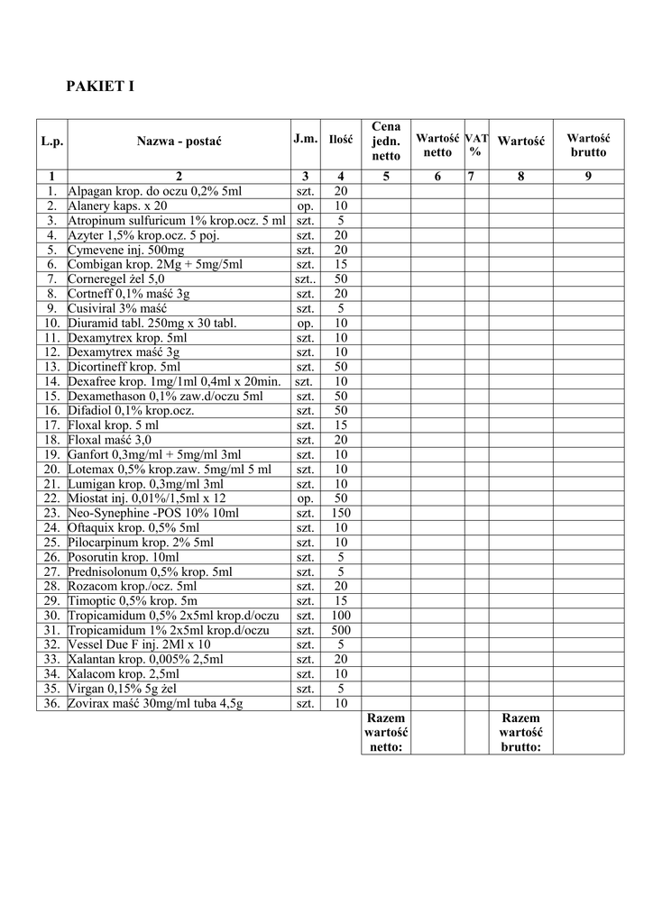 PAKIET I L.p. Nazwa - postać 1 1. 2. 3. 4. 5. 6. 7. 8. 9. 10. 11. 12. 13. 14. 15. 16. 17. 18. 19. 20. 21. 22. 23. 24. 25. 26. 27. 28. 29. 30. 31. 32. 33. 34. 35. 36. 2 Alpagan krop. do oczu 0,2% 5ml Alanery kaps. x 20 Atropinum sulfuricum 1% krop.ocz. 5 ml Azyter 1,5% krop.ocz. 5 poj. Cymevene inj. 500mg Combigan krop. 2Mg + 5mg/5ml Corneregel żel 5,0 Cortneff 0,1% maść 3g Cusiviral 3% maść Diuramid tabl. 250mg x 30 tabl. Dexamytrex krop. 5ml Dexamytrex maść 3g Dicortineff krop. 5ml Dexafree krop. 1mg/1ml 0,4ml x 20min. Dexamethason 0,1% zaw.d/oczu 5ml Difadiol 0,1% krop.ocz. Floxal krop. 5 ml Floxal maść 3,0 Ganfort 0,3mg/ml + 5mg/ml 3ml Lotemax 0,5% krop.zaw. 5mg/ml 5 ml Lumigan krop. 0,3mg/ml 3ml Miostat inj. 0,01%/1,5ml x 12 Neo-Synephine -POS 10% 10ml Oftaquix krop. 0,5% 5ml Pilocarpinum krop. 2% 5ml Posorutin krop. 10ml Prednisolonum 0,5% krop. 5ml Rozacom krop./ocz. 5ml Timoptic 0,5% krop. 5m Tropicamidum 0,5% 2x5ml krop.d/oczu Tropicamidum 1% 2x5ml krop.d/oczu Vessel Due F inj. 2Ml x 10 Xalantan krop. 0,005% 2,5ml Xalacom krop. 2,5ml Virgan 0,15% 5g żel Zovirax maść 30mg/ml tuba 4,5g J.m. Ilość 3 szt. op. szt. szt. szt. szt. szt.. szt. szt. op. szt. szt. szt. szt. szt. szt. szt. szt. szt. szt. szt. op. szt. szt. szt. szt. szt. szt. szt. szt. szt. szt. szt. szt. szt. szt. 4 20 10 5 20 20 15 50 20 5 10 10 10 50 10 50 50 15 20 10 10 10 50 150 10 10 5 5 20 15 100 500 5 20 10 5 10 Cena jedn. netto 5 Razem wartość netto: Wartość VAT Wartość netto % 6 7 8 Razem wartość brutto: Wartość brutto 9 PAKIET II L.p. Nazwa - postać 1 2 J.m. Ilość 3 4 1. Alcaine krople do oczu szt 500 2. Azopt 1% krop.ocz 5ml szt 15 3. Cilosan krop.ocz. 3mg/ml 5ml szt 50 4. Duo Trav krop. 2,5ml szt 10 5. Emadine krop. op. 0,5mg/ml 5ml szt 50 6. Flarex krop. 1mg/ml 5ml szt 20 7. Fluoresceine 10% 100mg/ml 5ml x 10amp. op. 30 8. Maxitrol krop.ocz. 5ml szt 30 9. Maxitrol maść 3,5g szt 30 10. Tobradex krop. 5ml szt 50 11. Tobrex maść oczna 3,5g szt 15 12. Tobrex krop. 0,3% 5ml szt 10 13. Travatan krop. (40mcg/ml) 2,5ml szt 10 14. Vigamox krop. 0,5% 5ml szt 50 Cena jedn. netto 5 Razem wartość netto: Wartość VAT Wartość netto % 6 7 8 Razem wartość brutto: Wartość brutto 9 PAKIET III L.p. Nazwa - postać 1 2 Cena jedn. netto J.m. Ilość 3 4 1. Lucentis (Ranibizumab) inj. 0,0023G/0,23ml x 1fiol. + akcesoria. Lek zarejestrowany w okulistyce do fiol. leczenia wysiękowej postaci AMD blokujący wszystkie znane biologiczne izotermy VEGF-A Wartość VAT Wartość netto % 5 6 7 8 Wartość brutto 9 10 Razem wartość netto: Razem wartość brutto: PAKIET IV L.p. Nazwa - postać 1 2 1. Avastin (Bewacizumab) inj. 25mg/ml 4ml J.m. Ilość 3 4 fiol. 10 Cena jedn. netto 5 Razem wartość netto: Wartość VAT Wartość netto % 6 7 8 Razem wartość brutto: Wartość brutto 9 PAKIET V L.p. Nazwa - postać 1 2 J.m. Ilość 3 Cena jedn. netto 4 Wartość VAT Wartość netto % 5 6 7 8 Wartość brutto 9 1. 0,06% r-r błękitu trypanu sodu amp. 150 W soli fizjologicznej do barwienia przedniej torebki soczewki przed capsulorrhexis ampułkostrzykawki po 0,5ml; preparat musi selektywnie zabarwiać kolagen typu IV; preparat do stosowania również w przypadku wszczepiania soczewek hydrofilowych Razem wartość netto: Razem wartość brutto: PAKIET VI L.p. Nazwa - postać 1 2 1. Eftiar Decalin-perfluorocarbon do stosowania śródocznego fiolki 5ml J.m. Ilość 3 4 fiol. 30 Cena jedn. netto Wartość 5 6 Razem wartość netto: netto VAT % 7 Wartość Wartość 8 9 Razem wartość brutto: brutto PAKIET VII L.p. Nazwa - postać 1 2 1. Płyn do irygacji oka typu BSS 500ml J.m. Ilość 3 4 fl. 300 Cena jedn. netto 5 Wartość VAT Wartość netto % 6 7 Razem wartość netto: 8 Wartość brutto 9 Razem wartość brutto: PAKIET VIII L.p. Nazwa - postać J.m. Ilość Cena jedn. netto 1 2 3 4 5 fl. 30 1. Triamcimolone Acetonide zaw. oczna 4% 2ml Razem wartość netto: Wartość VAT Wartość netto % 6 7 8 Razem wartość brutto: Wartość brutto 9