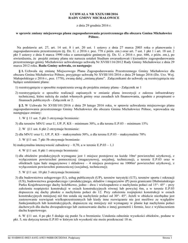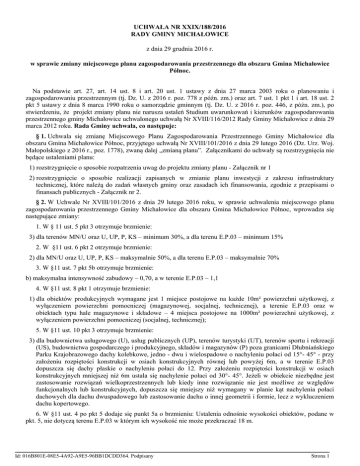 UCHWAŁA NR XXIX/188/2016 RADY GMINY MICHAŁOWICE z dnia 29 grudnia 2016 r. w sprawie zmiany miejscowego planu zagospodarowania przestrzennego dla obszaru Gmina Michałowice Północ. Na podstawie art. 27, art. 14 ust. 8 i art. 20 ust. 1 ustawy z dnia 27 marca 2003 roku o planowaniu i zagospodarowaniu przestrzennym (tj. Dz. U. z 2016 r. poz. 778 z późn. zm.) oraz art. 7 ust. 1 pkt 1 i art. 18 ust. 2 pkt 5 ustawy z dnia 8 marca 1990 roku o samorządzie gminnym (tj. Dz. U. z 2016 r. poz. 446, z późn. zm.), po stwierdzeniu, że projekt zmiany planu nie narusza ustaleń Studium uwarunkowań i kierunków zagospodarowania przestrzennego gminy Michałowice uchwalonego uchwałą Nr XVIII/116/2012 Rady Gminy Michałowice z dnia 29 marca 2012 roku. Rada Gminy uchwala, co następuje: § 1. Uchwala się zmianę Miejscowego Planu Zagospodarowania Przestrzennego Gminy Michałowice dla obszaru Gmina Michałowice Północ, przyjętego uchwałą Nr XVIII/101/2016 z dnia 29 lutego 2016 (Dz. Urz. Woj. Małopolskiego z 2016 r., poz. 1778), zwaną dalej „zmianą planu”. Załącznikami do uchwały są rozstrzygnięcia nie będące ustaleniami planu: 1) rozstrzygnięcie o sposobie rozpatrzenia uwag do projektu zmiany planu - Załącznik nr 1 2) rozstrzygnięcie o sposobie realizacji zapisanych w zmianie planu inwestycji z zakresu infrastruktury technicznej, które należą do zadań własnych gminy oraz zasadach ich finansowania, zgodnie z przepisami o finansach publicznych - Załącznik nr 2. § 2. W Uchwale Nr XVIII/101/2016 z dnia 29 lutego 2016 roku, w sprawie uchwalenia miejscowego planu zagospodarowania przestrzennego Gminy Michałowice dla obszaru Gmina Michałowice Północ, wprowadza się następujące zmiany: 1. W § 11 ust. 5 pkt 3 otrzymuje brzmienie: 3) dla terenów MN/U oraz U, UP, P, KS – minimum 30%, a dla terenu E.P.03 – minimum 15% 2. W §11 ust. 6 pkt 2 otrzymuje brzmienie: 2) dla MN/U oraz U, UP, P, KS – maksymalnie 50%, a dla terenu E.P.03 – maksymalnie 70% 3. W §11 ust. 7 pkt 5b otrzymuje brzmienie: b) maksymalna intensywność zabudowy – 0,70, a w terenie E.P.03 – 1,1 4. W §11 ust. 8 pkt 1 otrzymuje brzmienie: 1) dla obiektów produkcyjnych wymagane jest 1 miejsce postojowe na każde 10m² powierzchni użytkowej, z wyłączeniem powierzchni pomocniczej (magazynowej, socjalnej, technicznej), a terenie E.P.03 oraz w obiektach typu hale magazynowe i składowe – 4 miejsca postojowe na 1000m² powierzchni użytkowej, z wyłączeniem powierzchni pomocniczej (socjalnej, technicznej); 5. W §11 ust. 10 pkt 3 otrzymuje brzmienie: 3) dla budownictwa usługowego (U), usług publicznych (UP), terenów turystyki (UT), terenów sportu i rekreacji (US), budownictwa gospodarczego i produkcyjnego, składów i magazynów (P) poza granicami Dłubniańskiego Parku Krajobrazowego dachy kolebkowe, jedno - dwu i wielospadowe o nachyleniu połaci od 15°- 45° - przy założeniu rozpiętości konstrukcji w osiach konstrukcyjnych równej lub powyżej 6m, a w terenie E.P.03 dopuszcza się dachy płaskie o nachyleniu połaci do 12. Przy założeniu rozpiętości konstrukcji w osiach konstrukcyjnych mniejszej niż 6m ustala się nachylenie połaci od 30°- 45°. Jeżeli w obiekcie niezbędne jest zastosowanie rozwiązań wielkoprzestrzennych lub kiedy inne rozwiązanie nie jest możliwe ze względów funkcjonalnych lub konstrukcyjnych, dopuszcza się mniejszy niż wymagany w planie kąt nachylenia połaci dachowych dla dachu dwuspadowego lub zastosowanie dachu o innej geometrii i formie, lecz z wykluczeniem dachu kopertowego. 6. W §11 ust. 4 po pkt 5 dodaje się punkt 5a o brzmieniu: Ustalenia odnośnie wysokości obiektów, podane w pkt. 5, nie dotyczą terenu E.P.03 w którym ich wysokość nie może przekraczać 18 m. Id: 016B801E-08E5-4A92-A9E5-96BB1DCDD364. Podpisany Strona 1 § 3. Wykonanie uchwały powierza się Wójtowi Gminy Michałowice. § 4. Uchwała wchodzi w życie po upływie 14 dni od daty ogłoszenia jej w Dzienniku Urzędowym Województwa Małopolskiego. Przewodnicząca Rady Gminy Michałowice Ewa Krawczyk Id: 016B801E-08E5-4A92-A9E5-96BB1DCDD364. Podpisany Strona 2 Załącznik Nr 1 do Uchwały Nr XXIX/188/2016 Rady Gminy Michałowice z dnia 29 grudnia 2016 r. ROZSTRZYGNIĘCIE O SPOSOBIE ROZPATRZENIA UWAG DOTYCZĄCYCH WYŁOŻONEGO DO PUBLICZNEGO WGLĄDU PROJEKTU MIEJSCOWEGO PLANU ZAGOSPODAROWANIA PRZESTRZENNEGO DLA OBSZARU GMINY MICHAŁOWICE PÓŁNOC Projekt miejscowego planu zagospodarowania przestrzennego dla obszaru Gminy Michałowice Północ został wyłożony do publicznego wglądu w okresie od 24.10.2016r. do 23.11.2016r. W wyznaczonym terminie wnoszenia uwag dotyczących projektu planu, tj. 13.12.2016r. – wpłynęły uwagi. LP. NR UWAGI 1 2 1. 1. IMIĘ i NAZWISKO lub NAZWA JEDNOSTKI DATA WPŁYWU ORGANIZACYJNEJ UWAGI (adresy w dokumentacji planistycznej) 3 31.10.2016 4 * TREŚĆ UWAGI (pełna treść uwag znajduje się w dokumentacji planistycznej) Oznaczenie Ustalenia ROZSTRZYGNIĘCIE nieruchomości, której projektu planu W SPRAWIE ROZPATRZENIA dotyczy uwaga dla UWAGI (numery działek lub nieruchomości, inne określenie terenu której dotyczy objętego uwagą) uwaga WÓJT GMINY RADA GMINY 5 W związku z ogłoszeniem Wójta Gminy Michałowice z dnia 12.10.2016 r. w sprawie wyłożenia do publicznego wglądu zmiany miejscowego planu zagospodarowania przestrzennego Gminy Michałowice dotyczącego działek nr 214/126, 214/127, 214/153, 214/128 w miejscowości Masłomiąca Gmina Michałowice, po zapoznaniu się z projektem planu wnioskujemy o pozostawienie dopuszczalnej wysokości jak w dotychczasowym planie tj. 12 m. Jako osoby mieszkające w najbliższym sąsiedztwie mamy obawy związane z zacienieniem naszych nieruchomości przez planowane budynki firmy Avex. 6 214/126, 214/127, 214/153, 214/128 w miejscowości Masłomiąca 7 EP.03 MICHAŁOWICE MICHAŁOWICE 8 9 uwaga nieuwzględniona przez Wójta Gminy Michałowice UWAGI (informacje i wyjaśnienia dotyczące rozp