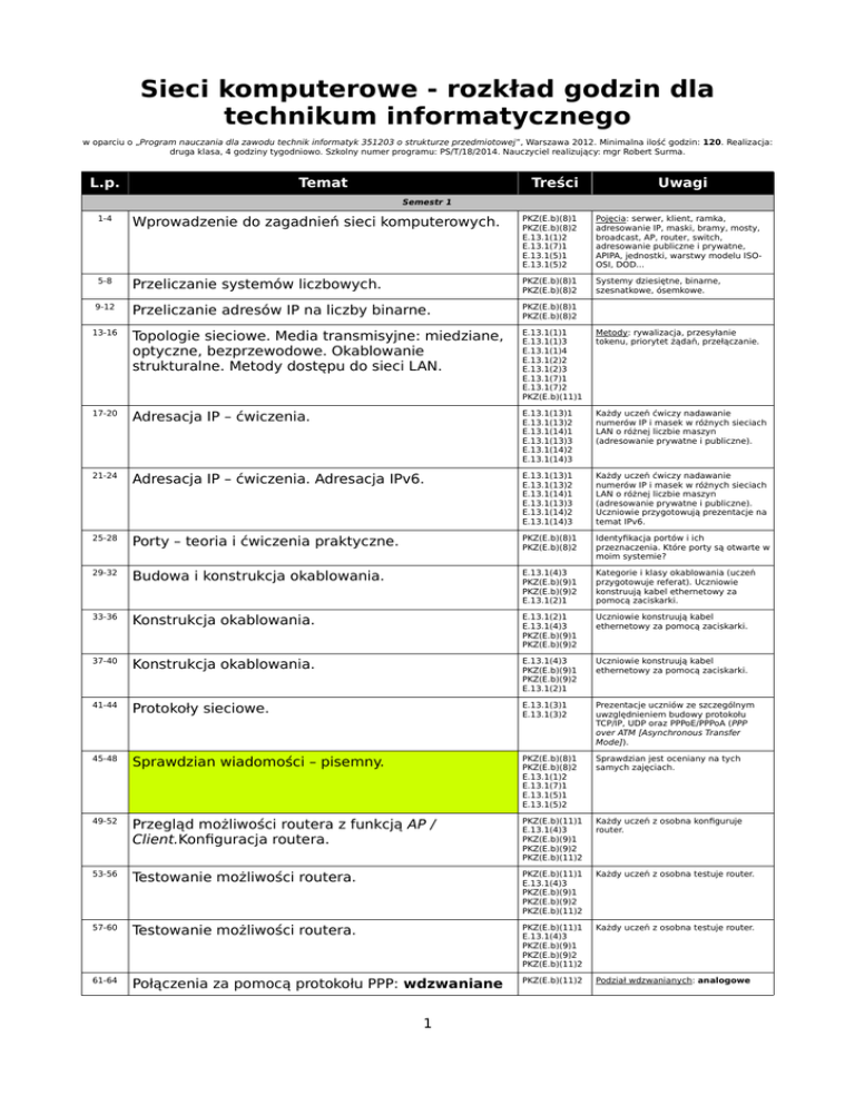 Sieci komputerowe - rozkład godzin dla technikum informatycznego w oparciu o „Program nauczania dla zawodu technik informatyk 351203 o strukturze przedmiotowej”, Warszawa 2012. Minimalna ilość godzin: 120. Realizacja: druga klasa, 4 godziny tygodniowo. Szkolny numer programu: PS/T/18/2014. Nauczyciel realizujący: mgr Robert Surma. L.p. Temat Treści Uwagi Semestr 1 1-4 Wprowadzenie do zagadnień sieci komputerowych. PKZ(E.b)(8)1 PKZ(E.b)(8)2 E.13.1(1)2 E.13.1(7)1 E.13.1(5)1 E.13.1(5)2 Pojęcia: serwer, klient, ramka, adresowanie IP, maski, bramy, mosty, broadcast, AP, router, switch, adresowanie publiczne i prywatne, APIPA, jednostki, warstwy modelu ISOOSI, DOD... 5-8 Przeliczanie systemów liczbowych. PKZ(E.b)(8)1 PKZ(E.b)(8)2 Systemy dziesiętne, binarne, szesnatkowe, ósemkowe. Przeliczanie adresów IP na liczby binarne. PKZ(E.b)(8)1 PKZ(E.b)(8)2 13-16 Topologie sieciowe. Media transmisyjne: miedziane, optyczne, bezprzewodowe. Okablowanie strukturalne. Metody dostępu do sieci LAN. E.13.1(1)1 E.13.1(1)3 E.13.1(1)4 E.13.1(2)2 E.13.1(2)3 E.13.1(7)1 E.13.1(7)2 PKZ(E.b)(11)1 Metody: rywalizacja, przesyłanie tokenu, priorytet żądań, przełączanie. 17-20 Adresacja IP – ćwiczenia. E.13.1(13)1 E.13.1(13)2 E.13.1(14)1 E.13.1(13)3 E.13.1(14)2 E.13.1(14)3 Każdy uczeń ćwiczy nadawanie numerów IP i masek w różnych sieciach LAN o różnej liczbie maszyn (adresowanie prywatne i publiczne). 21-24 Adresacja IP – ćwiczenia. Adresacja IPv6. E.13.1(13)1 E.13.1(13)2 E.13.1(14)1 E.13.1(13)3 E.13.1(14)2 E.13.1(14)3 Każdy uczeń ćwiczy nadawanie numerów IP i masek w różnych sieciach LAN o różnej liczbie maszyn (adresowanie prywatne i publiczne). Uczniowie przygotowują prezentacje na temat IPv6. 25-28 Porty – teoria i ćwiczenia praktyczne. PKZ(E.b)(8)1 PKZ(E.b)(8)2 Identyfikacja portów i ich przeznaczenia. Które porty są otwarte w moim systemie? 29-32 Budowa i konstrukcja okablowania. E.13.1(4)3 PKZ(E.b)(9)1 PKZ(E.b)(9)2 E.13.1(2)1 Kategorie i klasy okablowania (uczeń przygotowuje referat). Uczniowie konstruują kabel ethernetowy za pomocą zaciskarki. 33-36 Konstrukcja okablowania. E.13.1(2)1 E.13.1(4)3 PKZ(E.b)(9)1 PKZ(E.b)(9)2 Uczniowie konstruują kabel ethernetowy za pomocą zaciskarki. 37-40 Konstrukcja okablowania. E.13.1(4)3 PKZ(E.b)(9)1 PKZ(E.b)(9)2 E.13.1(2)1 Uczniowie konstruują kabel ethernetowy za pomocą zaciskarki. 41-44 Protokoły sieciowe. E.13.1(3)1 E.13.1(3)2 Prezentacje uczniów ze szczególnym uwzględnieniem budowy protokołu TCP/IP, UDP oraz PPPoE/PPPoA (PPP over ATM [Asynchronous Transfer Mode]). 45-48 Sprawdzian wiadomości – pisemny. PKZ(E.b)(8)1 PKZ(E.b)(8)2 E.13.1(1)2 E.13.1(7)1 E.13.1(5)1 E.13.1(5)2 Sprawdzian jest oceniany na tych samych zajęciach. 49-52 Przegląd możliwości routera z funkcją AP / Client.Konfiguracja routera. PKZ(E.b)(11)1 E.13.1(4)3 PKZ(E.b)(9)1 PKZ(E.b)(9)2 PKZ(E.b)(11)2 Każdy uczeń z osobna konfiguruje router. 53-56 Testowanie możliwości routera. PKZ(E.b)(11)1 E.13.1(4)3 PKZ(E.b)(9)1 PKZ(E.b)(9)2 PKZ(E.b)(11)2 Każdy uczeń z osobna testuje router. 57-60 Testowanie możliwości routera. PKZ(E.b)(11)1 E.13.1(4)3 PKZ(E.b)(9)1 PKZ(E.b)(9)2 PKZ(E.b)(11)2 Każdy uczeń z osobna testuje router. 61-64 Połączenia za pomocą protokołu PPP: wdzwaniane PKZ(E.b)(11)2 Podział wdzwanianych: analogowe 9-12 1 L.p. Temat Treści Uwagi (komutowane/Dial-Up), oddzwaniane (call back), szerokopasmowe. (przez port szeregowy, na numer 0202122, do 56kb/s) i cyfrowe (ISDN [Integrated Services Digital Network], GSM, GPRS, EDGE, UMTS). Podział szerokopasmowych (wyższa częstotliwość przesyłu danych): DLS, ADLS. 65-68 Podsumowanie materiału i wystawianie ocen śródrocznych. Temat może być spoza podstawy programowej. 69-72 Temat zaproponowany przez uczniów. Temat może być spoza podstawy programowej. Semestr 2 73-76 Technologia NFC. PKZ(E.b)(11)1 Uczeń przygotowuje prezentację na temat technologii „Near Field Communications”. 77-80 Narzędzia diagnostyczne. E.13.1(7)5 Poczynając od ipconfig, ping, tracerout a kończąc na bardziej zaawansowanych. 81-84 Symbole graficzne urządzeń sieciowych, normy i schematy sieci. E.13.1(2)4 E.13.1(4)1 E.13.1(4)2 E.13.1(6)1 E.13.1(6)3 E.13.1(6)4 E.13.1(6)6 E.13.1(7)3 E.13.1(7)4 E.13.1(8)1 E.13.1(14)4 PKZ(E.b)(13)1 PKZ(E.b)(13)2 PKZ(E.b)(13)3 Uczeń poznaje i opracowuje graficznie schemat przykładowej sieci. Można skorzystać z darmowego programu Dia dla Windows i Linux (http://projects.gnome.org/dia/). 85-88 Symbole graficzne urządzeń sieciowych, normy i schematy sieci. E.13.1(2)4 E.13.1(4)1 E.13.1(4)2 E.13.1(6)1 E.13.1(6)3 E.13.1(6)4 E.13.1(6)6 E.13.1(7)3 E.13.1(7)4 E.13.1(8)1 E.13.1(14)4 PKZ(E.b)(13)1 PKZ(E.b)(13)2 PKZ(E.b)(13)3 89-92 Symbole graficzne urządzeń sieciowych, normy i schematy sieci. Cennik sieci komputerowych. E.13.1(2)4 E.13.1(4)1 E.13.1(4)2 E.13.1(6)1 E.13.1(6)2 E.13.1(6)3 E.13.1(6)4 E.13.1(6)5 E.13.1(6)6 E.13.1(7)3 E.13.1(7)4 E.13.1(8)1 E.13.1(8)2 E.13.1(8)3 E.13.1(8)4 E.13.1(8)5 E.13.1(14)4 PKZ(E.b)(13)1 PKZ(E.b)(13)2 PKZ(E.b)(13)3 93-96 Symbole graficzne urządzeń sieciowych, normy i schematy sieci. Cennik sieci komputerowych. E.13.1(2)4 E.13.1(4)1 E.13.1(4)2 E.13.1(6)1 E.13.1(6)2 E.13.1(6)3 E.13.1(6)4 E.13.1(6)5 E.13.1(6)6 E.13.1(7)3 E.13.1(7)4 E.13.1(8)1 E.13.1(8)2 E.13.1(8)3 E.13.1(8)4 E.13.1(8)5 E.13.1(14)4 PKZ(E.b)(13)1 PKZ(E.b)(13)2 PKZ(E.b)(13)3 „Podstawy sieci” - kurs w ramach Microsoft Virtual PKZ(E.b)(8)1 97-100 2 Uczniowie robią wycenę budowy przykładowej sieci wraz z harmonogramem pracy i dokumentacją. Wystawiają fakturę. L.p. Temat Treści Uwagi Academy PKZ(E.b)(8)1 E.13.1(1)1 E.13.1(1)2 E.13.1(1)3 E.13.1(1)4 E.13.1(3)1 E.13.1(3)2 E.13.1(13)1 101-104 „Podstawy sieci” - kurs w ramach Microsoft Virtual Academy PKZ(E.b)(8)1 PKZ(E.b)(8)1 E.13.1(1)1 E.13.1(1)2 E.13.1(1)3 E.13.1(1)4 E.13.1(3)1 E.13.1(3)2 E.13.1(13)1 105-108 „Podstawy sieci” - kurs w ramach Microsoft Virtual Academy PKZ(E.b)(8)1 PKZ(E.b)(8)1 E.13.1(1)1 E.13.1(1)2 E