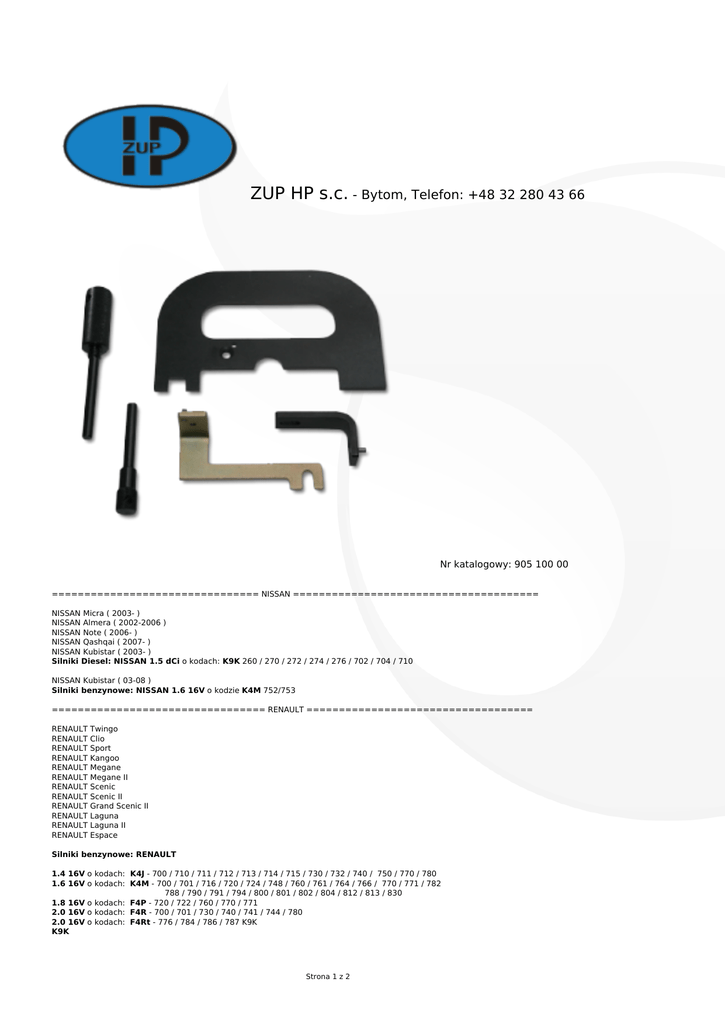 ZUP HP s.c. - Bytom, Telefon: +48 32 280 43 66 Nr katalogowy: 905 100 00 ================================ NISSAN ====================================== NISSAN Micra ( 2003- ) NISSAN Almera ( 2002-2006 ) NISSAN Note ( 2006- ) NISSAN Qashqai ( 2007- ) NISSAN Kubistar ( 2003- ) Silniki Diesel: NISSAN 1.5 dCi o kodach: K9K 260 / 270 / 272 / 274 / 276 / 702 / 704 / 710 NISSAN Kubistar ( 03-08 ) Silniki benzynowe: NISSAN 1.6 16V o kodzie K4M 752/753 ================================= RENAULT =================================== RENAULT RENAULT RENAULT RENAULT RENAULT RENAULT RENAULT RENAULT RENAULT RENAULT RENAULT RENAULT Twingo Clio Sport Kangoo Megane Megane II Scenic Scenic II Grand Scenic II Laguna Laguna II Espace Silniki benzynowe: RENAULT 1.4 16V o kodach: K4J - 700 / 710 / 711 / 712 / 713 / 714 / 715 / 730 / 732 / 740 / 750 / 770 / 780 1.6 16V o kodach: K4M - 700 / 701 / 716 / 720 / 724 / 748 / 760 / 761 / 764 / 766 / 770 / 771 / 782 788 / 790 / 791 / 794 / 800 / 801 / 802 / 804 / 812 / 813 / 830 1.8 16V o kodach: F4P - 720 / 722 / 760 / 770 / 771 2.0 16V o kodach: F4R - 700 / 701 / 730 / 740 / 741 / 744 / 780 2.0 16V o kodach: F4Rt - 776 / 784 / 786 / 787 K9K K9K Strona 1 z 2 DACIA Logan 1.5 dCi =================================== OPEL ===================================== OPEL Vivaro (2001-) Silniki benzynowe: OPEL 2.0 16V o kodzie F4R 720 / 722 / 820 ============================================================================= Dodatkowo można kupić blokadę kół rozrządu do silników 16 V. Niezbędna przy demontażu i montażu kół zębatych wałków rozrządu Art. 905 130 00 Strona 2 z 2