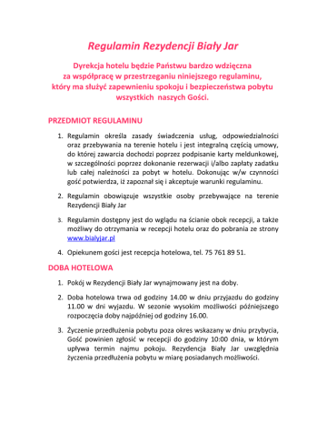 Regulamin Rezydencji Biały Jar Dyrekcja hotelu będzie Państwu bardzo wdzięczna za współpracę w przestrzeganiu niniejszego regulaminu, który ma służyć zapewnieniu spokoju i bezpieczeństwa pobytu wszystkich naszych Gości. PRZEDMIOT REGULAMINU 1. Regulamin określa zasady świadczenia usług, odpowiedzialności oraz przebywania na terenie hotelu i jest integralną częścią umowy, do której zawarcia dochodzi poprzez podpisanie karty meldunkowej, w szczególności poprzez dokonanie rezerwacji i/albo zapłaty zadatku lub całej należności za pobyt w hotelu. Dokonując w/w czynności gość potwierdza, iż zapoznał się i akceptuje warunki regulaminu. 2. Regulamin obowiązuje wszystkie osoby przebywające na terenie Rezydencji Biały Jar 3. Regulamin dostępny jest do wglądu na ścianie obok recepcji, a także możliwy do otrzymania w recepcji hotelu oraz do pobrania ze strony www.bialyjar.pl 4. Opiekunem gości jest recepcja hotelowa, tel. 75 761 89 51. DOBA HOTELOWA 1. Pokój w Rezydencji Biały Jar wynajmowany jest na doby. 2. Doba hotelowa trwa od godziny 14.00 w dniu przyjazdu do godziny 11.00 w dni wyjazdu. W sezonie wysokim możliwości późniejszego rozpoczęcia doby najpóźniej od godziny 16.00. 3. Życzenie przedłużenia pobytu poza okres wskazany w dniu przybycia, Gość powinien zgłosić w recepcji do godziny 10:00 dnia, w którym upływa termin najmu pokoju. Rezydencja Biały Jar uwzględnia życzenia przedłużenia pobytu w miarę posiadanych możliwości. USŁUGI I USŁUGI DODATKOWE 1. Rezydencja Biały Jar ma obowiązek zapewnić: – warunki pełnego i nieskrępowanego wypoczynku Gościa, – bezpieczeństwo pobytu, w tym zachowanie tajemnicy informacji o Gościu, – profesjonalną i uprzejmą obsługę, – sprzątanie pokoju i wykonywanie niezbędnej naprawy urządzeń w przypadku zgłoszenia tego do recepcji, – w miarę posiadanych możliwości udostępnić inny pokój lub w inny sposób złagodzić niedogodności, gdy występujące w pokoju usterki nie będą mogły być usunięte, – miejsce parkingowe na monitorowanym parkingu. 2. Na życzenie Gościa Rezydencja Biały Jar świadczy nieodpłatnie następujące usługi: – udzielania informacji związanych z pobytem i podróżą, – budzenie o wyznaczonej godzinie. 3. W celu zapewnienia wszystkim Gościom bezpieczeństwa i spokojnego pobytu, cisza nocna obowiązuje od godz. 22:00 do 6:00. Hotel może odmówić dalszego świadczenia usług osobie, która narusza tę zasadę. 4. Recepcja hotelowa pozostaje do dyspozycji gości od 8:00 -22:00, po godzinie 22:00 dyżur pełni portier nocny. 5. Drink bar czynny jest całodobowo z wyłączeniem sezonu niskiego. ODPOWIEDZIALNOŚĆ GOŚCI 1. Poza nieznacznym przestawieniem mebli i wyposażenia, nienaruszającym ich funkcjonalności i bezpieczeństwa korzystania, Gościom nie wolno dokonywać jakichkolwiek zmian w pokojach i ich wyposażeniu. 2. Gość ponosi odpowiedzialność materialną za wszelkiego rodzaju uszkodzenia lub zniszczenia przedmiotów wyposażenia i urządzeń technicznych w Rezydencji Biały Jar, powstałe z jego winy lub z winy odwiedzających Go osób . 3. Przed zdaniem kluczy obsługa ma prawo dokonać przeglądu pokoju w obecności Gościa (846-849 KC). 4. Każdorazowo opuszczając pokój Gość powinien zgasić światło, sprawdzić zamknięcie drzwi, a klucz pozostawić w recepcji. W przypadku zamka na kartę Gośc pozostawia kartę w recepcji. W przypadku zagubienia karty do zamka Gośc uiszcza za nią opłatę w wysokości 50 zł. 5. Gość nie może przekazywać pokoju osobom trzecim, nawet jeśli nie upłynął okres, za który uiścił należną za pobyt opłatę. 6. Osoby nie zameldowane w Rezydencji Biały Jar mogą przebywać w pokoju od godziny 10.00 do 22.00. W przypadku niezastosowania się do tego wymogu Gość zameldowany będzie musiał uiścić opłatę dodatkową w wysokości 100% stawki dobowej. 7. Ze względu na bezpieczeństwo przeciwpożarowe bezwzględnie zabronione jest palenie tytoniu, używanie w pokojach grzałek, żelazek elektrycznych i innych podobnych urządzeń, nie stanowiących wyposażenia pokoju. Nie zastosowanie się do zakazu, spowoduje obciążenie rachunku Gościa pokryciem kosztów związanych z chemicznym czyszczeniem wykładzin, firan, pościeli w kwocie 500zł /złamanie zakazu palenia/. 8. Na terenie Rezydencji Biały Jar i wokół obiektu z wyłączeniem pokoi obowiązuje zakaz spożywania alkoholu nie zakupionego w barze hotelowym. Złamanie tego zakazu wiąże się z dodatkową opłatą 100 zł za każdorazowe jego złamanie. 9. Na terenie Hotelu dzieci w wieku poniżej 12 lat powinny znajdować się pod stałym nadzorem opiekunów prawnych. Opiekunowie prawni ponosić będą odpowiedzialność materialną za wszelkie szkody przedmiotów wyposażenia i urządzeń technicznych powstałe w wyniku działania dzieci. ODPOWIEDZIALNOŚĆ HOTELU 1. Hotelowi przysługuje ustawowe prawo zastawu na rzeczach wniesionych przez Gościa do Hotelu w razie opóźniania się Gościa z uregulowaniem płatności za pobyt lub nieuregulowania należności za świadczone usługi. 2. Rezydencja Biały Jar może odmówić przyjęcia Gościa, który podczas poprzedniego pobytu rażąco naruszył regulamin wyrządzając szkodę w mieniu obiektu lub gości, szkodę na osobie gości, pracowników lub innych osób przebywających w Rezydencji Biały Jar albo też w inny sposób zakłócił spokojny pobyt gości lub funkcjonowania obiektu. 3. Hotel nie ponosi odpowiedzialności z tytułu utraty lub uszkodzenia pieniędzy, papierów wartościowych, kosztowności albo przedmiotów mających wartość naukową lub artystyczną, jeżeli przedmioty te nie zostaną oddane do depozytu w recepcji. 4. Hotel zastrzega sobie prawo do odmowy przyjęcia do depozytu hotelowego przedmiotów o dużej wartości, znacznych kwot pieniężnych, przedmiotów zagrażających bezpieczeństwu oraz przedmiotów wielkogabarytowych, przekr