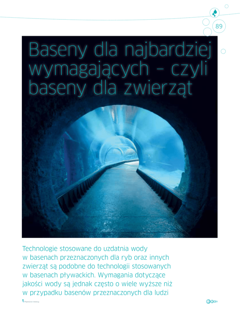89 Baseny dla najbardziej wymagających – czyli baseny dla zwierząt Technologie stosowane do uzdatnia wody w basenach przeznaczonych dla ryb oraz innych zwierząt są podobne do technologii stosowanych w basenach pływackich. Wymagania dotyczące jakości wody są jednak często o wiele wyższe niż w przypadku basenów przeznaczonych dla ludzi 90 Takie baseny zachwycą nie tylko dzieci Najbardziej wymagający pływacy – rekiny Pingwiny – pierwsi mieszkańcy basenów TEKST | Władysław Sobiech FOTO | Archiwum Firmy T Klarowność wody niespotykana w basenach pływackich echnologie stosowane do uzdatnia wody w basenach przeznaczonych dla ryb oraz innych zwierząt są podobne do technologii stosowanych w basenach pływackich. Wymagania dotyczące jakości wody są jednak często o wiele wyższe niż w przypadku basenów przeznaczonych dla ludzi. Szczególnie wysokie wymagania stawiane są parametrom wody słonej. W przypadku kłopotów na basenie pływackim jest możliwość jego zamknięcia, przeprowadzenia odpowiednich zabiegów – łącznie z opróżnieniem niecek basenowych i powtórnym ich uruchomieniem. W basenie, szczególnie z wodą słoną, w którym przebywają zwierzęta, nie ma takiej możliwości bez bardzo przykrych konsekwencji. Woda po jej „wyprodukowaniu” wymaga dodatkowo „dojrzewania”, nawet przez okres kilku miesięcy. Opróżnienie takiego basenu to katastrofa dla zwierząt i zarządcy obiektu. Wiele technologii, poza technologiami filtracji i dezynfekcji wykorzystywanymi w budowie basenów pływackich, jest wprost lub po pewnych modyfikacjach wykorzystywana w budowie basenów dla zwierząt. Jako przykład zostaną zaprezentowane, w kolejnych wydaniach PiB, rozwiązania zastosowane przy budowie Afrykarium w ZOO we Wrocławiu, gdzie instalacje technologiczne wykonywane były przez firmy: TRANSCOM Sp. z o.o. z siedzibą w Katowicach oraz FUNAM Sp. z o.o. z siedzibą we Wrocławiu. Generalnym wykonawcą inwestycji była spółka INTER SYSTEM S.A. 91 Instalacja mikrofiltracji do odzyskiwania wody z popłuczyn filtracyjnych Basen dla hipopotamów to prawdziwe wyzwanie dla technologii wody Wymagania jakościowe dla pomp i urządzeń w basenach wody morskiej są bardzo wysokie P R O M O C J A fi Wrocławskie Afrykarium posiada ltry biologiczne, enifikatory do redukcji azotanów, następujące, podstawowe obiegi d kłady redukcji fosforanów, u technologiczne wody: kłady redukcji krzemianów, u 1. Morze Czerwone i nstalacje wytwarzania wody morskiej. 2. Hipopotamy Ciekawym rozwiązaniem, możliwym 3. Tanganika i Malawi do zastosowania w obiektach basenowych, 4. Basen – rekiny są wykonane tam instalacje mikrofiltracji 5. Uchatki afrykańskie i pingwiny do odzyskiwania wód popłucznych z filtrów. 6. Manaty W kolejnym wydaniu „Pływalni 7. Krokodyle nilowe Instalacje pracujące w pełnej automatyce i Basenów” zostaną szczegółowo 8. Wodospad zaprezentowane zarówno sposoby uzdatnia wody, jak 9. Potok Kongo i technologie stosowane do uszczelnienia basenów. 10. Uzdatnianie cieczy osadowej 11. Instalacje – przygotowanie wody morskiej. W skład instalacji technologicznych wchodzą elementy o podobnych funkcjach jak w przypadku basenów pływackich. Autor jest prezesem zarządu firmy Transcom Sp. z o.o. Do elementów tych należą: filtracja wstępna, filtracja na filtrach wielowarstwowych, Transcom Sp. z o.o. dezynfekcja promieniami UV, ul. Józefowska 5 ozonowanie, 40-145 Katowice tel.: 32 201 08 74 podgrzewanie wody. faks: 32 201 65 36 Dodatkowo stosowane są inne elementy konieczne ze względu [email protected] na charakter basenów: www.transcom.pl układy chłodzenia wody, filtry do usuwania protein,