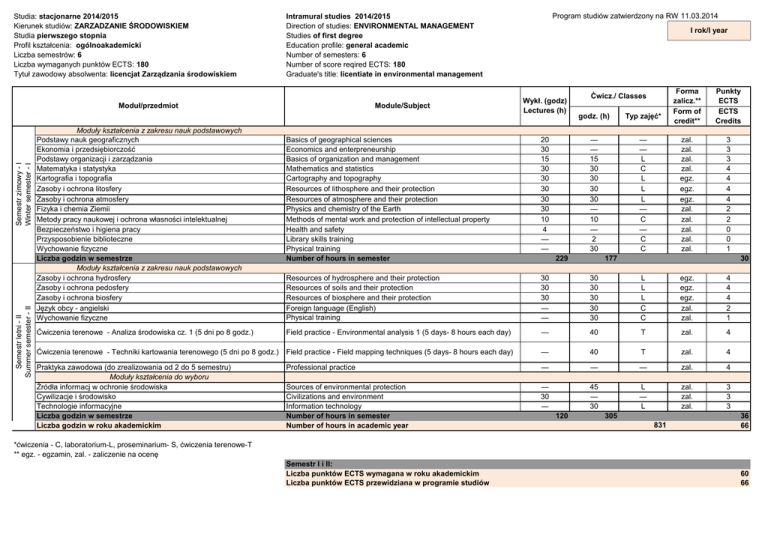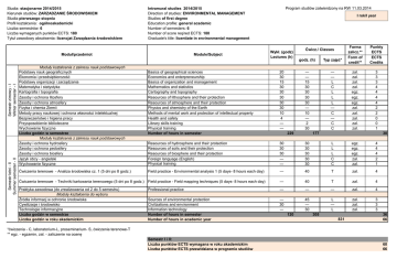Studia: stacjonarne 2014/2015 Kierunek studiów: ZARZADZANIE ŚRODOWISKIEM Studia pierwszego stopnia Profil kształcenia: ogólnoakademicki Liczba semestrów: 6 Liczba wymaganych punktów ECTS: 180 Tytuł zawodowy absolwenta: licencjat Zarządzania środowiskiem Semestr letni - II Summer semester - II Semestr zimowy - I Winter semester - I Moduł/przedmiot Moduły kształcenia z zakresu nauk podstawowych Podstawy nauk geograficznych Ekonomia i przedsiębiorczość Podstawy organizacji i zarządzania Matematyka i statystyka Kartografia i topografia Zasoby i ochrona litosfery Zasoby i ochrona atmosfery Fizyka i chemia Ziemii Metody pracy naukowej i ochrona własności intelektualnej Bezpieczeństwo i higiena pracy Przysposobienie biblioteczne Wychowanie fizyczne Liczba godzin w semestrze Moduły kształcenia z zakresu nauk podstawowych Zasoby i ochrona hydrosfery Zasoby i ochrona pedosfery Zasoby i ochrona biosfery Język obcy - angielski Wychowanie fizyczne Program studiów zatwierdzony na RW 11.03.2014 Intramural studies 2014/2015 Direction of studies: ENVIRONMENTAL MANAGEMENT Studies of first degree Education profile: general academic Number of semesters: 6 Number of score reqired ECTS: 180 Graduate's title: licentiate in environmental management Module/Subject I rok/I year Wykł. (godz) Lectures (h) Ćwicz./ Classes godz. (h) Typ zajęć* — — 15 30 30 30 30 — 10 — 2 30 — — L C L L L — C — C C Forma zalicz.** Form of credit** Punkty ECTS ECTS Credits zal. zal. zal. zal. egz. egz. egz. zal. zal. zal. zal. zal. 3 3 3 4 4 4 4 2 2 0 0 1 Basics of geographical sciences Economics and enterpreneurship Basics of organization and management Mathematics and statistics Cartography and topography Resources of lithosphere and their protection Resources of atmosphere and their protection Physics and chemistry of the Earth Methods of mental work and protection of intellectual property Health and safety Library skills training Physical training Number of hours in semester 20 30 15 30 30 30 30 30 10 4 — — Resources of hydrosphere and their protection Resources of soils and their protection Resources of biosphere and their protection Foreign language (English) Physical training 30 30 30 — — 30 30 30 30 30 L L L C C egz. egz. egz. zal. zal. 4 4 4 2 1 Ćwiczenia terenowe - Analiza środowiska cz. 1 (5 dni po 8 godz.) Field practice - Environmental analysis 1 (5 days- 8 hours each day) — 40 T zal. 4 Ćwiczenia terenowe - Techniki kartowania terenowego (5 dni po 8 godz.) Field practice - Field mapping techniques (5 days- 8 hours each day) — 40 T zal. 4 Praktyka zawodowa (do zrealizowania od 2 do 5 semestru) Moduły kształcenia do wyboru Źródła informacj w ochronie środowiska Cywilizacje i środowisko Technologie informacyjne Liczba godzin w semestrze Liczba godzin w roku akademickim Professional practice — — — zal. 4 Sources of environmental protection Civilizations and environment Information technology Number of hours in semester Number of hours in academic year — 30 ― 45 — 30 L — L zal. zal. zal. 3 3 3 229 120 177 30 305 831 36 66 *ćwiczenia - C, laboratorium-L, proseminarium- S, ćwiczenia terenowe-T ** egz. - egzamin, zal. - zaliczenie na ocenę Semestr I i II: Liczba punktów ECTS wymagana w roku akademickim Liczba punktów ECTS przewidziana w programie studiów 60 66 Program studiów zatwierdzony na RW 11.03.2014 Studia: stacjonarne 2015/2016 Kierunek studiów: ZARZADZANIE ŚRODOWISKIEM Studia pierwszego stopnia Profil kształcenia: ogólnoakademicki Liczba semestrów: 6 Liczba wymaganych punktów ECTS: 180 Tytuł zawodowy absolwenta: licencjat Zarządzania środowiskiem Intramural studies 2015/2016 Direction of studies: ENVIRONMENTAL MANAGEMENT Studies of first degree Education profile: general academic Number of semesters: 6 Number of score reqired ECTS: 180 Graduate's title: licentiate in environmental management Semestr letni - IV Summer semester - IV Semestr zimowy - III Winter semester - III Moduł/przedmiot Moduły kształcenia z zakresu nauk podstawowych Ekologia krajobrazu Podstawy zarządzania środowiskiem Systemy informacji geograficznej w badaniach srodowiskowych Język obcy - angielski Moduły kształcenia do wyboru Monitoring środowiska przyrodniczego Podstawy gospodarki przestrzennej Zróżnicowanie regionalne Polski Przedmioty do wyboru z oferty WNGiG (wykłady 15 lub 30 godz. odpowiednio 1 lub 2 pkt. ECTS) Module/Subject II rok/I year Wykł. (godz) Lectures (h) Ćwicz./ Classes godz. (h) Typ zajęć* Forma zalicz.** Form of credit** Punkty ECTS ECTS Credits Landscape ecology Bacics of environmental management Geographic Information Systems in environmental studies Foreign language (English) 30 30 15 — 30 30 60 30 L L L C egz. egz. zal. zal. 5 5 6 2 Monitoring of natural environment Basics of spatial management Regional diversity of Polish 15 30 30 30 — — L — — zal. egz. egz. 4 4 4 Facultative courses 60 ― — zal. 4 Liczba godzin w semestrze Moduły kształcenia z zakresu nauk podstawowych Gospodarka odpadami Prawo w ochronie środowiska Język obcy - angielski Number of hours in semester Waste management Law in environmental protection Foreign language (English) 30 30 — 30 15 30 L L C egz. egz. zal. 4 4 2 Ćwiczenia terenowe - Analiza środowiska cz. 2 (5 dni po 8 godz.) Field practice - Environmental analysis 2 (5 days- 8 hours each day) — 40 T zal. 4 Ćwiczenia terenowe regionalne - Człowiek - środowisko (5 dni po 8 godz.) Regional field practice - Man and environment (5 days- 8 hours each day) — 40 T zal. 4 30 30 30 15 15 15 15 30 L L L L zal. egz. egz. zal. 4 4 4 4 Moduły kształcenia do wyboru Gospodarka wodna Rozwój i planowanie miast Rozwój i planowanie terenów wiejskich Teledetekcja Liczba godzin w semestrze Liczba godzin w roku akademickim Water management Urban development and planning Rural development and planning Remote sensing Number of hours in semester Number of hours in academic year 210 165 18