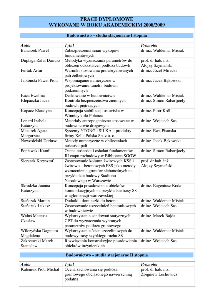 prace dyplomowe wykonane w roku akademickim 2008/2009