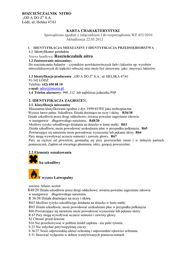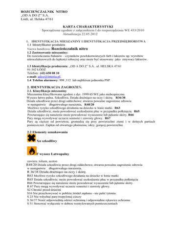 ROZCIEŃCZALNIK NITRO „OD A DO Z” S.A. Łódź, ul. Helska 47/61 KARTA CHARAKTERYSTYKI Sporządzona zgodnie z załącznikiem I do rozporządzenia WE 453/2010 Aktualizacja 22.05.2012 1. IDENTYFIKACJA MIESZANINY I IDENTYFIKACJA PRZEDSIĘBIORSTWA 1.1 Identyfikator produktu Nazwa handlowa: Rozcieńczalnik nitro 1.2 Zastosowanie mieszaniny: Do rozcieńczania ftalanów – czynników powłokotwórczych farb i lakierów np. wyrobów nitrocelulozowych do lepkości roboczej oraz może być stosowany jako zmywacz lakierów. 1.3 Identyfikacja producenta: „OD A DO Z” S.A.. ul. HELSKA 47/61 91-342 ŁÓDŹ Telefon: (42) 650 08 10 e-mail: [email protected]. 1.4 Telefon alarmowy: 998 ,112 lub najbliższa jednostka PSP 2. IDENTYFIKACJA ZAGROŻEŃ. 2.1. Klasyfikacja mieszaniny Mieszanina klasyfikowana zgodnie z dyr. 1999/45/WE jako niebezpieczna. Wysoce łatwo palna. Szkodliwa. Działa drażniąco na oczy i skórę. R36/38 Działa szkodliwie przez drogi oddechowe; stwarza poważne zagrożenie zdrowia w następstwie długotrwałego narażenia. R48/20 Możliwe ryzyko szkodliwego działania na dziecko w łonie matki. R63 Działa szkodliwie; może powodować uszkodzenie płuc w przypadku połknięcia. R65 Powtarzające się narażenie może powodować wysuszenie lub pękanie skóry. R66 Pary mogą wywoływać uczucie senności i zawroty głowy. R67 Pary są cięższe od powietrza, gromadzą się przy powierzchni ziemi i w dolnych partiach pomieszczeń. Zapłon od otwartego płomienia, iskry, gorącej powierzchni. 2.2 Elementy oznakowania Xn szkodliwy F wysoce Łatwopalny zawiera :toluen, aceton R48/20 Działa szkodliwie przez drogi oddechowe; stwarza poważne zagrożenie zdrowia w następstwie długotrwałego narażenia. R 36/38 Działa drażniąco na oczy i skórę. R63 Możliwe ryzyko szkodliwego działania na dziecko w łonie matki R65 Działa szkodliwie; może powodować uszkodzenie płuc w przypadku połknięcia R66 Powtarzające się narażenie może powodować wysuszenie lub pękanie skóry. R 67 Pary mogą wywoływać uczucie senności i zawroty głowy. S2 Chronić przed dziećmi S16 Nie przechowywać w pobliżu źródeł zapłonu - nie palić tytoniu. S 23 Nie wdychać pary/rozpylonej cieczy S 36/37 Nosić odpowiednią odzież ochronną i odpowiednie rękawice ochronne S 51 Stosować wyłącznie w dobrze wentylowanych pomieszczeniach ROZCIEŃCZALNIK NITRO „OD A DO Z” S.A. Łódź, ul. Helska 47/61 S 62 W razie połknięcia nie wywoływać wymiotów: niezwłocznie zasięgnąć porady lekarza i pokazać opakowanie lub etykietę. Zawartość lotnych związków organicznych (LZO): 99,8 % obj. 3. SKŁAD/INFORMACJA O SKŁADNIKACH. Produkt jest mieszaniną substancji niebezpiecznych: 1. Aceton(propan-2-on) Nr CAS 67-64-1, Nr WE 200-662-2 stężenie 15 – 35% klasyfikacja zgodnie z zał.I do dyrektywy 67/548/EWG: F R11, Xi, R 36, R66, R67 klasyfikacja zgodnie z rozp. WE 1272/2008 : Flam Liq.2 H225, Eye Irrit. 2 H 319, STOS SE 3 H 336, EUH 066 GHS 02, 07 Dgr. 2.toluen Nr CAS 108-88-3, Nr WE 203-625-9 stężenie 45-65% klasyfikacja zgodnie z zał.I do dyrektywy 67/548/EWG: F, Xn, R-11-38-48/20-63-65-67 klasyfikacja zgodnie z rozp. WE 1272/2008 : Flam. Liq. 2H225, Repr. 2 H361d , Asp. Tox. 1 , STOT RE 2 (H304 ,Skin Irrit. 2), H373, STOT SE 3 H315, H336, GHS02,GHS08,GHS07,Dgr 3.octan butylu Nr CAS 123-86-4, Nr WE 204-658-1 stężenie pon. 5% klasyfikacja zgodnie z zał. I do dyrektywy 67/548/EWG: 10-66-67 klasyfikacja zgodnie z rozp. WE 1272/2008 : Flam. Liq. 3 H226, STOT SE 3 ,EUH066 4. ŚRODKI PIERWSZEJ POMOCY Wyprowadzić poszkodowaną osobę z zanieczyszczonego produktem środowiska. Ułożyć na lewym boku z głową skierowana w dół. Skontaktować się z lekarzem lub centrum toksykologicznym Po wdychaniu: Ułożyć poszkodowaną osobę w pozycji leżącej. Stosować sztuczne oddychanie lub z przerwami podawać tlen z dodatkiem ditlenku węgla. Zapewnić pomoc lekarską. Po połknięciu: Przepłukać usta wodą. Podać 1-2 szklanki wody do wypicia. Nie wywoływać wymiotów u osoby nieprzytomnej. Zapewnić spokój, leżenie i ciepło. Zapewnić pomoc lekarską Kontakt z oczami Przemyć skażone oczy większą ilością letniej wody przez 15 minut, przy wywiniętych powiekach (usunąć przedtem szkła kontaktowe). W przypadku konieczności zapewnić pomoc okulisty Kontakt ze skórą: Zdjąć skażone ubranie. Skażoną skórę przemyć dużą ilością wody, a następnie wodą z łagodnym mydłem. Zasięgnąć porady dermatologa, gdy wystąpi podrażnienie skóry. Personelowi medycznemu okazać kartę charakterystyki lub etykietę produktu. 5. POSTĘPOWANIE W PRZYPADKU POŻARU 5.1 Zagrożenia pożarowe W warunkach normalnych ciecz wysoce łatwopalna. R11 W sprzyjających warunkach termicznych pary tworzą z powietrzem mieszaniny wybuchowe. Pary są cięższe od powietrza – gromadzą się przy powierzchni i w dolnych partiach pomieszczeń. 5.2 Środki gaśnicze gaśnice CO2, gaśnice proszkowe z proszkiem gaszącym ABC lub BC, gaśnice pianowe, 5.3 Środki gaśnicze, jakich nie należy stosować: Nie kierować zwartych strumieni wody na powierzchnię palącego się produktu. 5.4 Gaszenie pożaru ROZCIEŃCZALNIK NITRO „OD A DO Z” S.A. Łódź, ul. Helska 47/61 Mały pożar gasić gaśnicą śniegową (CO2) lub proszkową (ABC albo BC), duży pożar gasić pianą rozproszonymi prądami wody. Pojemniki narażone na działanie ognia lub wysokiej temperatury chłodzić wodą, i w miarę możliwości usunąć z zagrożonego obszaru. 5.5 Sprzęt ochronny strażaków: Aparaty izolujące drogi oddechowe. Ubrania ochronne odporne na działanie rozpuszczalników organicznych. Eksplozymetr. Uwaga dodatkowa W procesie spalania powstaje ditlenek węgla , tlenek węgla, tlenki azotu 6. POSTĘPOWANIE W PRZYPADKU NIEZAMIERZONEGO UWOLNIENIA DO ŚRODOWISKA 6.1 Środki ochrony indywidualnej: Ubrania robocze ze zwartej tkaniny, rękawice z tworzywa odpornego na działanie węglowodorów, buty z tworzywa nitryl