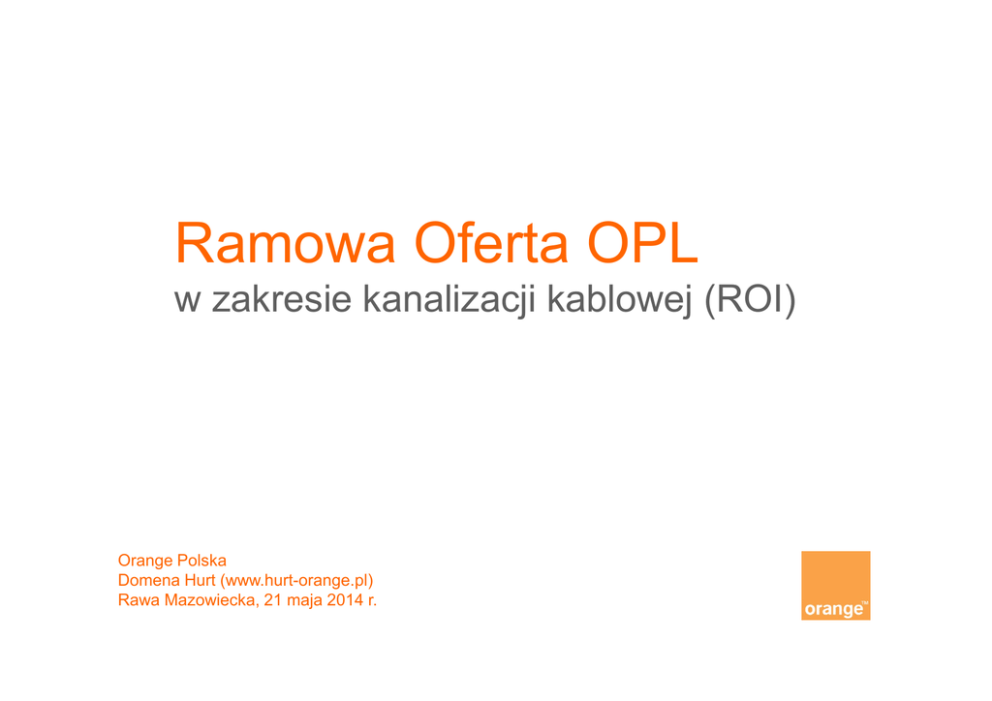 Ramowa Oferta OPL w zakresie kanalizacji kablowej (ROI) Orange Polska Domena Hurt (www.hurt-orange.pl) Rawa Mazowiecka, 21 maja 2014 r. agenda część 1 oferta ROI – kanalizacja kablowa część 2 oferta na wykonywanie projektów technicznych część 3 współpraca na partnerskich warunkach 2 część 1 oferta ROI Kanalizacja kablowa 3 Obowiązująca Oferta dostępu do Kanalizacji kablowej OPL obowiązuje od 23.11.2012 r. Oferta ROI: oferta regulowana wprowadzana decyzją Prezesa UKE aktualna Oferta ROI: „Ramowa oferta OPL o dostępie telekomunikacyjnym w części infrastruktura telekomunikacyjna w zakresie Kanalizacji kablowej” wprowadzona w życie decyzją Prezesa UKE Nr DHRT-WORK-6082-7/11(179) z dnia 23 listopada 2012 r. 4 Oferta ROI – dlaczego warto mieć najnowszą umowę? Oferta ROI 5 grupa docelowa korzyści Przyjazna przyjazna Przedsiębiorcy Telekomunikacyjni atrakcyjna cena Oferta jest wynikiem wynik warsztatów z OA warsztatów z OA Jednostki Samorządu Terytorialnego doświadczenie OPL we współpracy z OA uwzględnia Zawiera większość większość wniosków OA ogólnopolska dostępność Ułatwia ułatwia współpracę wielkość infrastruktury oferta = wzór umowy Oferta ROI – dlaczego warto mieć najnowszą umowę? udogodnienia • • nowy, bardziej przejrzysty wzór zapytania sprecyzowane warunki wydania WT (np. lista przyczyn negatywnych WT) • brak reasumpcji – wystarczy akceptacja rozwiązania alternatywnego • możliwości dodatkowego okresu rezerwacji zasobów gwarancja wysokiej jakości wieloletnie doświadczenie we współpracy OPL i operatorów atrakcyjna cenowo • 6 zmniejszona liczba egzemplarzy projektów technicznych • możliwość jednostronnego podpisania PZO • czas na zawarcie umowy wynosi 5 DR oferta nie zmieniła dotychczasowych opłat za usługę przebieg zamówienia 1 2 zawarcie umowy ramowej • OPL przesyła umowę w 5 DR od złożenia wniosku złożenie zapytania • operator składa zapytanie na daną relację OA 3 4 5 6 7 opracowanie WT • OPL opracowuje warunki techniczne w 10 DR od otrzymania zapytania przygotowanie projektu technicznego • operator przygotowuje i akceptuje projekt techniczny operator może zlecić OPL przygotowanie projektu technicznego zawarcie umowy szczegółowej przekazanie kanalizacji (PZO) • OA • po akceptacji projektu technicznego zawierana jest umowa szczegółowa OA • OPL przekazuje przedmiot obustronnie podpisanej umowy szczegółowej do 14 DR po dokonaniu przekazania operator może dokonać zaciągu OA • DRPU – szczególny rodzaj dostępu do kanalizacji DRPU - Dzierżawa na potrzeby Realizacji Programów Unijnych szczególny rodzaj długookresowej dzierżawy kanalizacji kablowej OPL udostępnianej operatorowi/JST na potrzeby realizacji projektów finansowanych w całości lub w części ze środków publicznych w ramach programów operacyjnych lub innych podobnych programów czas trwania umowy szczegółowej: 15 – 25 lat sposób płatności - opłata jednorazowa płatna z góry 8 część 2 oferta na wykonywanie projektów technicznych 9 OPL wykona projekt techniczny ROI Telehousing PRO ułożenie własnego kabla (kabli telekomunikacyjnych) handlowa nazwa udostępniania powierzchni technicznej operatorom ułożenie własnej kanalizacji wtórnej połączenia: do platformy TPIX, pakietowej transmisja danych, dzierżawy łączy telekomunikacyjnych do sieci OPL (usługi regulowane) pomiędzy urządzeniami operatorów 10 Kolokacja handlowa nazwa usługi udostępnienia powierzchni technicznej operatorom instalacja urządzeń służących do realizacji usług regulowanych opisanych w SOR (IC, LLU, BSA, WLR, NP) oraz w RLLO Jakie korzyści ze współpracy z nami? oferta jest elastyczna wykonany projekt techniczny posiada już akceptację OPL możliwość realizacji dla obiektów OPL na terenie całej Polski oszczędność czasu na szukanie profesjonalnej firmy ROI Projekt Techniczny Telehousing PRO Kolokacja gwarancja wysokiej jakości wysoka jakość wykonanego projektu technicznego wieloletnie doświadczenie 11 atrakcyjna cenowo zawsze w korzystnej cenie dla nowej usługi jak i dla zmian w istniejącej już usłudze część 3 współpraca na partnerskich warunkach 12 Orange chce dzierżawić infrastrukturę od innych operatorów oraz JST kanały kontaktowe [email protected] selektywne lokowanie kapitału oraz wykorzystanie istniejącej infrastruktury we współpracy z innymi podmiotami jest fundamentem rozwoju rynku telekomunikacyjnego w Polsce jesteśmy zainteresowani głównie współpracą w zakresie tzw. „ostatniej mili” w przypadkach, w których istniejąca infrastruktura OPL nie pozwala na świadczenie usług dla klienta końcowego 13 Orange Polska S.A Rynek Klientów-Operatorów Realizacja Usług Wydział Realizacji Inwestycji Al. Jerozolimskie 160 02-326 Warszawa rodzaje infrastruktury kanalizacja włókna światłowodowe kable miedziane nie wykluczamy możliwości zakupu usług transmisji danych współpraca z OA w ramach usługi ROI według zasady – „Pierwsza Umowa – potem zaciąg” kanały kontaktowe w lipcu 2013r. OPL przeprowadziła akcję informacyjną do operatorów o podjęciu działań monitorujących i weryfikujących zgodność prac na sieci OPL z wymogami OR zgłoszenie przez OA zaciągniętego lub podwieszonego kabla bez umowy pozwoli uregulować jego status bez konieczności usunięcia go z infrastruktury OPL [email protected] Orange Polska S.A Rynek Klientów-Operatorów Realizacja Usług Al. Jerozolimskie 160 02-326 Warszawa rodzaje infrastruktury kanalizacja słupy 14 informacje szczegóły ofert dostępne są na stronie: www.hurt-orange.pl pierwszy kontakt: Sprzedaż[email protected] Infolinia dla Operatorów: 19 333 15 dziękujemy