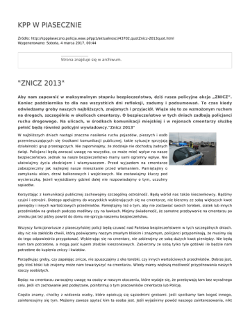 KPP W PIASECZNIE Źródło: http://kpppiaseczno.policja.waw.pl/pp1/aktualnosci/43702,quotZnicz-2013quot.html Wygenerowano: Sobota, 4 marca 2017, 00:44 Strona znajduje się w archiwum. "ZNICZ 2013" Aby nam zapewnić w maksymalnym stopniu bezpieczeństwo, dziś rusza policyjna akcja „ZNICZ”. Koniec października to dla nas wszystkich dni refleksji, zadumy i podsumowań. To czas kiedy odwiedzamy groby naszych najbliższych, znajomych i przyjaciół. Wiąże się to ze wzmożonym ruchem na drogach, szczególnie w okolicach cmentarzy. O bezpieczeństwo w tych dniach zadbają policjanci ruchu drogowego. Na ulicach, w środkach komunikacji miejskiej i w rejonach cmentarzy służbę pełnić będą również policyjni wywiadowcy."Znicz 2013" W najbliższych dniach nastąpi znaczne nasilenie ruchu pojazdów, pieszych i osób przemieszczających się środkami komunikacji publicznej, takie sytuacje sprzyjają działalności grup przestępczych. Nie zapominajmy, że złodzieje nie obchodzą żadnych świąt. Policjanci będą zwracać uwagę na wszystko, co może mieć wpływ na nasze bezpieczeństwo. Jednak na nasze bezpieczeństwo mamy sami ogromny wpływ. Nie ułatwiajmy życia złodziejom i włamywaczom. Przed wyjazdem na cmentarze zabezpieczmy jak najlepiej nasze mieszkanie przed włamaniem. Pamiętajmy o zamykaniu okien, drzwi balkonowych i wejściowych. Nie zostawiajmy kluczy pod wycieraczką. Jeżeli wyjeżdżamy gdzieś dalej nie rozpowiadajmy o tym, uczulmy sąsiadów. Korzystając z komunikacji publicznej zachowajmy szczególną ostrożność. Będą wśród nas także kieszonkowcy. Bądźmy czujni i ostrożni. Dlatego apelujemy do wszystkich wybierających się na cmentarze, nie bierzmy ze sobą większych kwot pieniędzy i innych wartościowych przedmiotów. Pamiętajmy też o tym, aby nie zostawiać swoich torebek, siatek lub innych przedmiotów na grobach podczas modlitwy czy na ławkach. Miejmy świadomość, że samotne przebywanie na cmentarzu po zmroku jak też późny powrót do domu nie sprzyja naszemu bezpieczeństwu. Wszyscy funkcjonariusze z piaseczyńskiej policji będą czuwać nad Państwa bezpieczeństwem w tych szczególnych dniach. Aby nic nie zakłóciło chwili, którą poświęcamy naszym zmarłym bliskim i znajomym, policjanci przypominają, że musimy się do tego odpowiednio przygotować. Wybierając się na cmentarz, nie zabierajmy ze sobą dużych kwot pieniędzy. Nie będą nam tam potrzebne, a mogą paść łupem złodziei kieszonkowych. Zabierzmy ze sobą tylko tyle gotówki ile będzie nam potrzebne do kupienia zniczy i kwiatów. Porządkując groby, czy zapalając znicze, nie spuszczajmy z oka torebki, czy innych wartościowych przedmiotów. Dobrze jest, gdy ktoś bliski lub znajomy może nam towarzyszyć na cmentarzu. Wtedy mamy większą możliwość przypilnowania naszych rzeczy osobistych. Będąc na cmentarzu zwracajmy uwagę na osoby w naszym otoczeniu, które wydaje się, że przebywają tam bez wyraźnego celu. Jeśli ich zachowanie jest podejrzane, poinformuj o tym pracowników cmentarza lub Policję. Często znamy, choćby z widzenia osoby, które opiekują się sąsiednimi grobami. Jeśli spotkamy tam kogoś innego, zainteresujmy się tym. Możemy zawsze spytać kim ta osoba jest. Jeśli wyjaśnimy powód naszego zainteresowania, nikt zapewne nie będzie miał nam tego za złe. Należy pamiętać o tym, aby pieniądze, dokumenty czy telefon komórkowy, w miarę możliwości trzymać w wewnętrznej kieszeni ubrania. Na pewno utrudnimy w ten sposób złodziejowi ewentualną próbę kradzieży. Na cmentarzu często spotykamy się z krewnymi czy znajomymi. Nie możemy wtedy zapomnieć o dzieciach, które nam towarzyszą. Dzieci nie zawsze są zainteresowane naszymi rozmowami – szukają sobie w tym czasie innych zajęć. Chwila nieuwagi wystarczy aby w tłoku, wśród grobów dziecko się zgubiło. Często wyjeżdżamy w odległe rejony kraju, ale także i na miejscowe nekropolie. Duże natężenie ruchu i utrudnienia, wynikające z wprowadzonych okresowo zmian organizacji ruchu drogowego, często trudne warunki pogodowe to także sytuacje, z którymi musimy się w tym czasie zmierzyć. Przed wyjazdem należy sprawdzić stan techniczny samochodu, aby uniknąć w trasie niespodziewanych problemów. Apelujemy do kierowców o dostosowanie prędkości do warunków panujący na drogach, zachowanie bezpiecznej odległości między pojazdami. Nie zapominajmy także o pasach bezpieczeństwa i fotelikach do bezpiecznego przewożenia dzieci. Nie zostawiajmy w samochodzie na siedzeniach rzeczy wartościowych, aby nie narazić się na wybicie szyby i kradzież. Po żadnym pozorem nie wsiadajmy do samochodu po spożyciu alkoholu. Aby bezpiecznie dojechać do cmentarza, stosujmy się do poleceń funkcjonariuszy Policji, którzy podczas święta będą we wszystkich newralgicznych dla ruchu miejscach. Wysiłki Policji na rzecz poprawy bezpieczeństwa nie słabną, jednak to na kierowcach w dużej mierze spoczywa odpowiedzialność za bezpieczne podróżowanie. hkk Ocena: 0/5 (0) Tweetnij