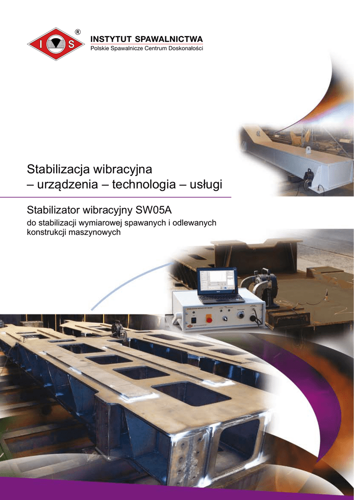 INSTYTUT SPAWALNICTWA Polskie Spawalnicze Centrum Doskonałości Stabilizacja wibracyjna – urządzenia – technologia – usługi Stabilizator wibracyjny SW05A do stabilizacji wymiarowej spawanych i odlewanych konstrukcji maszynowych Stabilizacja wibracyjna zastępuje energochłonne i czasochłonne wyżarzanie odprężające konstrukcji spawanych i odlewanych, którego celem jest eliminacja odkształceń zwłocznych, powodujących niedopuszczalne błędy kształtu, narastające w długim czasie po obróbce. W efekcie stosowania zabiegów wibracji uzyskuje się stabilność wymiarową, zbliżoną do stabilności osiąganej w rezultacie sezonowania naturalnego lub wyżarzania odprężającego. Wykorzystanie metody stabilizacji wibracyjnej umożliwia obniżenie kosztów produkcji o ok. 70%. Dzięki stabilizacji wibracyjnej: ● oszczędza się czas (do 80%) i energię (do 90%) ● nie ma konieczności utrzymywania kosztownych pieców ● po zabiegu nie występuje zgorzelina ● nie ma konieczności transportu konstrukcji. Najlepsze wyniki w postaci stabilności wymiarowej uzyskuje się w przypadku konstrukcji maszynowych, takich jak: SW03 200 Hz SW02 100 Hz ● korpusy przekładni ● podstawy maszyn ● podstawy zespołów napędowych ● korpusy silników elektrycznych i generatorów ● lementy maszyn hutniczych: e – manipulatory walcownicze – elementy samotoków – ramy oraz belki nośne maszyn do obróbki skrawaniem – wieńce kół zębatych dużych i średnich mocy itd. Skuteczność stabilizacji wibracyjnej zależy od gatunku materiału, z jakiego jest wykonana konstrukcja. Najlepsze efekty uzyskuje się w przypadku następujących materiałów: ● Stabilizator wibracyjny SW05A ● Stabilizator jest napędzany silnikiem indukcyjnym, zasilanym z sieci jednofazowej 230 V. ● Jest przeznaczony do stabilizacji konstrukcji o masie do 30 ton. Maksymalna częstotliwość drgań wymuszonych wynosi 100 Hz (motowibrator SW02) i 200 Hz (motowibrator SW03). System może pracować w trybie ręcznym i automatycznym z możliwością zapisu i drukowania parametrów zabiegu. s tali niskowęglowych i niskostopowych o podwyższonych własnościach wytrzymałościowych s tali do ulepszania cieplnego (hartowania i odpuszczania) s tali stopowych: – martenzytycznych – ferrytycznych – austenitycznych – żeliwa konstrukcyjnego. Usługi Instytut Spawalnictwa oferuje urządzenia wraz z technologią lub świadczy usługi stabilizacji w Instytucie lub u klienta. Wydanie II, 2015 r. ul. Bł. Czesława 16 –18 44-100 Gliwice tel. 32 231 00 11 fax 32 231 46 52 e-mail: [email protected] www.is.gliwice.pl AKCEPT-ART®, tel. 32 204 32 75 INSTYTUT SPAWALNICTWA