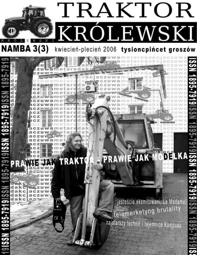 kierownitza traktore’u wstępniakung Agent Służb Specjalnych Ortografii Zosia Bluszcz (Polonizofia i Filostyka) Jego Łosiowatość Naczelnik Marcin Trepczyński (prawienie i filozowanie) Kochani mieszkańcy Traktu, Nadciągnęła wiosna, potknęła się o prima aprilis (wg pewnego artykułu Skamandrytów* „prima znaczy po łacinie dzień, aprilis – bzdura”) i teraz turlać się będzie rozpędzona, tchnąc w nas i w świat życie i radość. Również Traktor nie przejechał obojętnie wobec dnia eksplozji czczego rechotu i rubasznych wrzasków „Prima aprilis!” (co wg Skamandrytów** „po łacinie znaczy: Oszukałem cię (Prima – oszuka, aprilis – łemcię”). Stąd znajdziecie w numerze piękny artykuł mgr Grześczak o tradycji tego dnia. Nie znajdziecie jednak na naszych łamach tego bezwstydnego absurdu, o zniewolenie którym niektórzy oskarżają Traktora, wywołując uniesienie w lekkim zdziwieniu lewej brwi Naczelnika oraz jego szczerą radość. (Idealne dla nich rozwiązanie, czyli zaznaczanie gwiazdkami niepoważnych tekstów, odkładamy chwilowo na później.) Ale wróćmy do merytum, do adremu, czy innych esencjaliów. Direktorr Art., dumny autor okładki Maciey Gnyszka (Arkitekstura) Po raz trzeci już, drodzy obywatele Traktu, odurzające nas słodko w słoneczne dni kolory zdejmujemy z naszego świata, by naszą białoczarną gazetą pokazać jego prawdziwą barwność – pulsującą, żywą, niezniszczalną, ale najczęściej niezauważaną. Znów z miłością zanurzyliśmy się w Trakt, patrzyliśmy, słuchaliśmy, rozmawialiśmy, zachwycaliśmy się, na koniec wróciliśmy zmęczeni i upojeni, by nieść wam na wyciągniętych dłoniach tę esencję ubraną w formy. Abyście znowu dowiadywali się o tym, co dzieje się w sąsiednich budynkach, co myślą i czym żyją mijani ludzie, co powstaje obok, tonąc jednak w braku informacji, i kim jesteśmy my – mieszkańcy Traktu. Tym razem poznacie Pana Andrzeja, który opowie o swojej ukrytej między budynkami stolarni i o tajemnicach Kampusu. Powiemy wam o slajdowiskach na geografii i o działalności Domu Spotkań z Historią. Zaprezentuje się również Mariusz Drozdowski, nasz brat w wierze, i opowie o miesięczniku, który wydaje na socjologii. W ramach nowego cyklu, w którym piszemy o naszych pełnych osobliwości budynkach wydziałowych, przeczytacie o polonistyce. Będą krytyczne analizy nas samych oraz wydarzenia, jakim była konferencja na SWPS „Mózg a dusza”, które przyciągnęło również naszych ludzi. Będzie masa innych ciekawych lub radosnych tekstów. Przede wszystkim jednak umieszczamy w tym numerze pełen informacji artykuł Marcina Dudy o rzeczywistości telemarketingowej oraz teksty traktujące o wydarzeniach, które w ubiegłym tygodniu kazały ludziom z Traktu wędrować na Koźlą, czyli okupacja i zaspawanie Le Madame. Groźny Borsuk (d. Wstydliwy Waran) Mikołaj Magnuski jako Wesoły Pan Zdzisław 2 Jest co czytać Naczelnik * Dzień Próby, Przegląd Przedwieczorny, 1 kwietnia 1925 r., pod red. Lechonia, Słonimskiego i Tuwima ** tamże Kopara opada Na skutek destruktywnych i złośliwych działań sprzymierzonych sił obcych wywiadów utraciliśmy fotografie, które pierwotnie przeznaczone były na okładkę. Dlatego zamiast pięknej modelki Oli oraz koparki w pełnej chwale, oglądacie za przeproszeniem tył koparki i przód Janka. Za przeproszeniem. Obok jedyne, co udało nam się zachować – miniaturki wykradzionych zdjęć. Tr a k t o r K r ó l e w s k i – m i e s i ę c z n i k s t u d e n t ó w Tr a k t u R e d a k t o r N a c z e l n y: M a r c i n T r e p c z y ń s k i m e r c y n @ o 2 . p l Ł a m a n i e: M a c i e k M a t e j e w s k i W y d a w c a: S t o w a r z y s z e n i e E t n o g r a f ó w i Antropologów Kultur y „Pasaż Antropologiczny” N a k ł a d: 3 5 0 e g z. Wa r s z a w a – Tr a k t K r ó l e w s k i – A D 2 0 0 6 spis traktorowych części: kierownica . . . . . . . . . . . . . . . . . . . . . . . . . . . 2 wstępniakung; Redakcja; kopara opada; stopka; spis części przez szyby traktora . . . . . . . . . . . . . . . . . . . . 3 cośtam na maszynie; sonda reflektorem traktora . . . . . . . . . . . . . . . . . . . . 4 O irytacji; Umysł, mózg, Kampus; Święta zasada; gwóźdź . . . . . . . . . . . . . . . . . . . . . . . . . . . . . 5 Najstarszy technik i tajemnice Kampusu traktor dojedzie wszędzie . . . . . . . . . . . . . . 6–7 Komornik vs. Le Madame; Nasze domki: Polonistyka; „Bryła ciemna…”; Kwiecista Pani; Z żucia pomników: Prus traktor w błocie sofistyki . . . . . . . . . . . . . . . 8–9 Awangardzista Niepokalanej; Rycerz postępu majdan . . . . . . . . . . . . . . . . . . . . . . . . . . . 8–9 przyczepa literacka . . . . . . . . . . . . . . . . . . . 8–9 Kometa traktor w blasku prawdy. . . . . . . . . . . . . . . . . 10 Telemarketyng brutality la gente – miesz(k)ańcy Traktu . . . . . . . . . . 11–12 Dziennikarskie solilokwium; Hobby prof. S.; WSBiL aenigma aprilis . . . . . . . . . . . . . . . . . . . . . . . 12 tractor sum! . . . . . . . . . . . . . . . . . . . . . . . . . 13 rotk-art . . . . . . . . . . . . . . . . . . . . . . . . . . . . 14 Trzeba przypominać prawdę; Tydzień mózgu co w traktora duszy gra (dział literacki) . . . . . . . . 15 O tym, gdzie…; Fragment o Honzie; Wiosenna grafomania impreza w traktorze. . . . . . . . . . . . . . . . . . . . 16 Metaredakcja; List do Redakcji; Łebus; Wiewiór Traktor Królewski, nr 3 (3) 2006 przez szyby traktora Przed nami Pascha. I co z tego? Patrz: Sonda. Ostatnie Rekolekcje: 4, 5, 6 kwietnia, Audimax, godz. 20.00 Bez wolnoœci s³owa Polak -- pies Paw³owa pod takim has³em 8 IV o 16.00 przy Metrze Centrum zaistnieje HYDE PARK organizowany przy wspó³pracy m. in. z Helsiñsk¹ Fundacj¹ Praw Cz³owieka. Poprowadzony zostanie przez Piotra Kornobisa*Dirq^Ws wys³uchaj, wypowiedz siê! Gor¹co zapraszamy! info: www.aktywacja.org *z