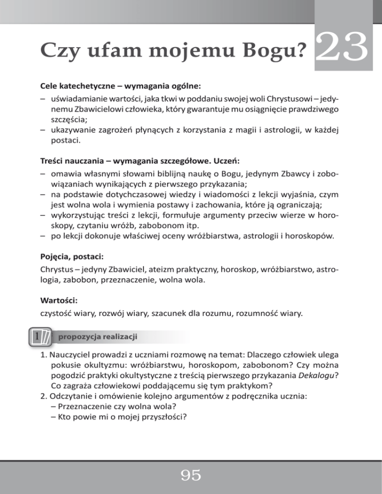 Czy ufam mojemu Bogu? 23 Cele katechetyczne – wymagania ogólne: – uświadamianie wartości, jaka tkwi w poddaniu swojej woli Chrystusowi – jedynemu Zbawicielowi człowieka, który gwarantuje mu osiągnięcie prawdziwego szczęścia; – ukazywanie zagrożeń płynących z korzystania z magii i astrologii, w każdej postaci. Treści nauczania – wymagania szczegółowe. Uczeń: – omawia własnymi słowami biblijną naukę o Bogu, jedynym Zbawcy i zobowiązaniach wynikających z pierwszego przykazania; – na podstawie dotychczasowej wiedzy i wiadomości z lekcji wyjaśnia, czym jest wolna wola i wymienia postawy i zachowania, które ją ograniczają; – wykorzystując treści z lekcji, formułuje argumenty przeciw wierze w horoskopy, czytaniu wróżb, zabobonom itp. – po lekcji dokonuje właściwej oceny wróżbiarstwa, astrologii i horoskopów. Pojęcia, postaci: Chrystus – jedyny Zbawiciel, ateizm praktyczny, horoskop, wróżbiarstwo, astrologia, zabobon, przeznaczenie, wolna wola. Wartości: czystość wiary, rozwój wiary, szacunek dla rozumu, rozumność wiary. realizacji: propozycja realizacji 1Propozycja 1. Nauczyciel prowadzi z uczniami rozmowę na temat: Dlaczego człowiek ulega pokusie okultyzmu: wróżbiarstwu, horoskopom, zabobonom? Czy można pogodzić praktyki okultystyczne z treścią pierwszego przykazania Dekalogu? Co zagraża człowiekowi poddającemu się tym praktykom? 2. Odczytanie i omówienie kolejno argumentów z podręcznika ucznia: – Przeznaczenie czy wolna wola? – Kto powie mi o mojej przyszłości? 95 3. Nauczyciel podsumowując dyskusję, wyjaśnia uczniom, dlaczego zajmowanie się wróżbiarstwem, przepowiedniami, astrologią i horoskopami, spirytyzmem, itp. jest grzechem i jakie zagrożenia z tego wypływają. 4. Jeżeli czas lekcji na to pozwoli, można rozszerzyć informacje podawane uczniom na temat horoskopów, korzystając z książki A. Wronka, Magia, wróżby, opętanie. Publikacja z serii: Kto myśli nie błądzi!, nr 1, s. 11–16. Gdyby było zbyt mało czasu, nauczyciel powinien przejść do omówienia tekstów biblijnych. 5. Uczniowie odczytują fragmenty Pisma Świętego (Iz 43, 10–11 i Dz 4, 10–12). Na podstawie odczytanych fragmentów katecheta wyjaśnia, że to Jezus jest jedynym Zbawicielem i tylko w Nim człowiek powinien pokładać wszystkie swoje nadzieje, Jemu ufać i wierzyć. 6. Notatka: Wróżbiarstwo, wiara w horoskopy i astrologię, posługiwanie się magią to poważne wykroczenia przeciw Bogu, ponieważ stosując te praktyki, szukamy wiedzy pochodzącej z ponadnaturalnego źródła, innego niż Bóg. Pismo Święte wyraźnie potępia wszelkiego rodzaju praktyki wróżbiarskie (por. Pwt 18, 9–12). Modlitwa Modlitwa do Ducha Świętego. propozycja pracypracy na lekcji propozycja na lekcji 3 inna 12Inna Lekcję rozpoczyna dyskusja na temat tego, co zawierają horoskopy. Nawet jeśli uczniowie nie czytują horoskopów, natrafiają na nie (np. w każdym programie telewizyjnym). Uczniowie usiłują określić, jakie błędy logiczne znajdują się w horoskopach. Wreszcie nauczyciel przechodzi do pogadanki na temat grzechu wróżbiarstwa (można posłużyć się podręcznikiem, wieloma artykułami z prasy katolickiej na ten temat, jak również tekstem biblijnym 1 Sm 28, 3–25)18. Odradza się czytania horoskopów na lekcji, nawet w celach ćwiczeniowych. Skoro mamy wykazać, że jest to grzechem, błędem pedagogicznym byłoby popełnianie go w celu ćwiczenia. Innym sposobem przeprowadzenia jednostki jest wskazanie na wydarzenia życia, jakie wiążą się ze szczególną opieką ze strony Boga. Jeśli klasa jest śmiała i uczniowie chętnie dzielą się swoimi przeżyciami, lekcja ta może się udać. Wyjście we wstępnej dyskusji od zauważenia, jak działa Bóg, stwarza możliwość ukazania, czym różni się interwencja Boga w życiu człowieka od celu, jaki niosą ze sobą horoskopy19. Tekst ten był wspomniany w kl. I przy temacie 15. Przy okazji uczniowie mogą zadawać mnóstwo pytań, np. o wywoływanie duchów, białą i czarną magię. Nie należy tych pytań pomijać. Kompetentne, a jednocześnie przystępne odpowiedzi na takie pytania znajdziemy w książkach J. Salija Szukającym drogi. Pytania nieobojętne itp. 18 19 96 W trakcie tej lekcji nauczyciel, mając świadomość, że wielu uczniów, zwłaszcza dziewcząt, uwikłanych jest w czytanie horoskopów lub astrologię, nie powinien prowadzić do składania przez nich jednoznacznych deklaracji typu: Czy zerwiesz z czytaniem horoskopów? Czy przestaniesz zajmować się bzdurami astrologicznymi? Podobnie nie należy zadawać pytania, jak często uczniowie czytają horoskopy. Raczej trzeba „rzucać słowa na wiatr”. Uczniowie sami to przemyślą i zapewne część z nich po cichu wycofa się z takich praktyk. Trzeba zostawić duży margines na działanie Boga w sumieniu konkretnego człowieka. Nauczyciel ma tylko za zadanie to sumienie obudzić. Jednostka lekcyjna rozpoczyna się w podręczniku listem, w którym przedstawiona została prawda o agresywnej promocji horoskopów i wróżbiarstwa. Od razu następuje przejście do zagadnienia, czy można takie praktyki pogodzić z wiarą. W dowodzeniu wykorzystano dwa teksty biblijne: pierwszy mówi o konieczności dawania świadectwa o Jedynym Bogu, drugi ukazuje Jezusa jako Jedynego Zbawiciela. Teksty mają prowadzić do ważnej konstatacji: Jeśli jestem wierzący, to Chrystus jest dla mnie Jedynym Zbawcą (a nie jednym z wielu). Do tego prowadzą rozważania – Bóg domaga się wyłączności, także krytyka ateizmu praktycznego, który polega na takim życiu, jakby Boga nie było. Uczniowie powinni zrozumieć, czym jest powaga wiary i uczciwość w jej wyznawaniu. Dopiero po ukazaniu problemu z punktu widzenia wiary następuje zdroworozsądkowa krytyka horoskopów i astrologii. Pod koniec lekcji, tytułem podsumowania, teksty w podręczniku odpowiadają na pytania o wolną wolę człowieka