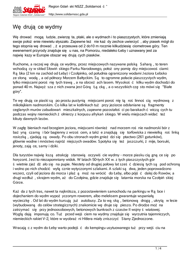 Region Gda ski NSZZ „Solidarno http://www.solidarnosc.gda.pl W druj ce wydmy W drowa mog ludzie, zwierz ta, ptaki, ale o wydmach i to piaszczystych, które zmieniaj swoje poło enie niewielu słyszało. Zapewne te nie ka dy zechce uwierzy , aby piasek mógł do tego stopnia w drowa , e przesuwa od 2 do10 m rocznie kilkudziesi ciometrowe góry. Ten ewenement przyrody znajduje si u nas, na Pomorzu, niedaleko Łeby i uznawany jest za najwi kszy w Europie obszar w druj cych piasków. Ruchome, a raczej w druj ce wydmy, przez miejscowych nazywane polsk Sahar , to teren wchodz cy w skład Słowi skiego Parku Narodowego, poło ony pomi dzy miejscowo ciami: R bka (2 km na zachód od Łeby) i Czołpinko, od południa ograniczony wodami Jeziora Łebsko ze słon wod , a od północy Morzem Bałtyckim. S to ogromne połacie piaszczystych wydm, tylko miejscami poro ni tych traw , a na obrze ach lasem. Wysoko kilku wydm dochodzi do ponad 40 m. Najwy sza z nich zwana jest Gór Ł ck , a o wszystkich cz sto mówi si "Białe góry". Te w druj ce piaski s po prostu pustyni miejscami poro ni t ro linno ci wydmow z mikołajkiem nadmorskim. Co kilka lat w kotlinkach tu przy jeziorze odsłaniane s fragmenty ceglanych murów zabudowa mieszkalnych, zapewne pozostało ci po barakach wicz cych tu podczas wojny niemieckich ołnierzy z korpusu afryka skiego. W wielu miejscach wida te kikuty dawnych lasów. W zagł bieniach nad brzegiem jeziora, miejscami równie nad morzem ro nie nadmorski bór z ba yn czarn i bór bagienny z wrzo cem, a tak e znajduj si torfowiska z niewielk ro link rosiczk , zjadaj c owady. Po obu stronach wydm gnie dzi si ptactwo (261 gatunków), głównie wodne i mnóstwo najró niejszych owadów. Spotyka si te jaszczurki, mije, borsuki, jenoty, zaj ce, sarny i dziki. Dla turystów najwi ksz atrakcj stanowi oczywi cie wydmy - morze piasku ci gn ce si po horyzont. Jest to niezapomniany widok. W latach 50-tych XX w. z tych piaszczystych gór wietnie zje d ało si na pupie. Niestety od drugiej połowy lat sze dziesi tych s pod ochron i wolno po nich chodzi wył cznie wytyczonymi szlakami. A szlaki s dwa, jeden poprowadzono wszerz, czyli od jeziora do morza i pla mo na wróci do Łeby, albo pój dalej do Rowów, a drugi wzdłu , skrajem wydm, a do Czołpina, gdzie znajduje si latarnia morska na Czołpi skiej Górze. Ka da z tych tras, nawet ta najkrótsza, z pozostawieniem samochodu na parkingu w R bce i dojechaniem do wydm wypo yczonym rowerem, albo meleksem gwarantuje wspaniał wycieczk . Od lat do wydm kursuj ju autobusy. Za to w sk , betonow drog , ukryt w lesie (wybudowan do celów strategicznych) znakomicie w druje si pieszo. Po drodze mo na zatrzyma si przy jednoosobowych, betonowych bunkrach z czasów II wojny wiatowej. Wygl daj imponuj co. Tu przed wej ciem na wydmy znajduje si wyrzutnia tajemniczych, niemieckich rakiet V-2, które w wyobra ni Hitlera miały zniszczy Stany Zjednoczone. Wracaj c z wydm do Łeby warto podej do kempingu usytuowanego tu przy wej ciu na 1/4 Region Gda ski NSZZ „Solidarno http://www.solidarnosc.gda.pl zachodni pla . Zaraz za płotem kempingu, na przeciw parkingu, gdzie w czasie wojny znajdowała si wyrzutnia rakiet V-1, prowadzi do sosnowego lasu znakowana cie ka. Po kilkudziesi ciu metrach dochodzi si ni do ruin najstarszego w Łebie zabytku - fragmentu XIVwiecznego, gotyckiego ko cioła p.w. w. Marcina. Otó redniowieczna Łeba, rybacka osada Kaszubów le ała nad samym morzem. W 1357 r. uzyskała prawa miejskie. Dwie cie lat pó niej miasto zostało przeniesione w gł b l du, bowiem w połowie XVI w. z powodu naporu w druj cych wydm i niszcz cego działania sztormów stare miasto zostało zatopione i zasypane. Jedyny relikt z tamtych czasów to fragment owego ko cioła. Kiedy ludzie przenie li swoje domostwa na południe wydmy pow drowały sobie na zachód. A w Łebie, ju w naszych czasach utworzono ksi stwo, którym przez pewien czas rz dziły kobiety, ale to zupełnie inna opowie . Tekst i zdj cia Maria Giedz 2/4 Region Gda ski NSZZ „Solidarno http://www.solidarnosc.gda.pl 3/4 Region Gda ski NSZZ „Solidarno http://www.solidarnosc.gda.pl 4/4 Powered by TCPDF (www.tcpdf.org)